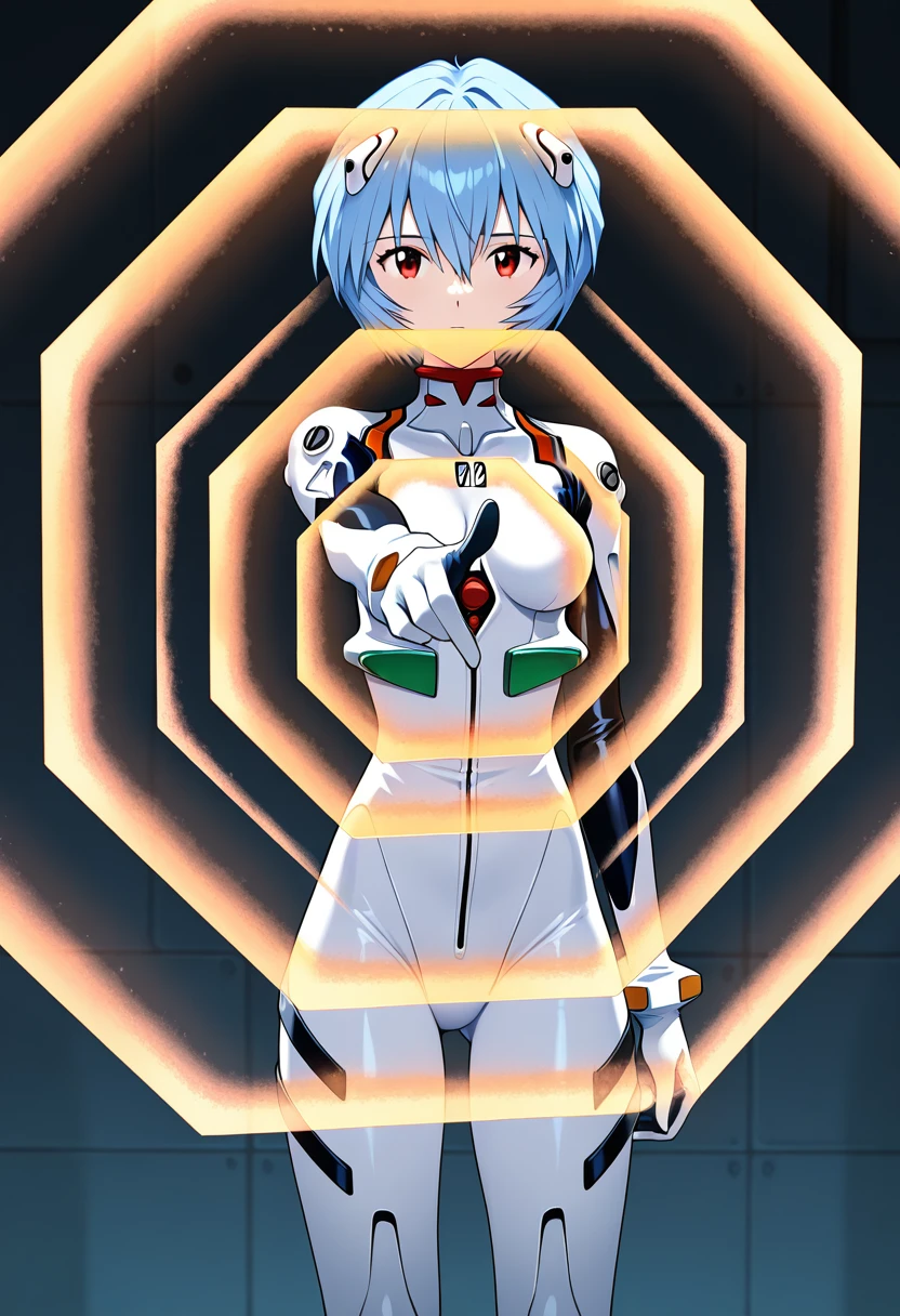 Trigger : atfield to front, energy barrier, transparent barrier, atfield in front of the charanter, character_partially_occluded, octagonal pattern,