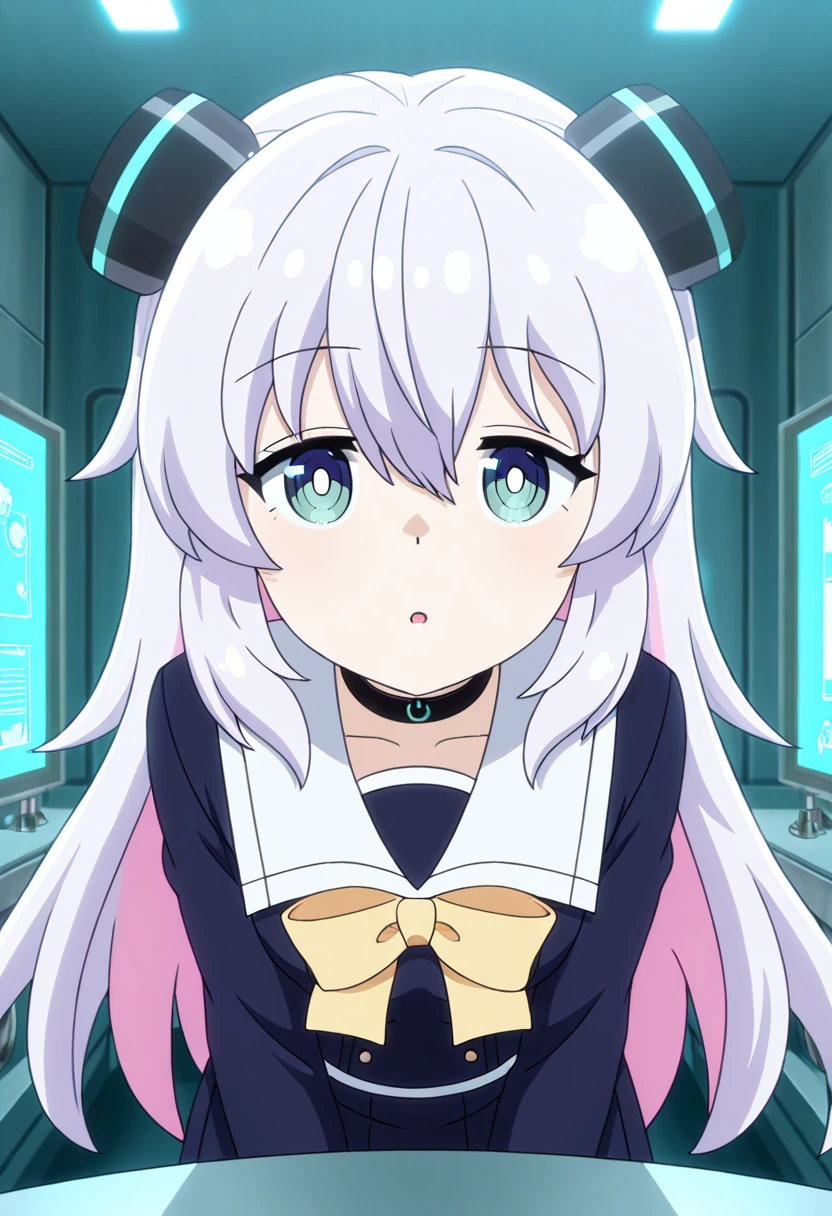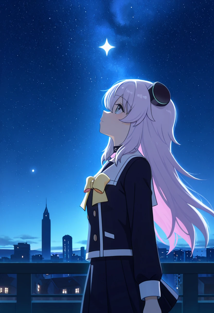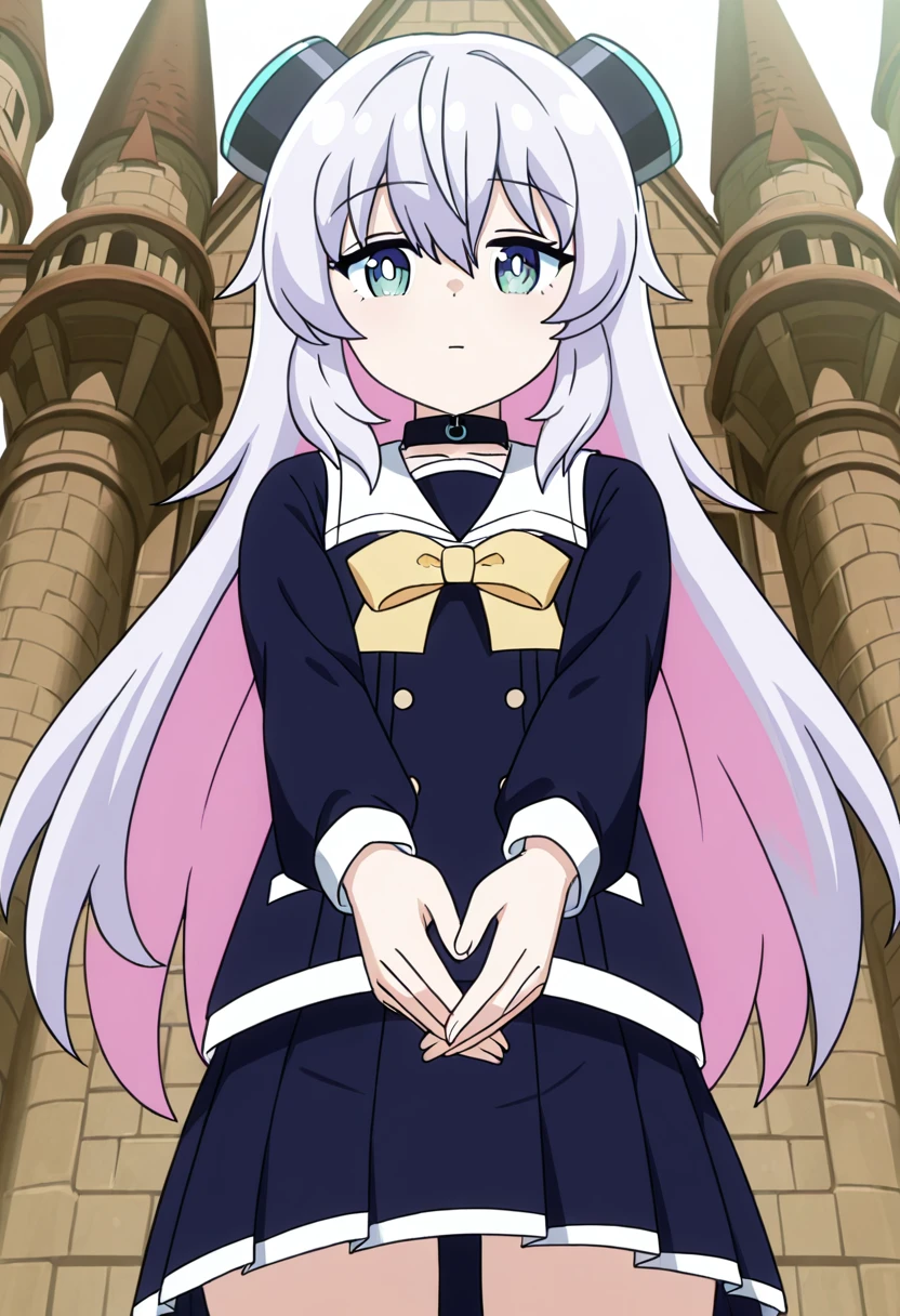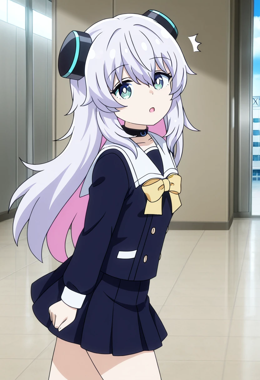 Clothing: school uniform, white sailor collar, headgear, hair ornament, choker, yellow bow, black skirt