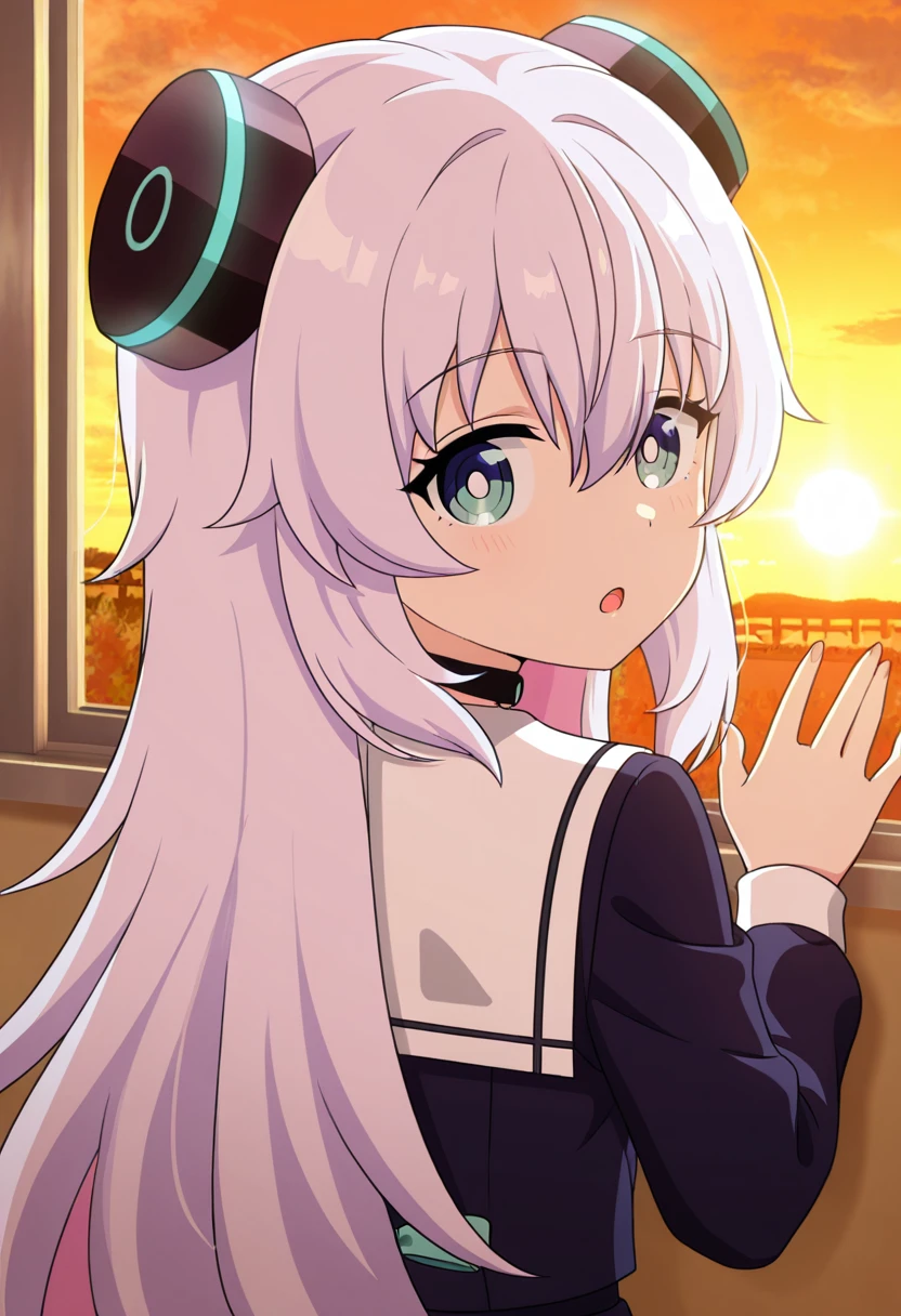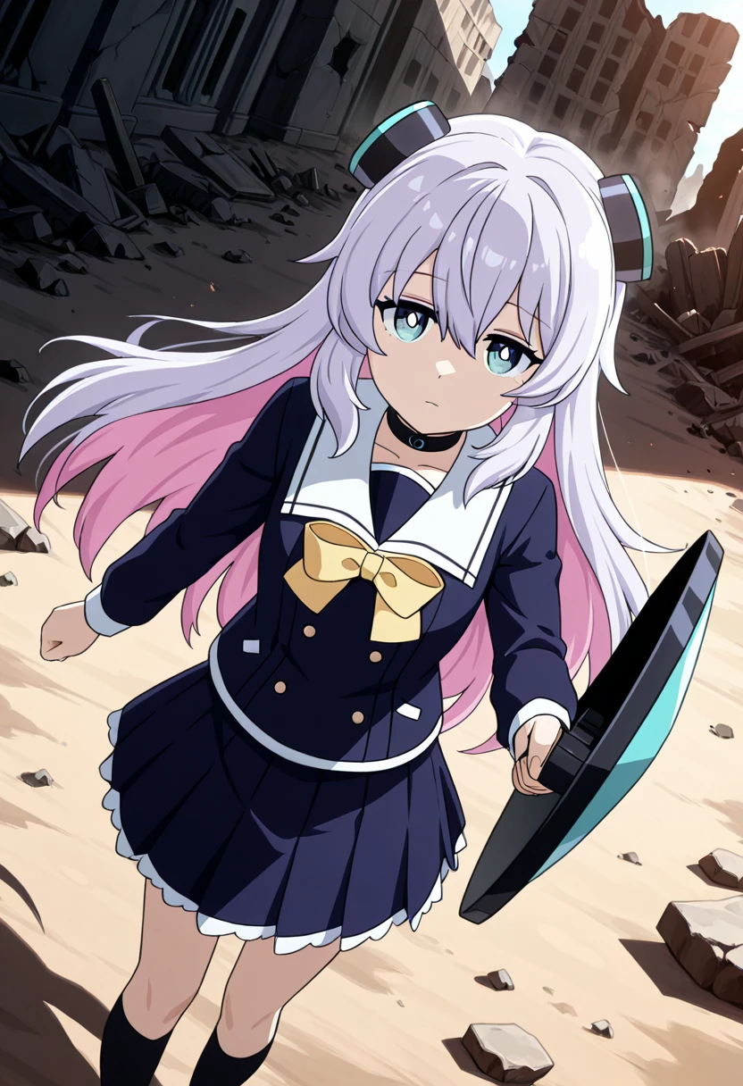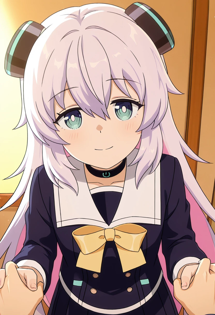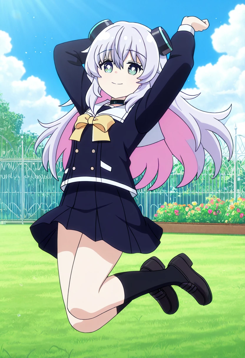 Clothing: school uniform, white sailor collar, headgear, hair ornament, choker, yellow bow, black skirt