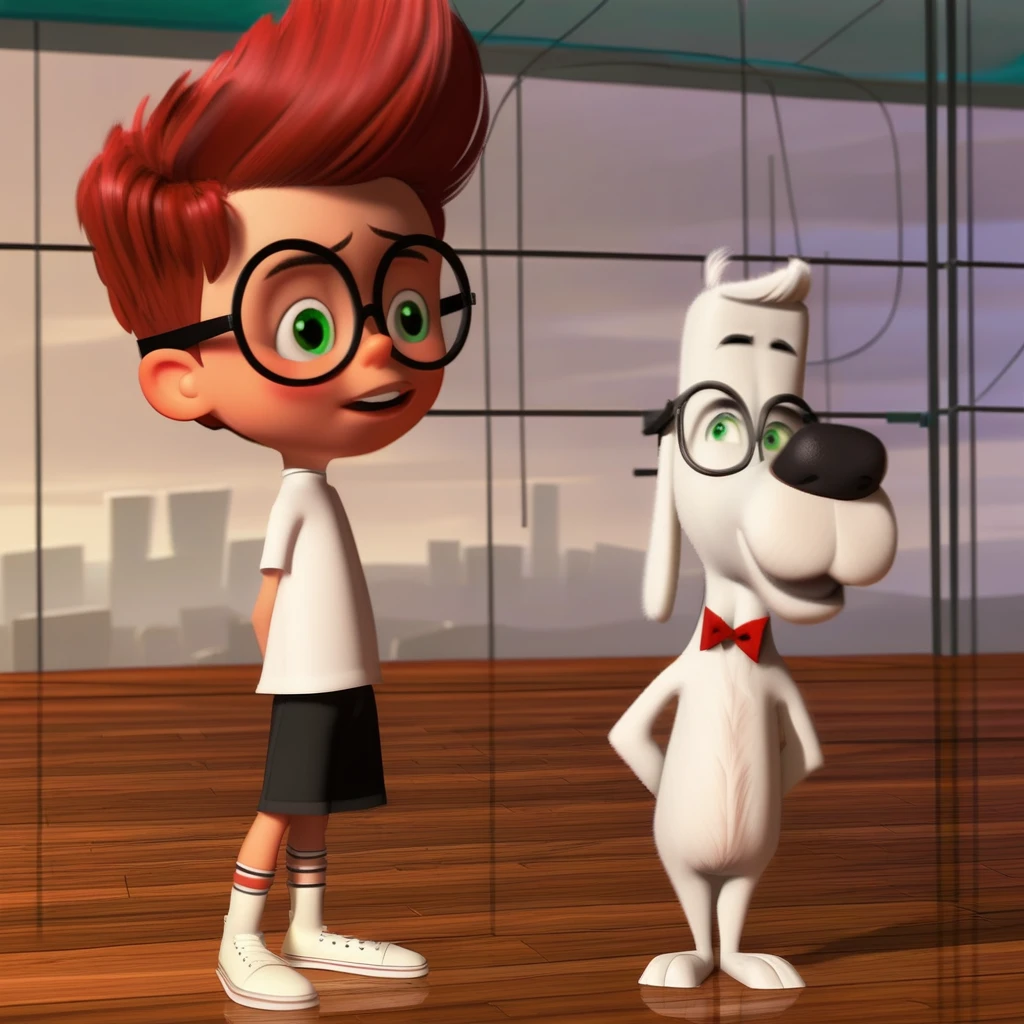 1dog, male dog, Mr.Peabody, white fur, black nose, black eyebrows, green eyes, black circular glasses, red bowtie