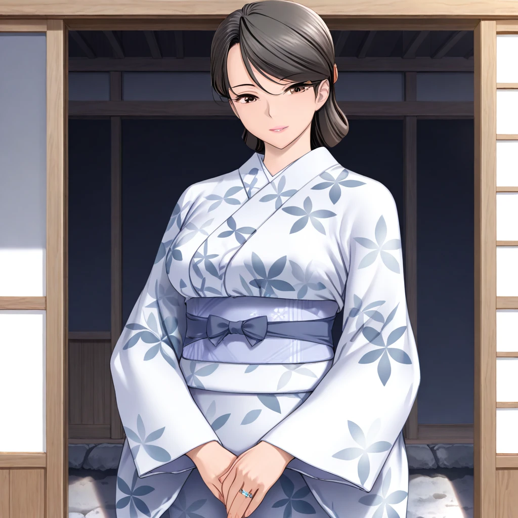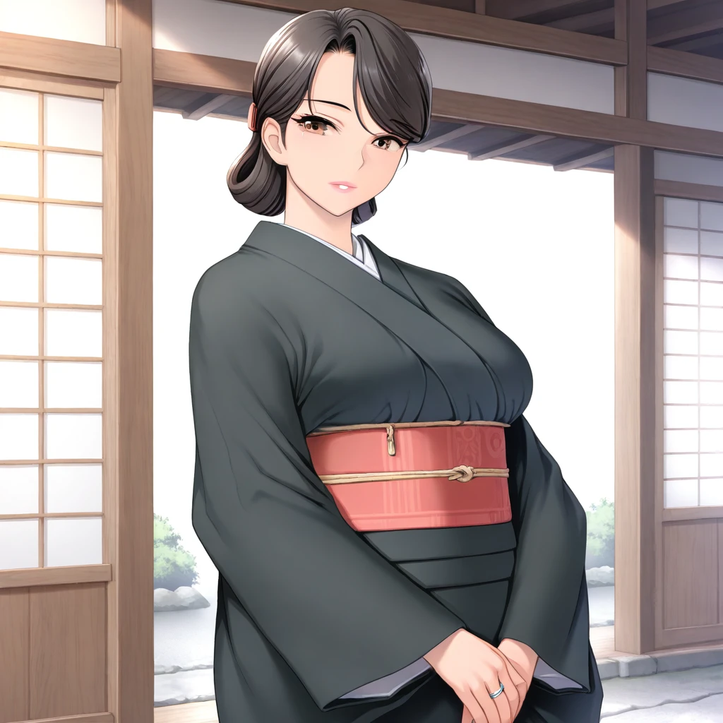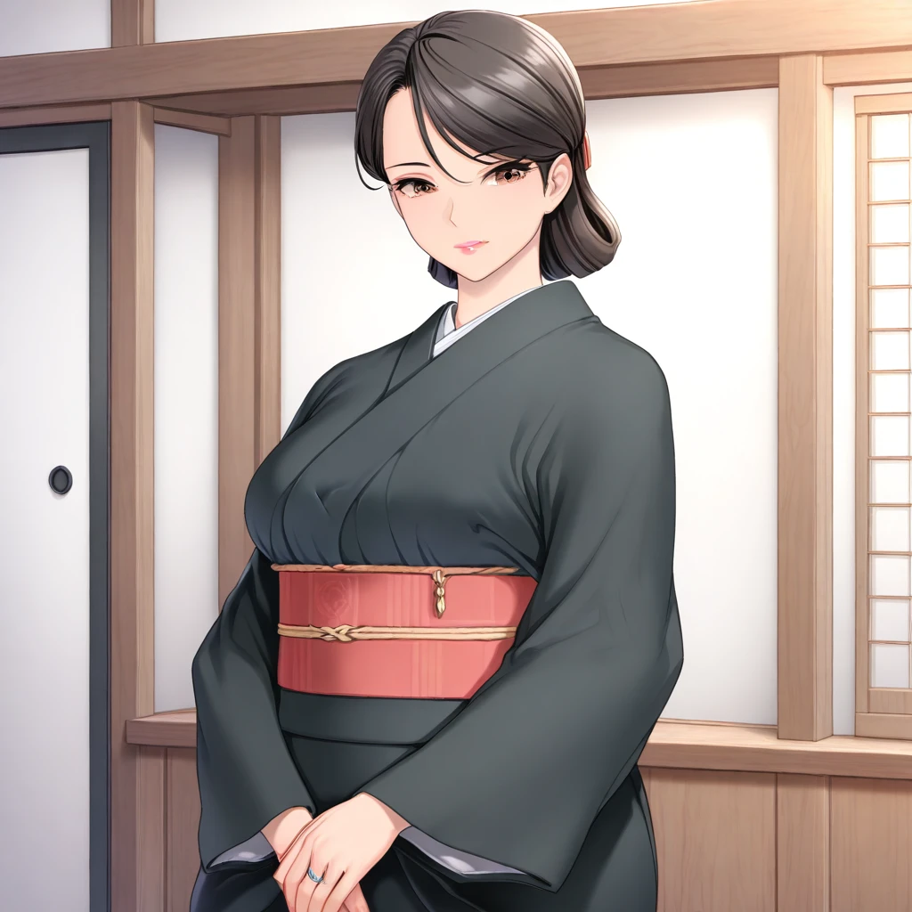 fuyou_suzuka, mature female, lipstick, brown eyes, black hair, folded ponytail, hairpin,