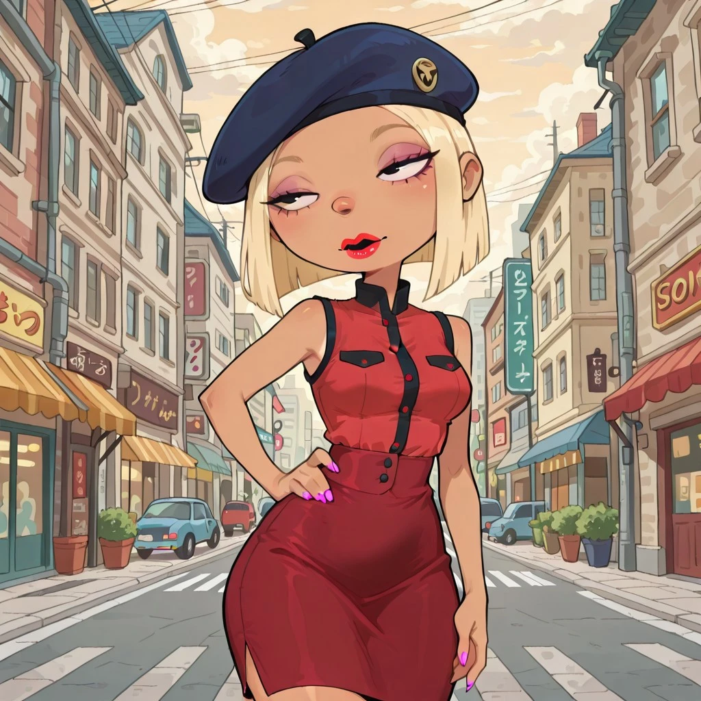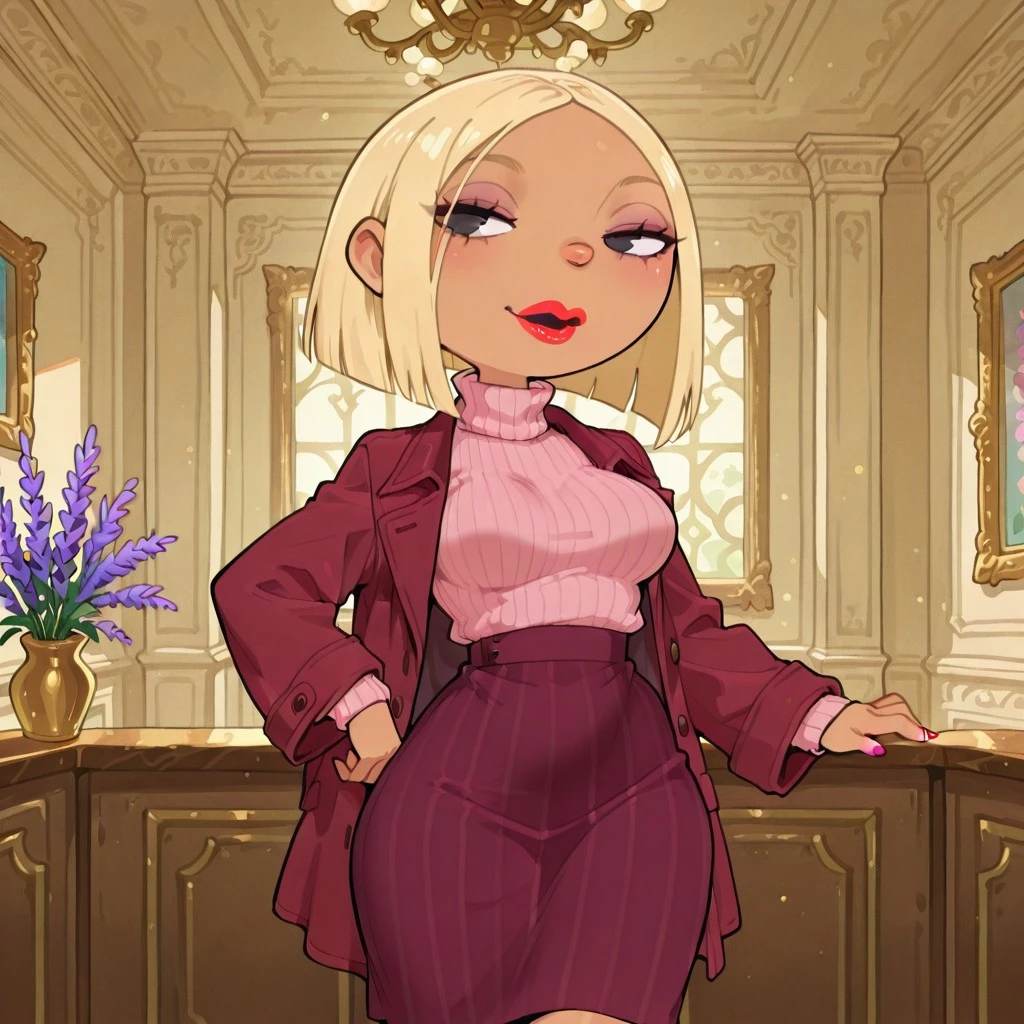 solo female, curvy, breasts, blonde bob hair, round nose, red lipstick, tan color skin, light skin, pink nails, black eyes,