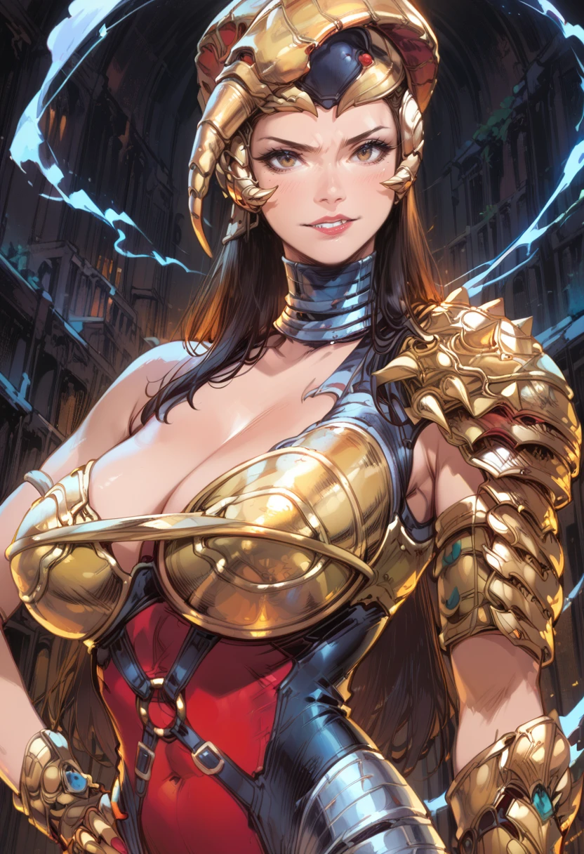Tags (clothes): gold armor, single gold gauntlet, gold thigh boots, single gold gauntlet, yellow thighhighs, silver bracelet,