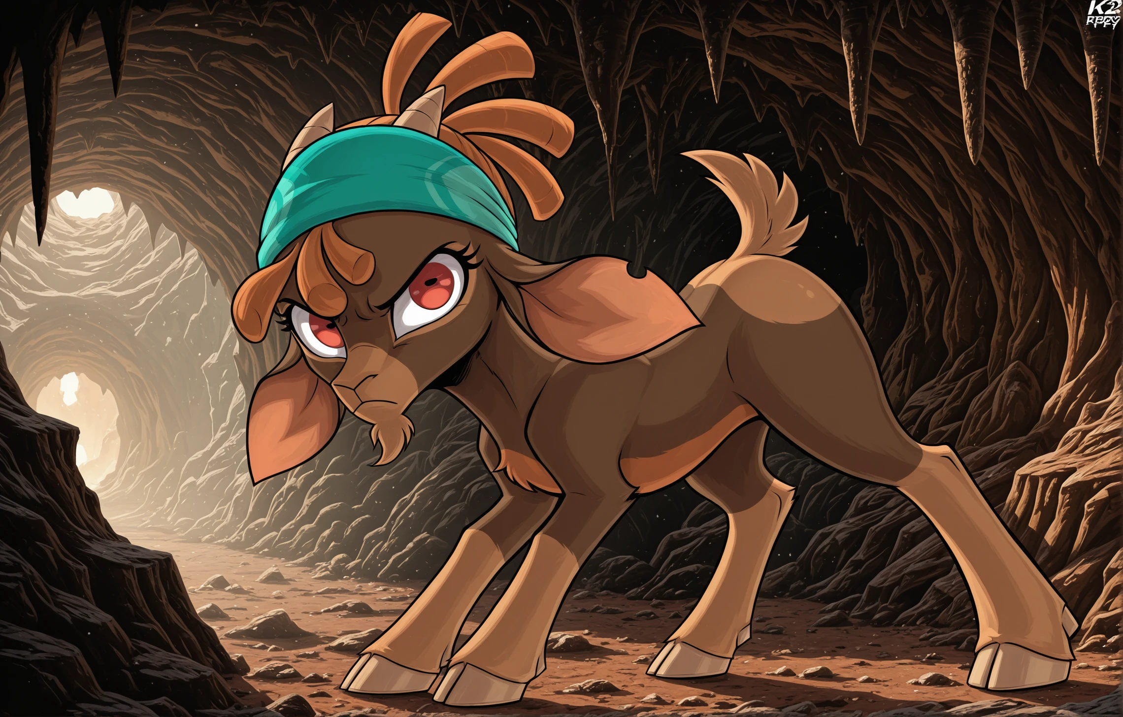 k23rg shanty tfh, goat, red eyes, bandana, hooves, brown body, fur, tail, brown fur, cloven hooves, orange hair, tan body
