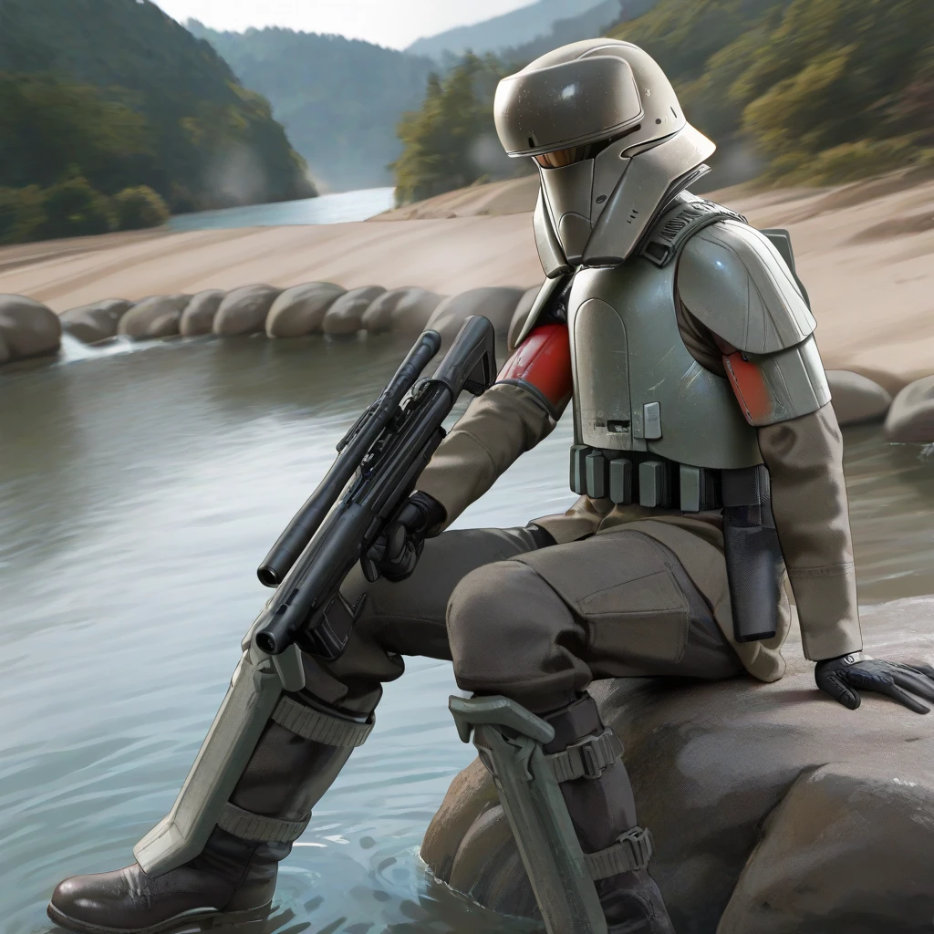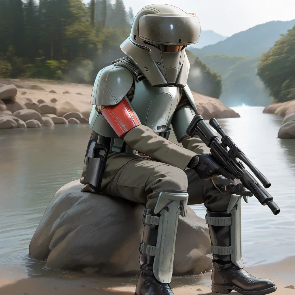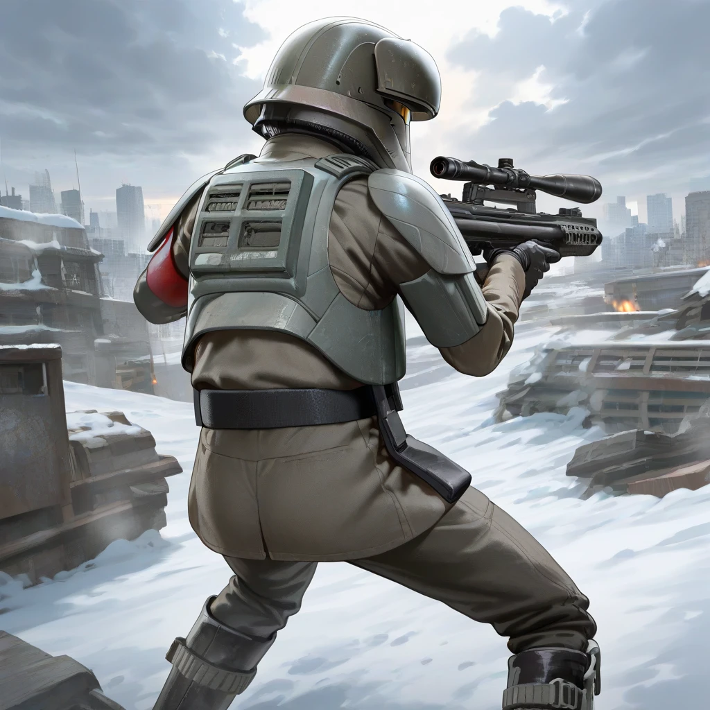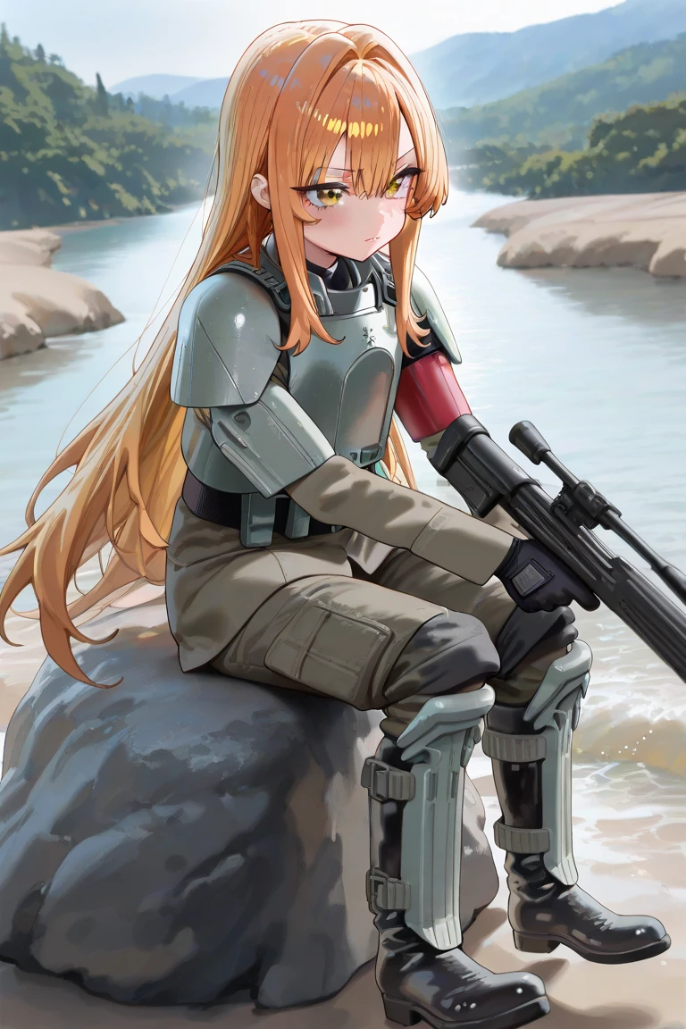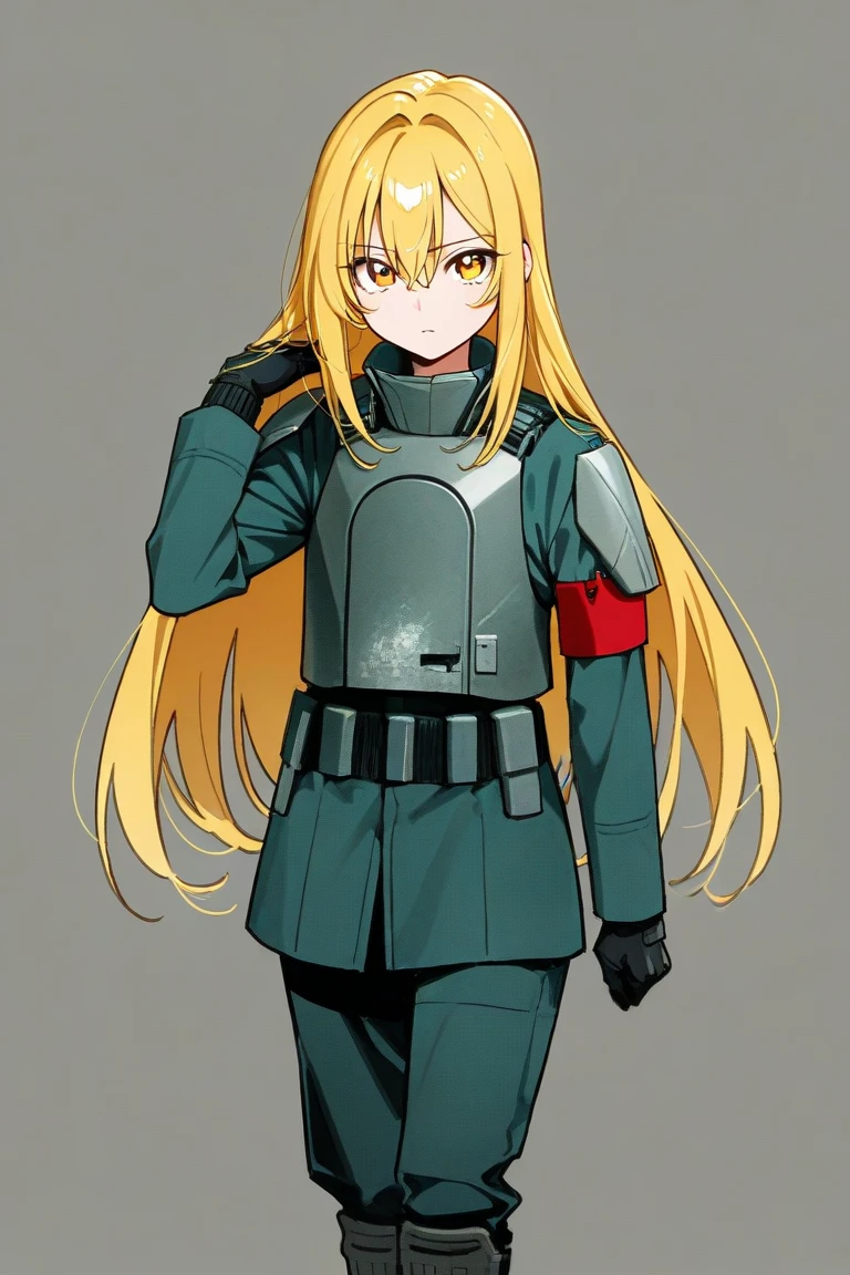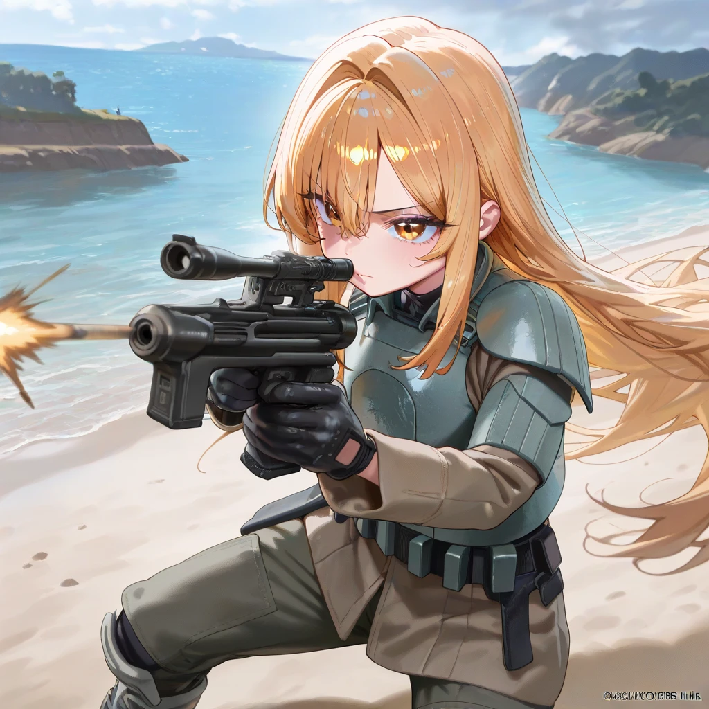 <Armor>, olive green jacket, armored jacket, olive green pants, protection, shoulder pads, tactical gloves, tactical belt, knee pads, boots, helmet, pistol.
