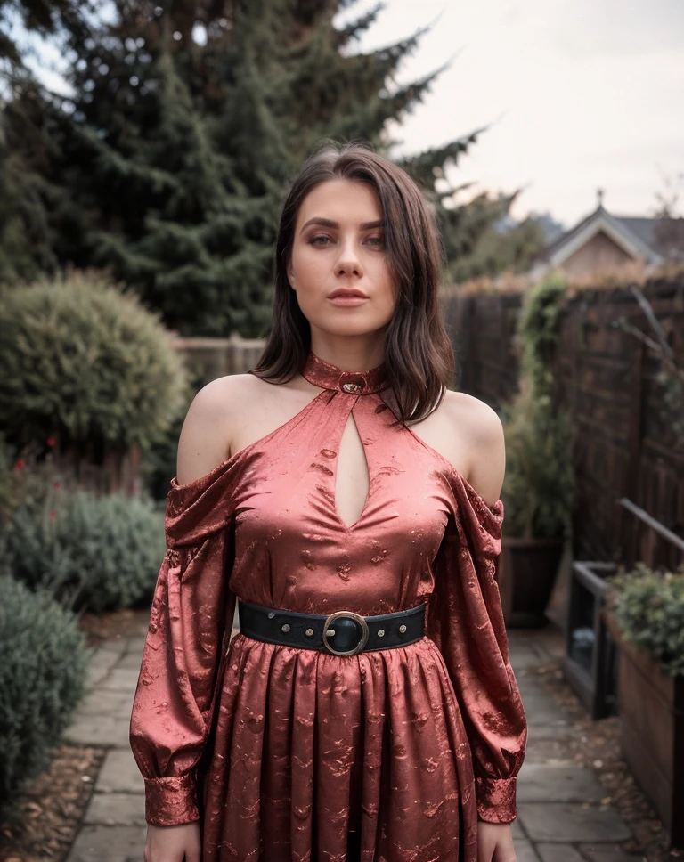 cinematic photo Marvel Cinematic Universe <lora:quiron_NicoleBlack_v7_Lora:0.87> NicoleBlackQuiron, (best quality), (detailed), film grain, skin details, 4k, photoshoot of amazing woman, realistic, Dappled Light, (look at viewer), (skin texture), cinematic light, sidelighting, best shadow, RAW, Dutch angle, makeup, (Standing), Retro Cream Maxi dress with Leather suspenders, Hooped earrings, . Superheroes, epic battles, colorful, highly detailed . 35mm photograph, film, bokeh, professional, 4k, highly detailed