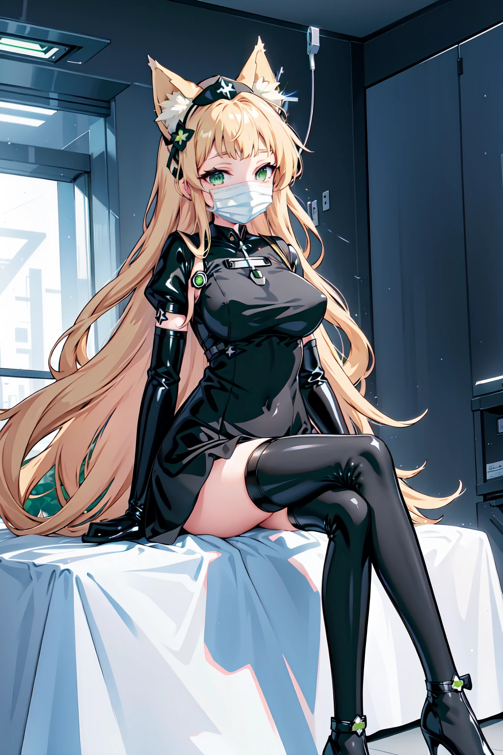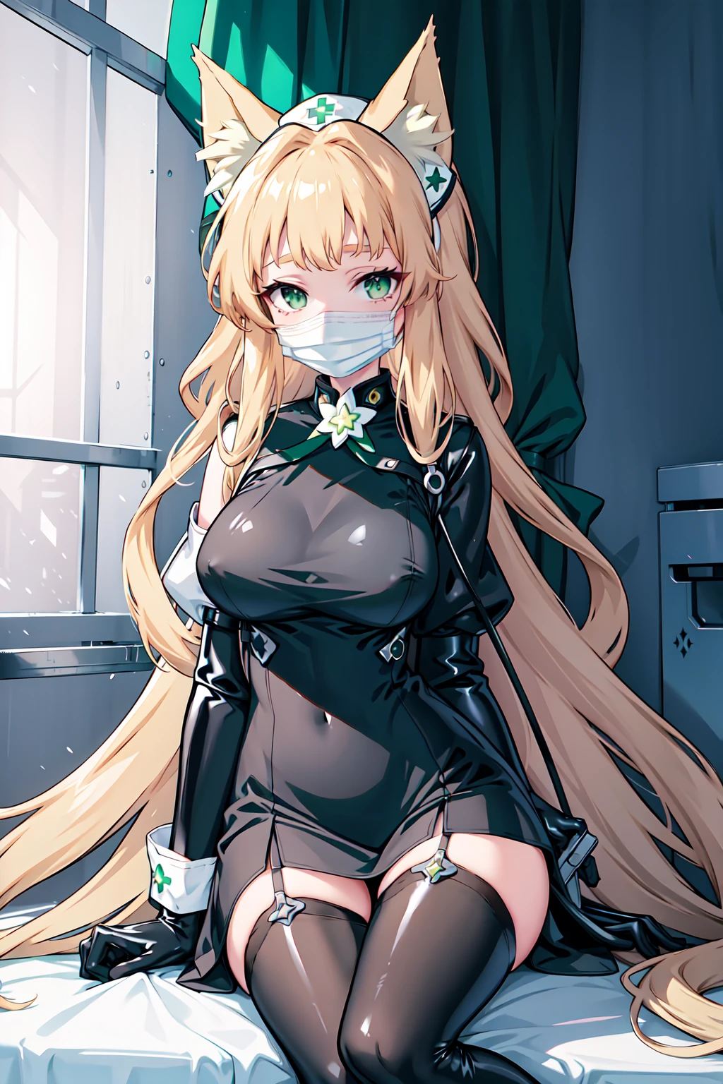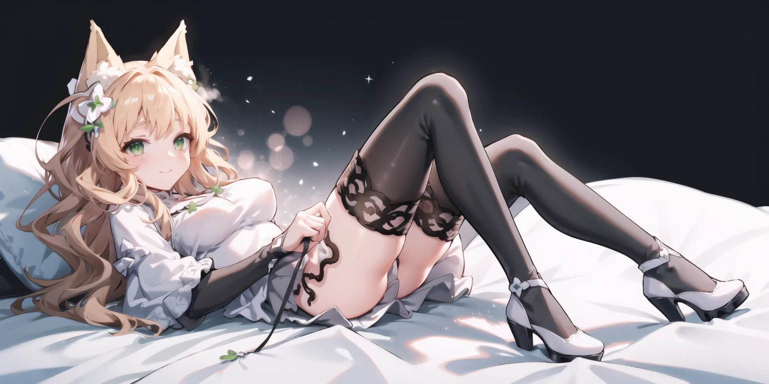 animal ears, green thigh strap, braid, very long hair, green star ornament, hair ornament, holding lantern, lantern, green wedge heels, frilled dress,