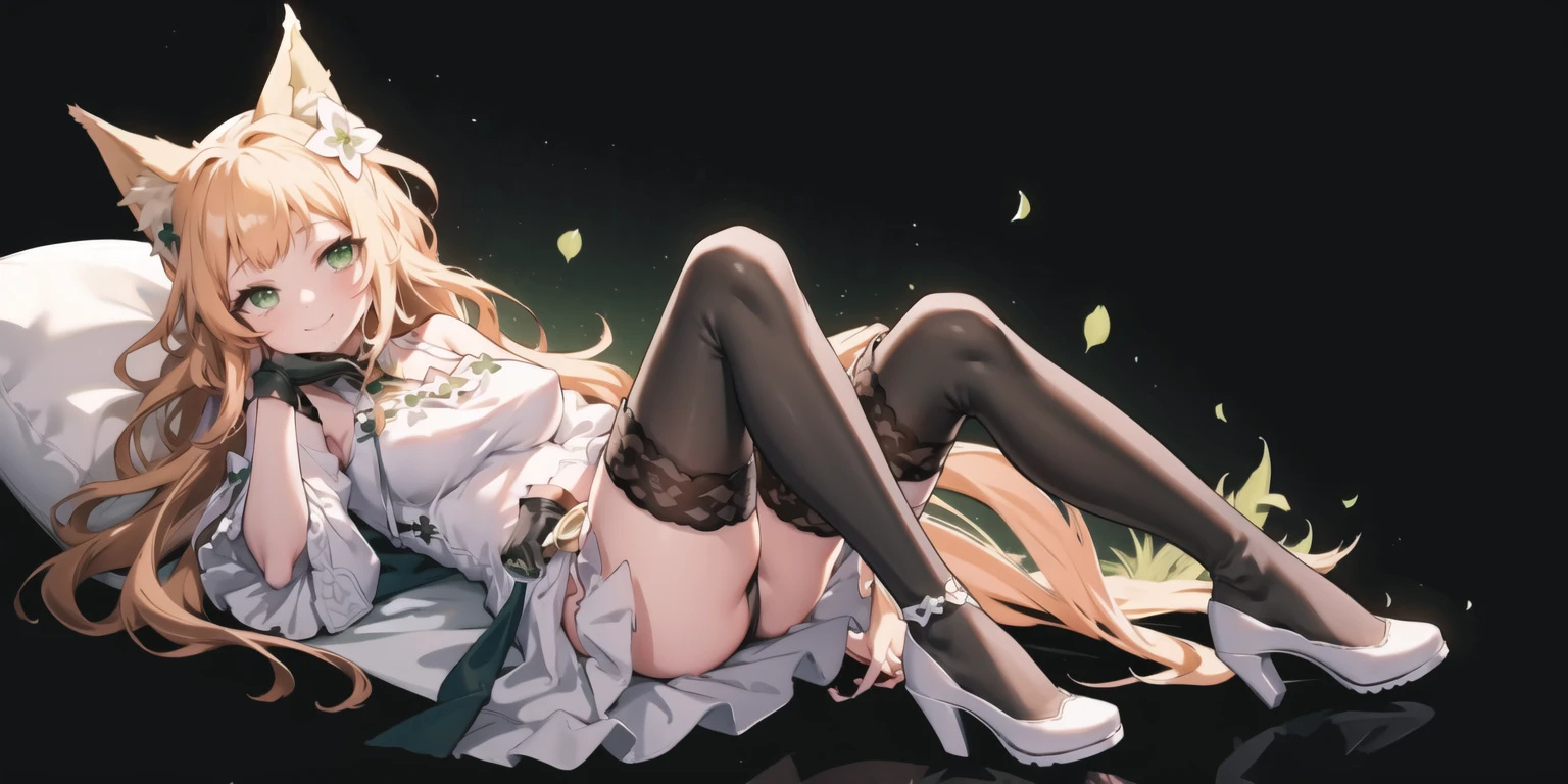 chiffon(maimai), hair flower, long hair, fox girl, dress, green eyes, fox ears, white dress, ahoge, white thighhighs, blonde hair, green hair ornament, fox tail, animal ear fluff, bare shoulders, cleavage, collarbone, cleavage cutout, ribbon, chest jewel, green flower ornament, detached sleeves,