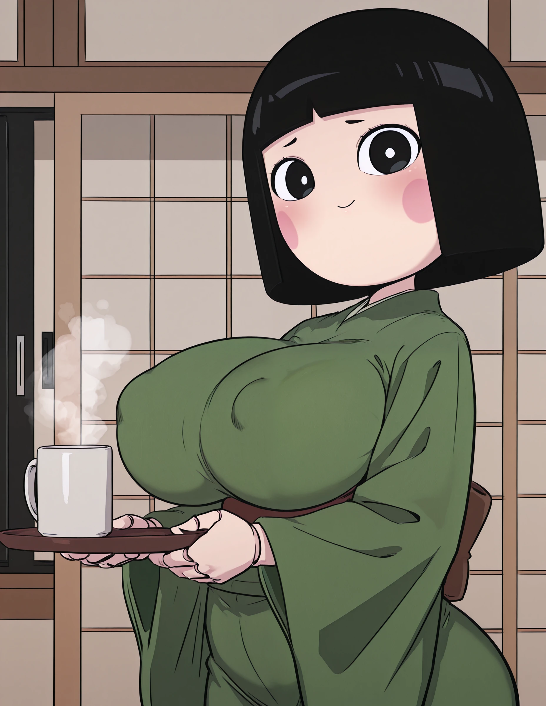 short puppet bobcut, maid apron, maid cap, slit eyesMature Karakuri: