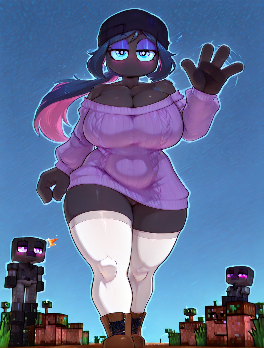 (1girl, solo, non-human, taller female, long arms, long legs, Enderman (minecraft), Minecraft, no mouth, stubby arms, 3 fingers, fewer digits, stubby limbs, no toes, black body, black skin, colored skin, black hands, black fingers, black hair, blue hair, two-toned hair, short hair, ponytail, sidelocks, wavy hair, blue eyes, purple blushing, colored blush, , thick legs, chubby legs, , thin)