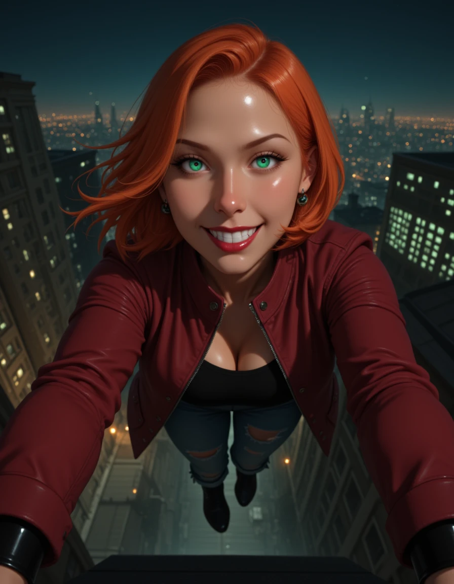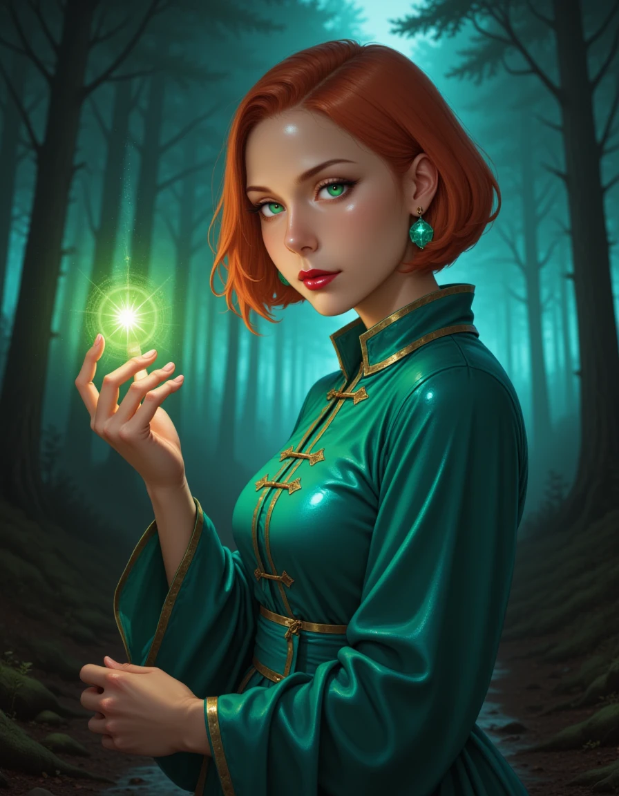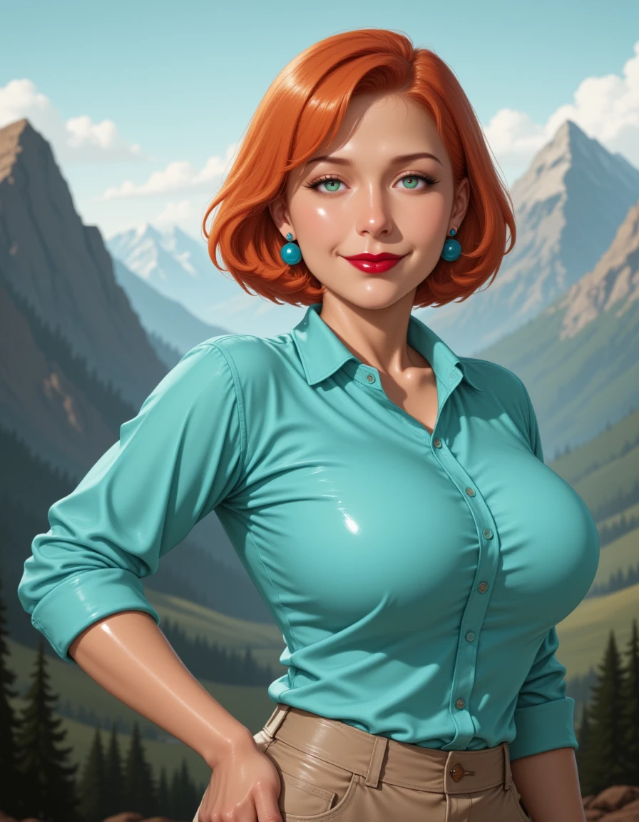 blue earrings, short orange hair, red lipstick, shiny green eyes, beige pants and a blue collared shirt