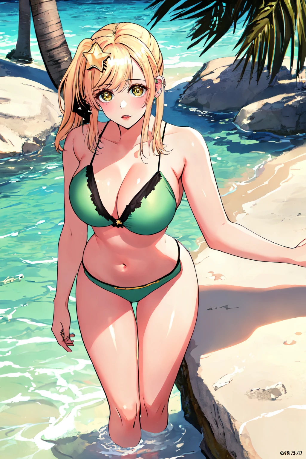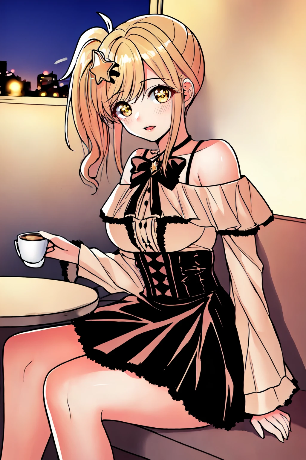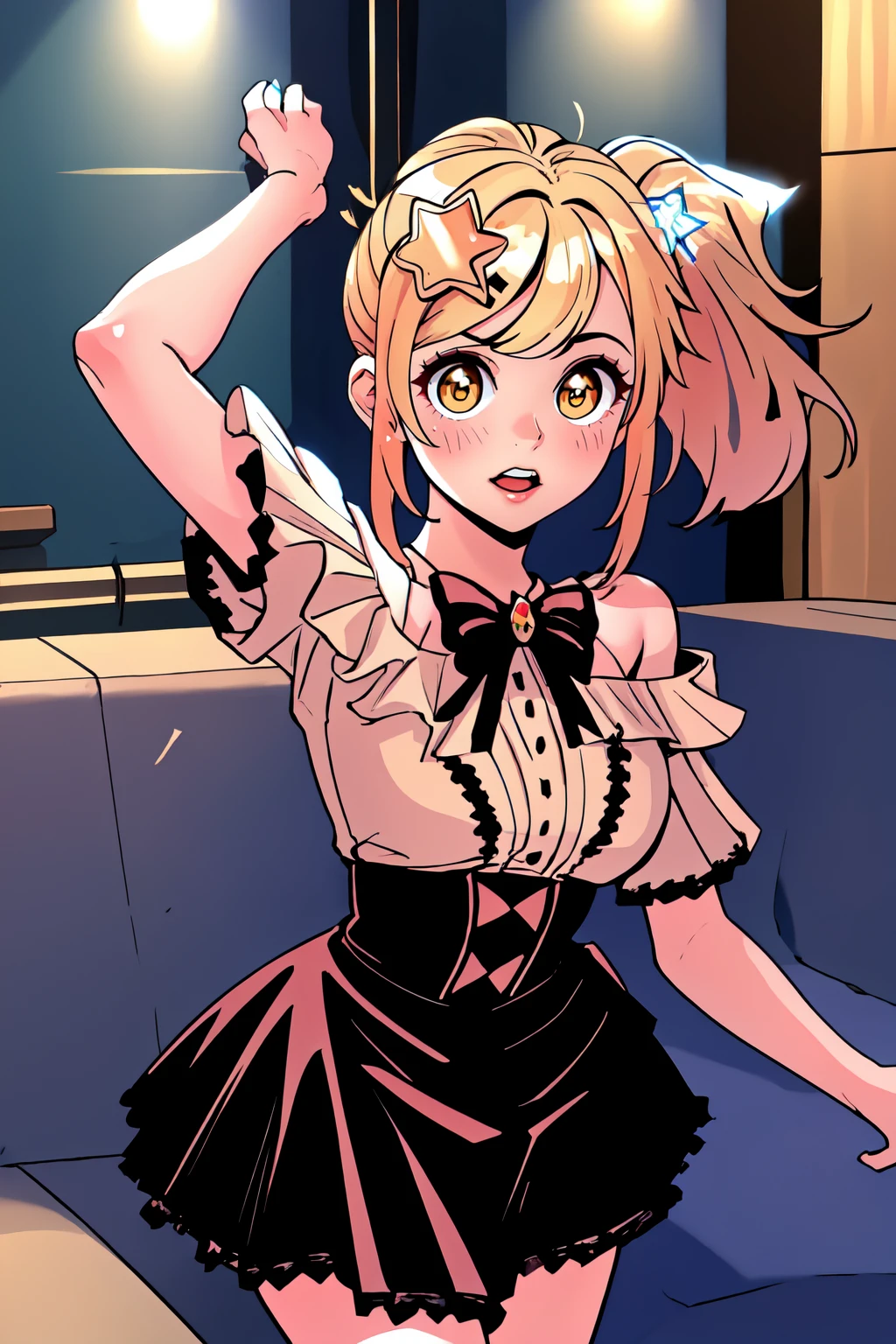 Trigger 2 : 1girl, short hair, side ponytail, star-shaped pupils, hair ornament, star (symbol), dress, bare shoulders, bow, side ponytail, handbag,