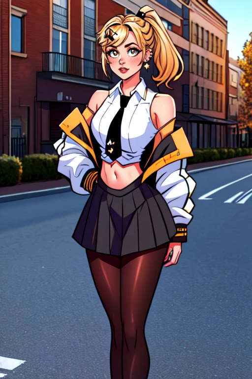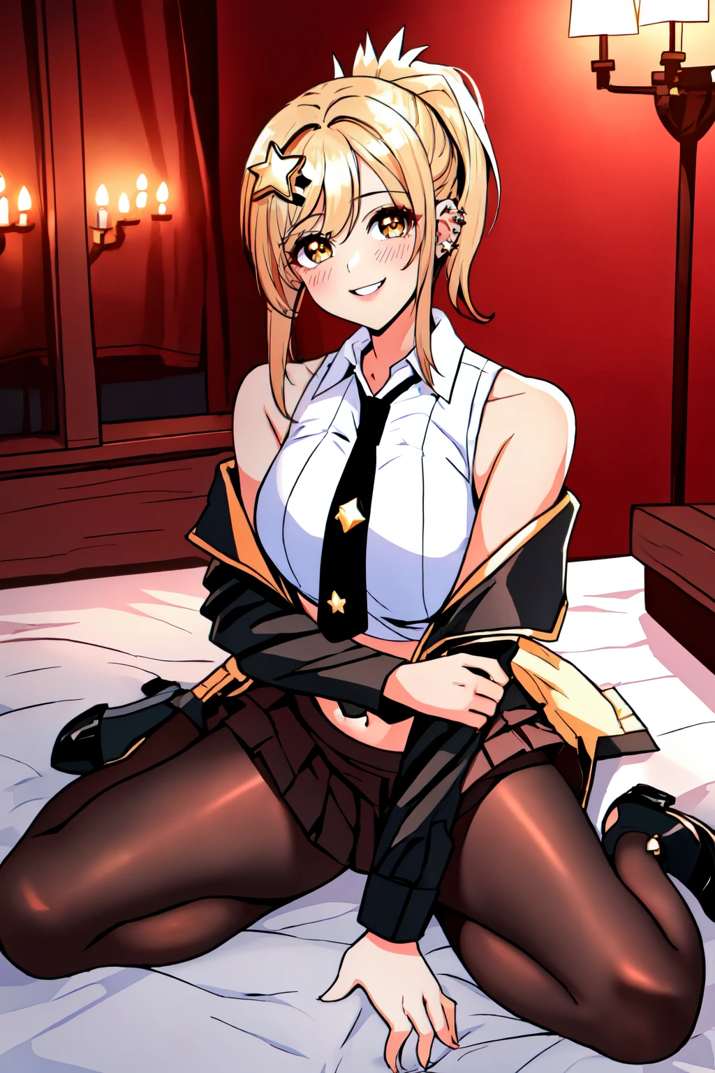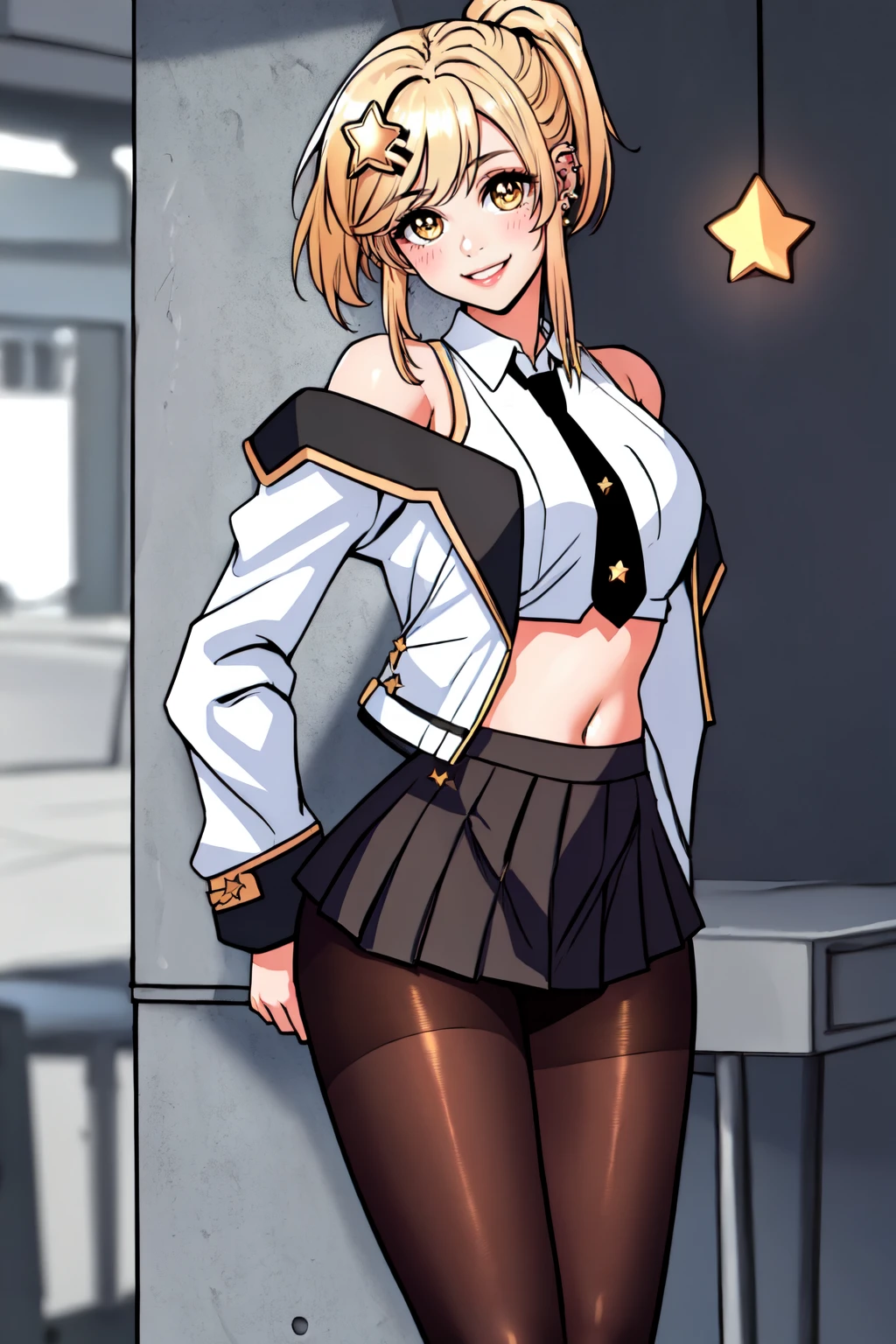 Trigger 1 : 1girl, short hair, hair ornament, star-shaped pupils, long sleeves, bare shoulders, midriff, collared shirt, black skirt, off shoulder, star (symbol), miniskirt, black footwear, side ponytail, open jacket, white jacket, ear piercing, black necktie, brown pantyhose