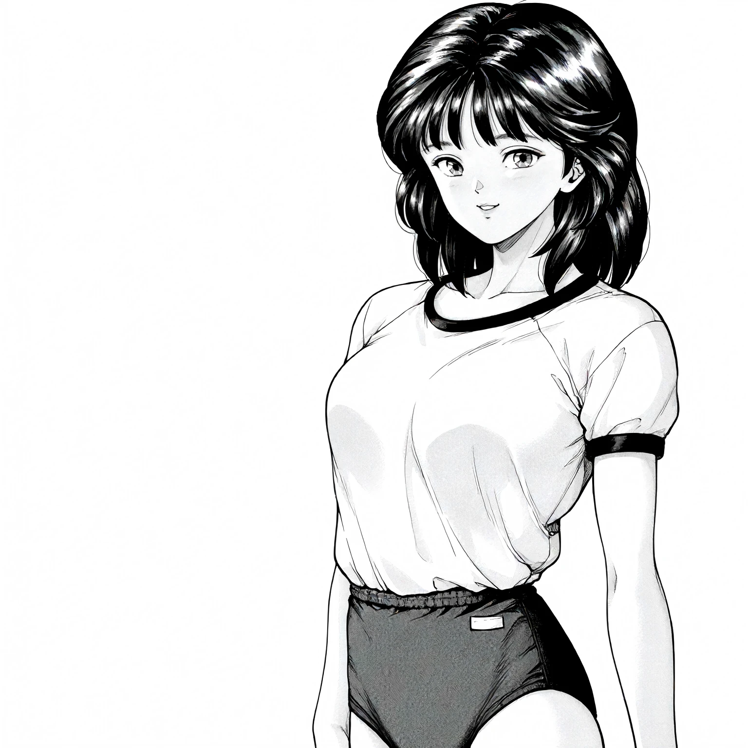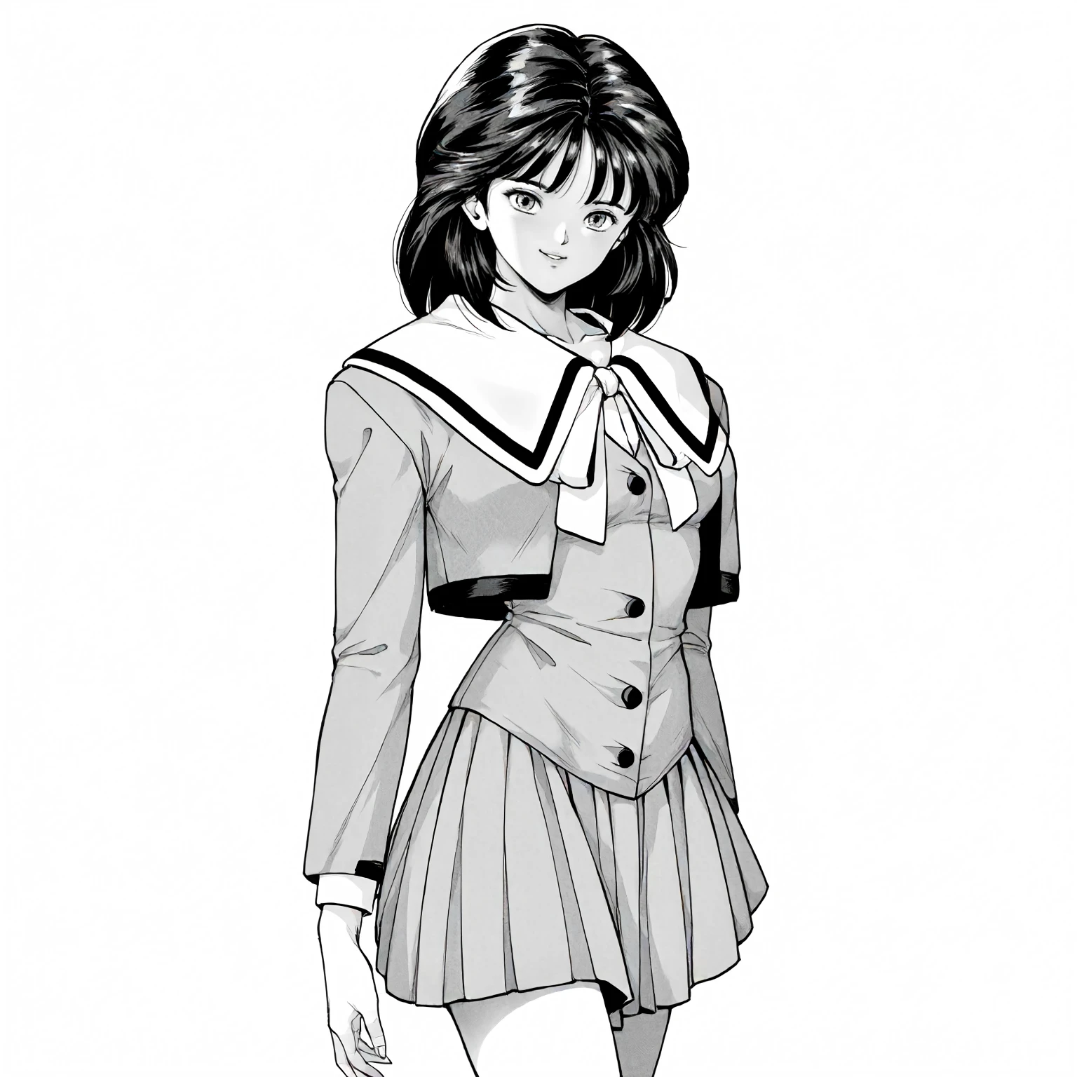 retro artstyle,monochrome,greyscale, hayakawa_moemi\(video_girl\),1girl,medium hair,grey eyes,lips, skinny,medium breasts,