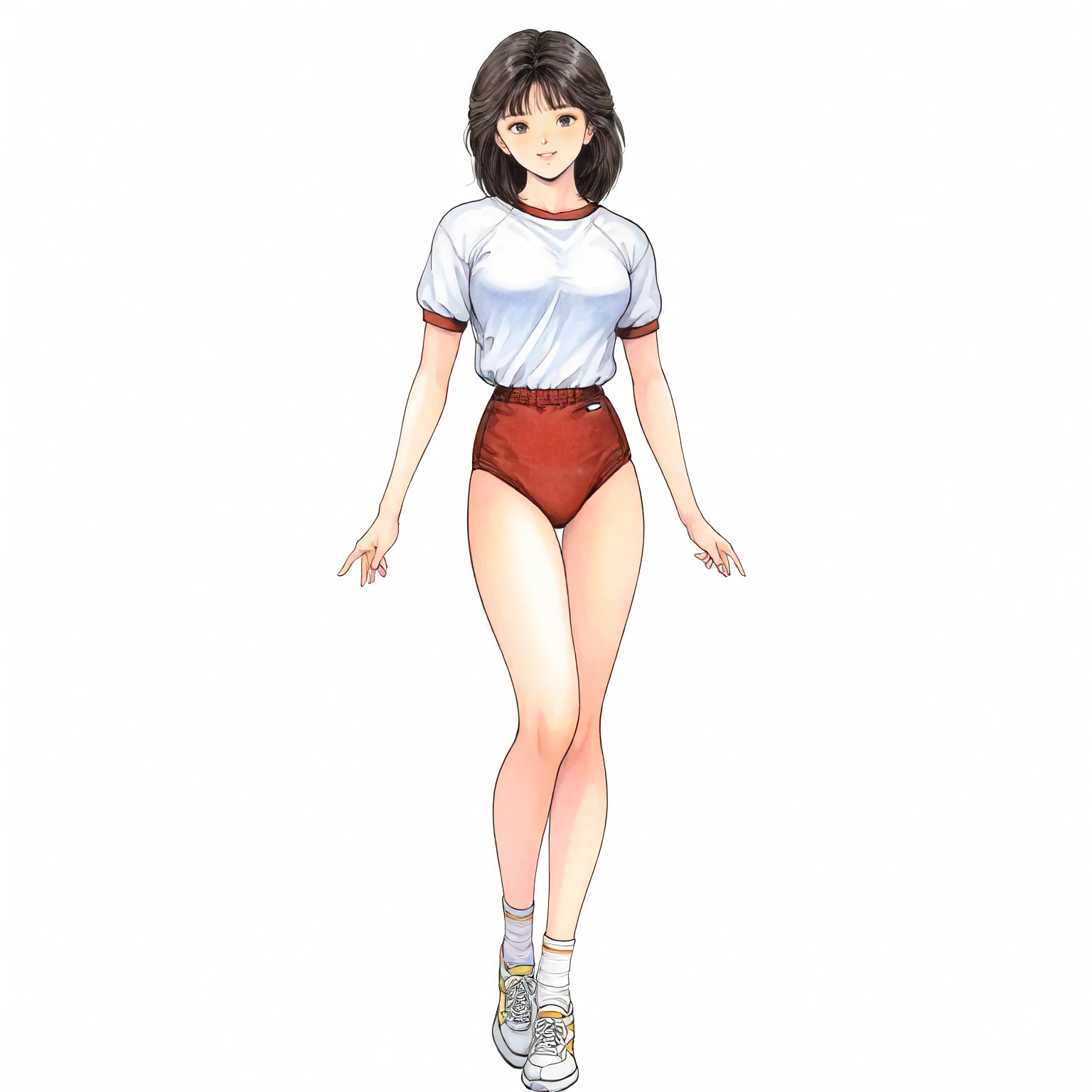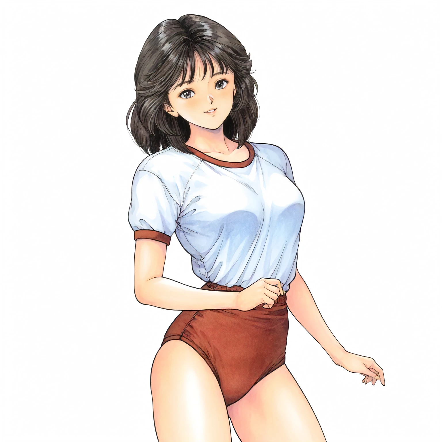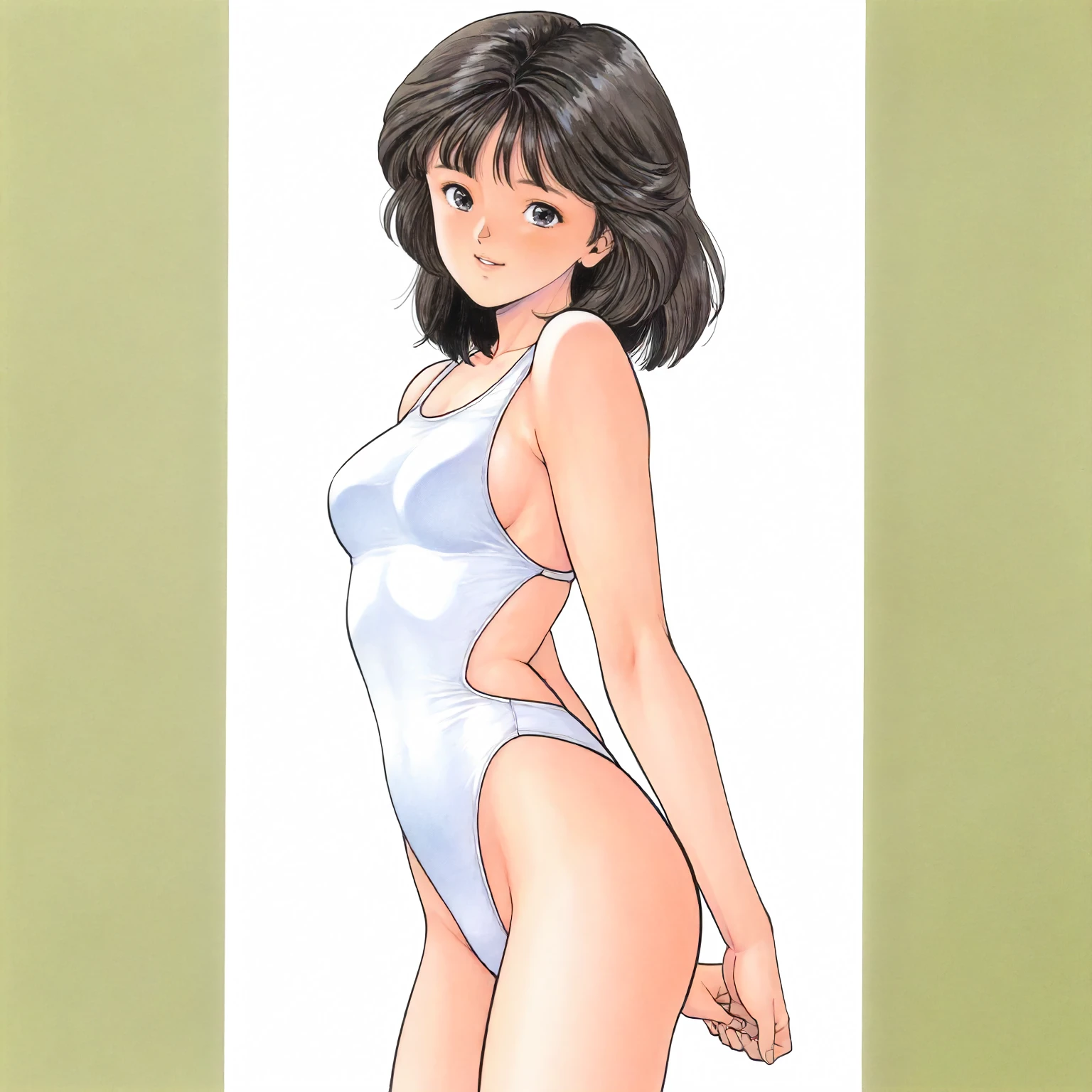 retro artstyle,watercolor_(medium), hayakawa_moemi\(video_girl\),1girl,black brown hair,medium hair,black eyes,lips, skinny,medium breasts,