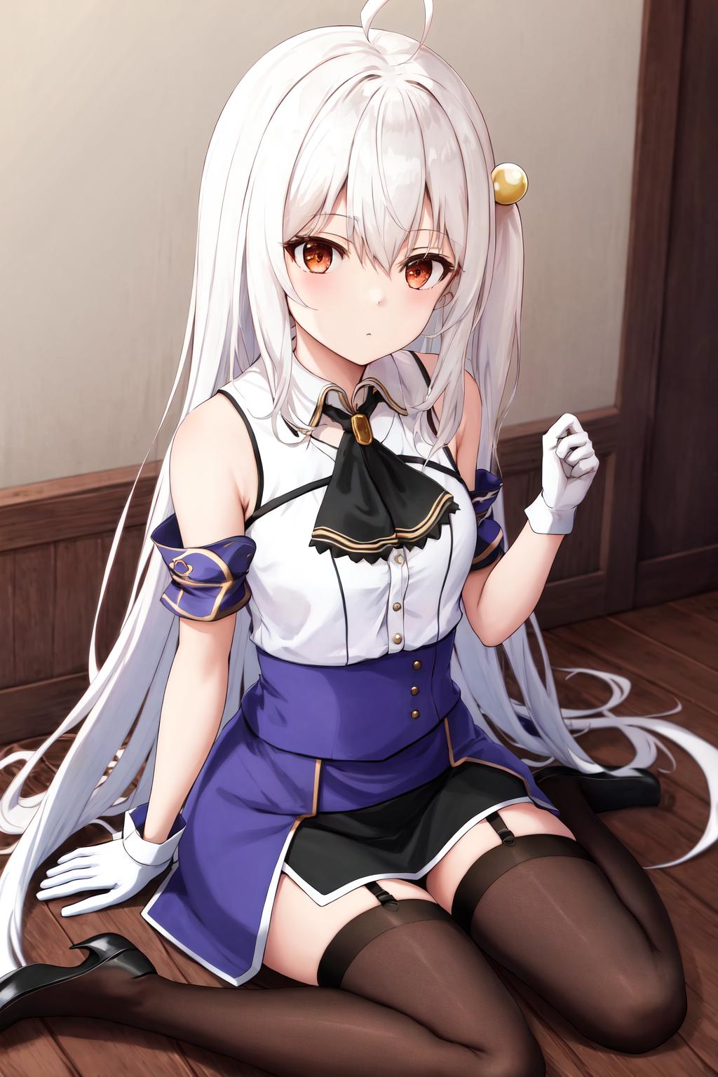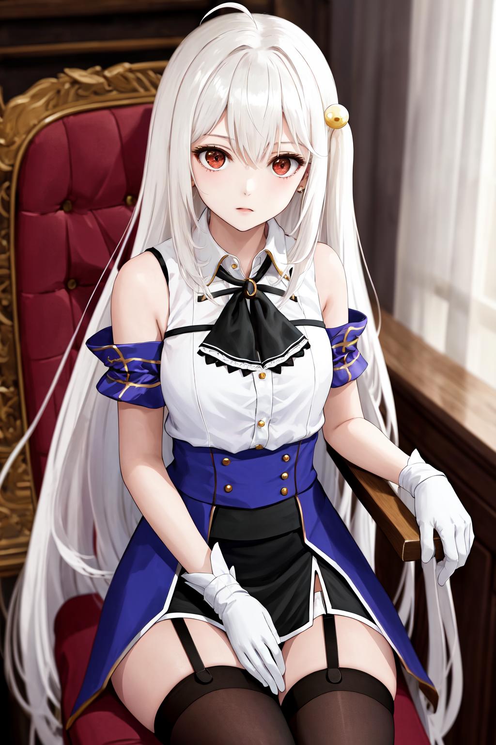 Default outfit: sleeveless bare shoulders armband neck ribbon black ascot white shirt blue dress black skirt white gloves black thighhighs garter straps