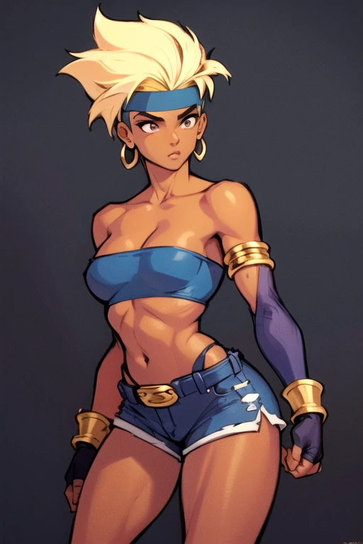 GarnetStreetsofRage, 1girl, solo, short hair, blonde hair, fingerless gloves, navel, cleavage, bare shoulders, jewelry, medium breasts, earrings, short shorts, midriff, dark skin, dark-skinned female, strapless, headband, chain belt, tan, armlet, blue shorts, blue tube top