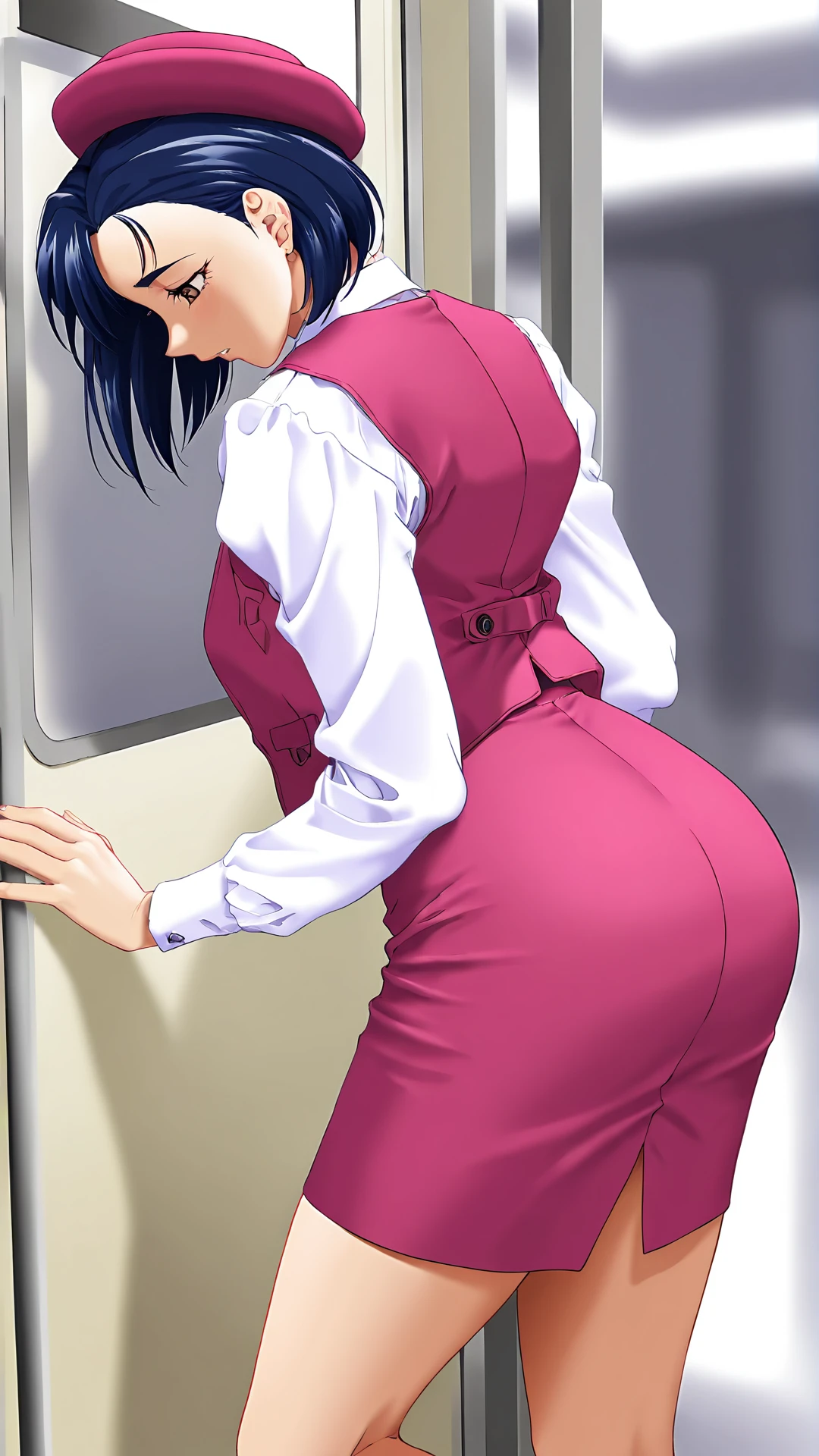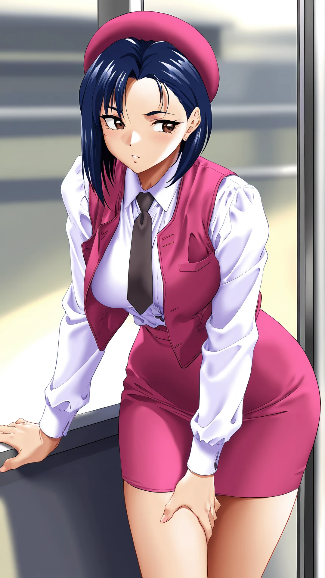 YumeTenshiServer,1girl,solo,skirt,brown eyes,hat,pencil skirt,long sleeves,short hair,vest,beret,blue hair,shirt,