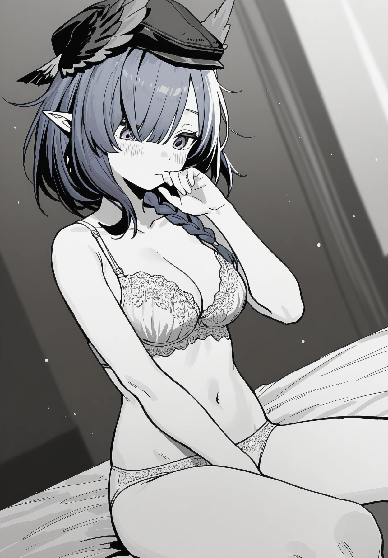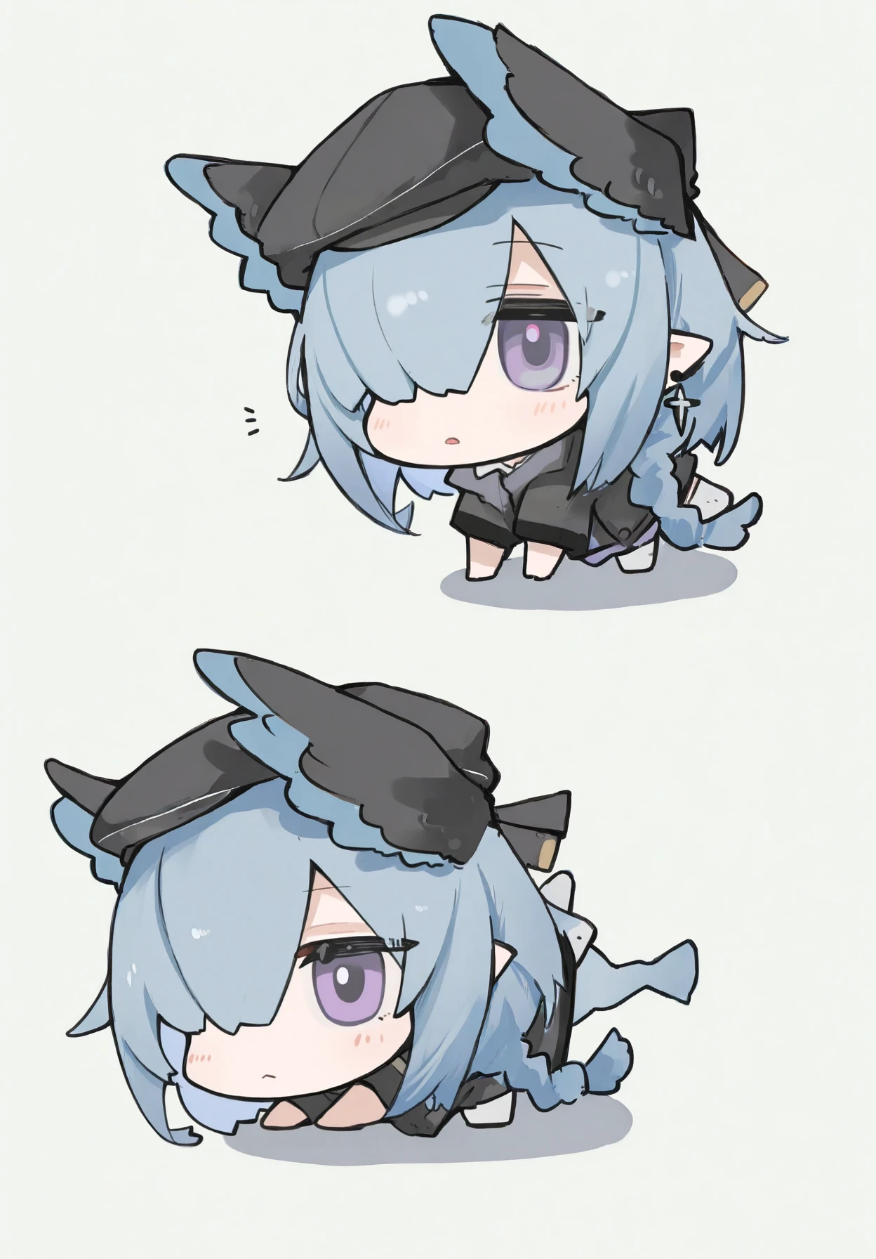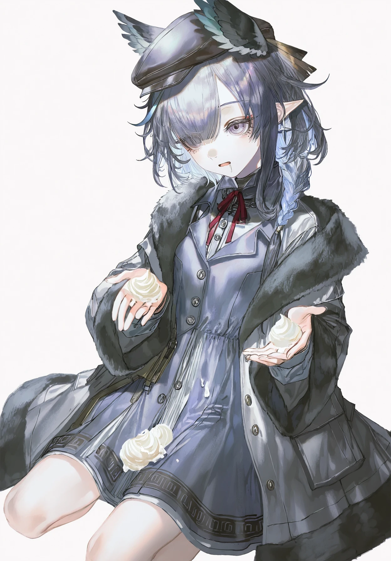 ukusik_\(arknights\),1girl,blue hair,short braided ponytail,hair over one eye,purple eyes,pointy ears,head wings,diamond earrings,single earring,black beret,red neck ribbon,blue turtleneck shirt,black coat,fur-trimmed coat,high-waist belt,blue dress,black pantyhose,bandaged leg,belt boots