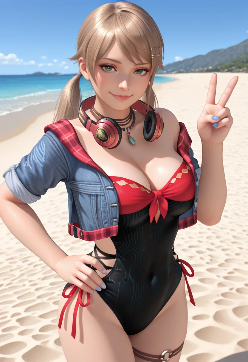 4M1D0AXV, blonde hair, hairpin, green eyes, lips, low twintails, swept bangs, headphones around neck, multiple necklaces, cropped denim jacket, sleeves rolled up, open jacket, plaid trim, one piece swimsuit, front-tie top, circuit board print, cross-laced clothes, side-tie, o-ring thigh strap
