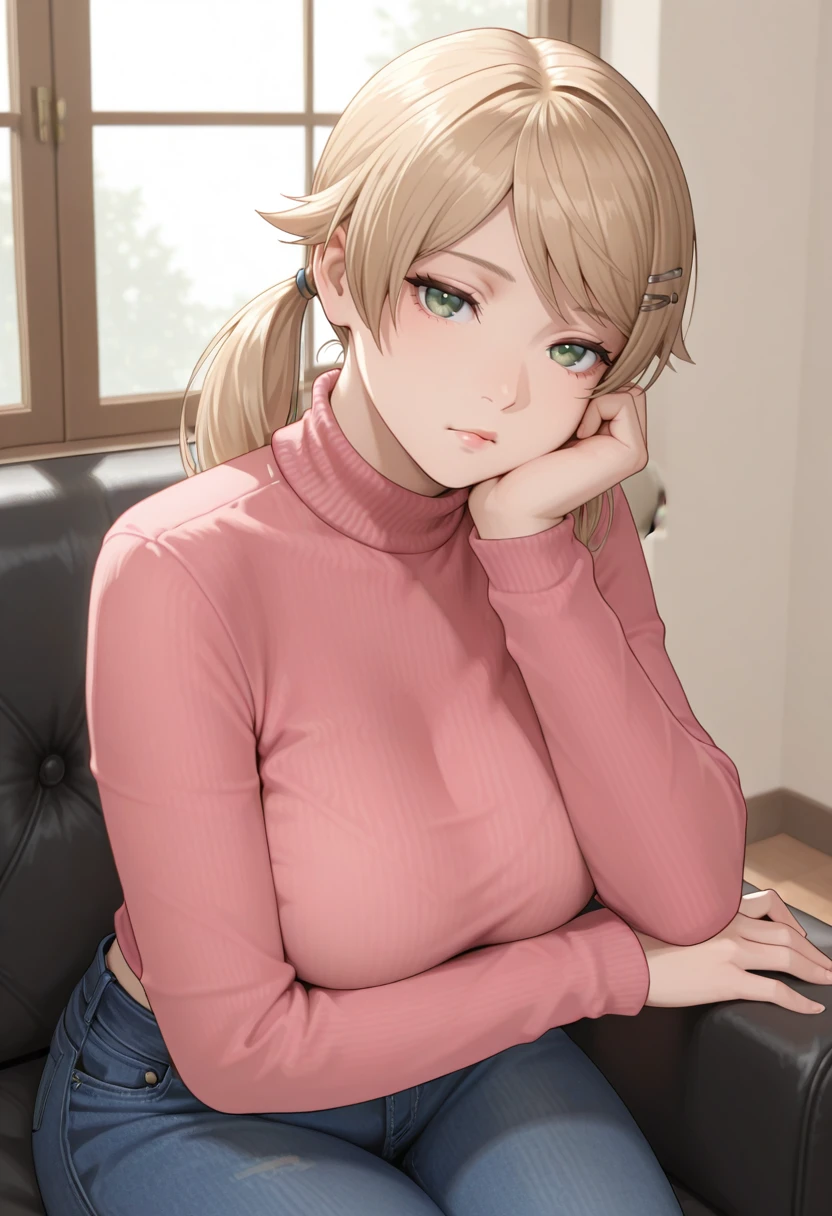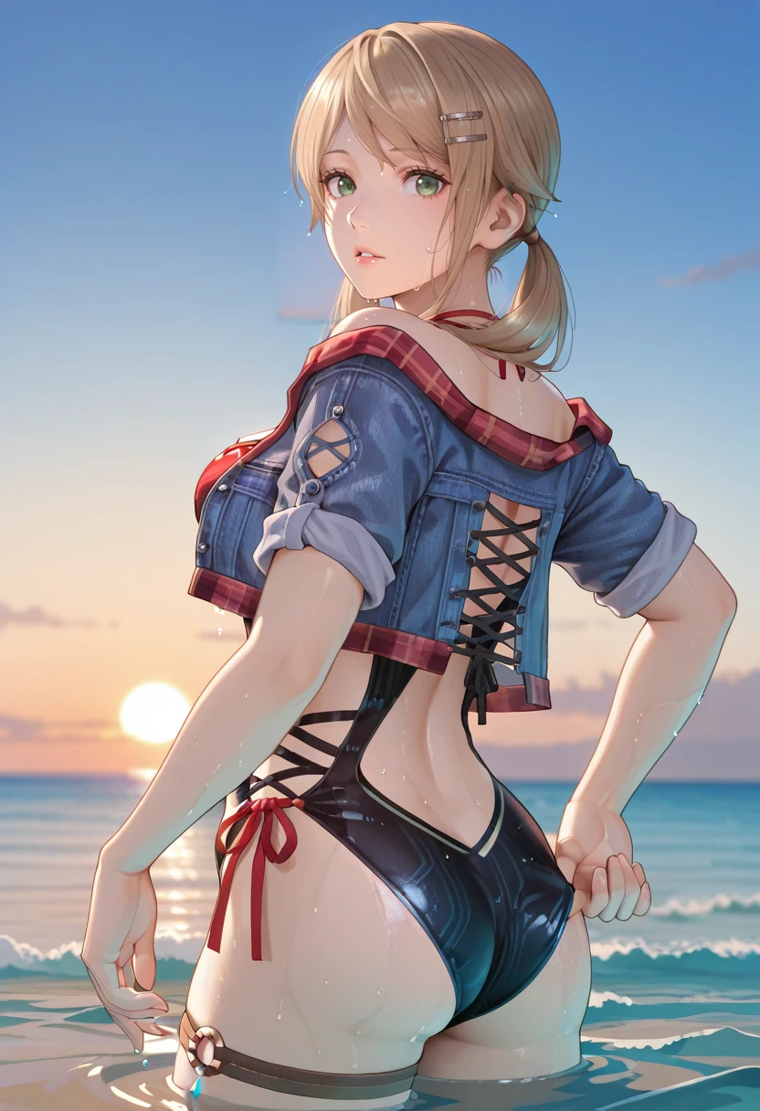 "4M1D0AXV, blonde hair, hairpin, green eyes, lips, low twintails, swept bangs, headphones around neck, multiple necklaces, cropped denim jacket, sleeves rolled up, open jacket, plaid trim, one piece swimsuit, front-tie top, circuit board print, cross-laced clothes, side-tie, o-ring thigh strap"