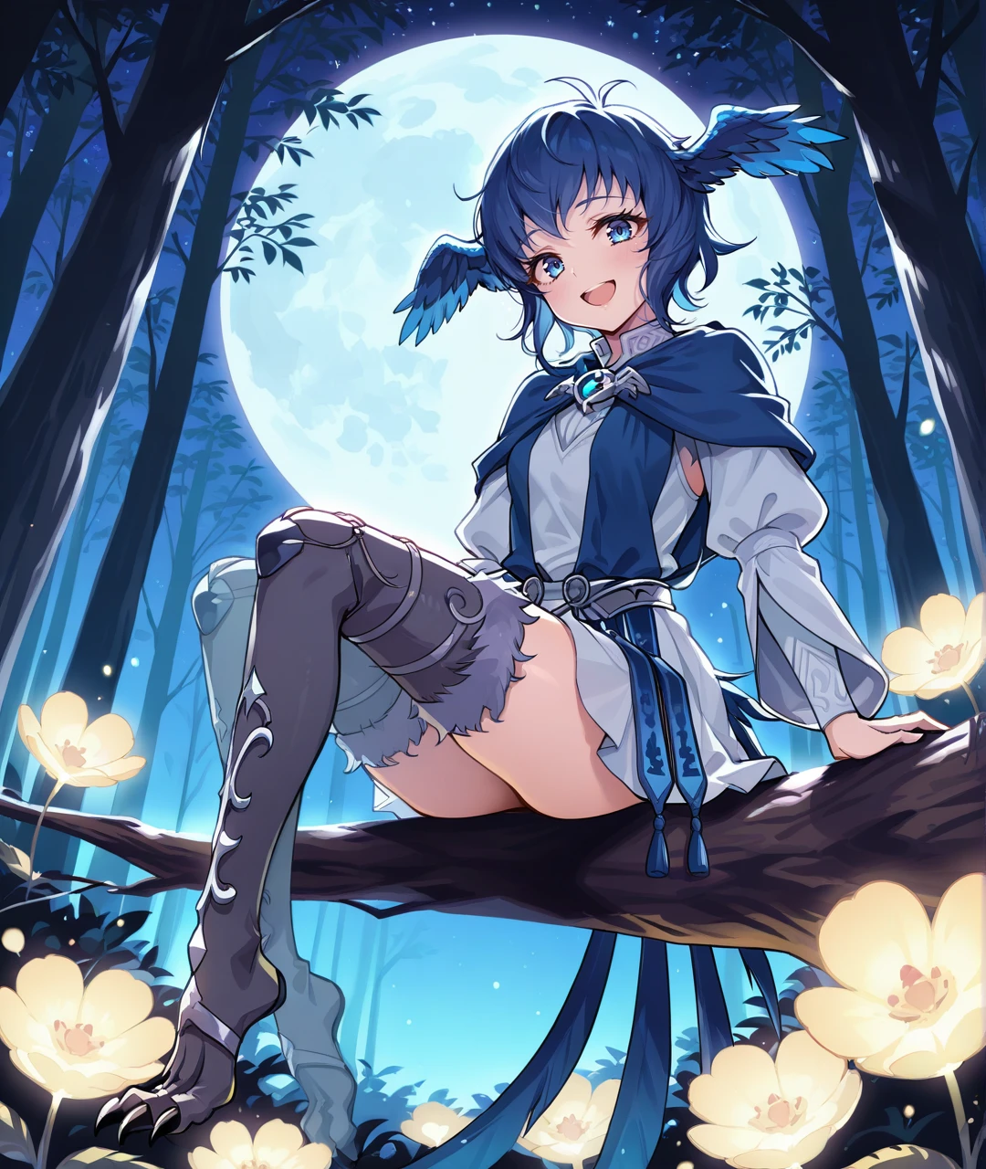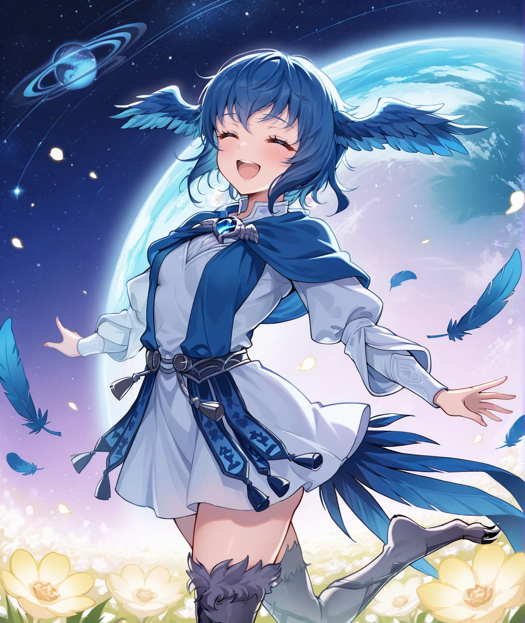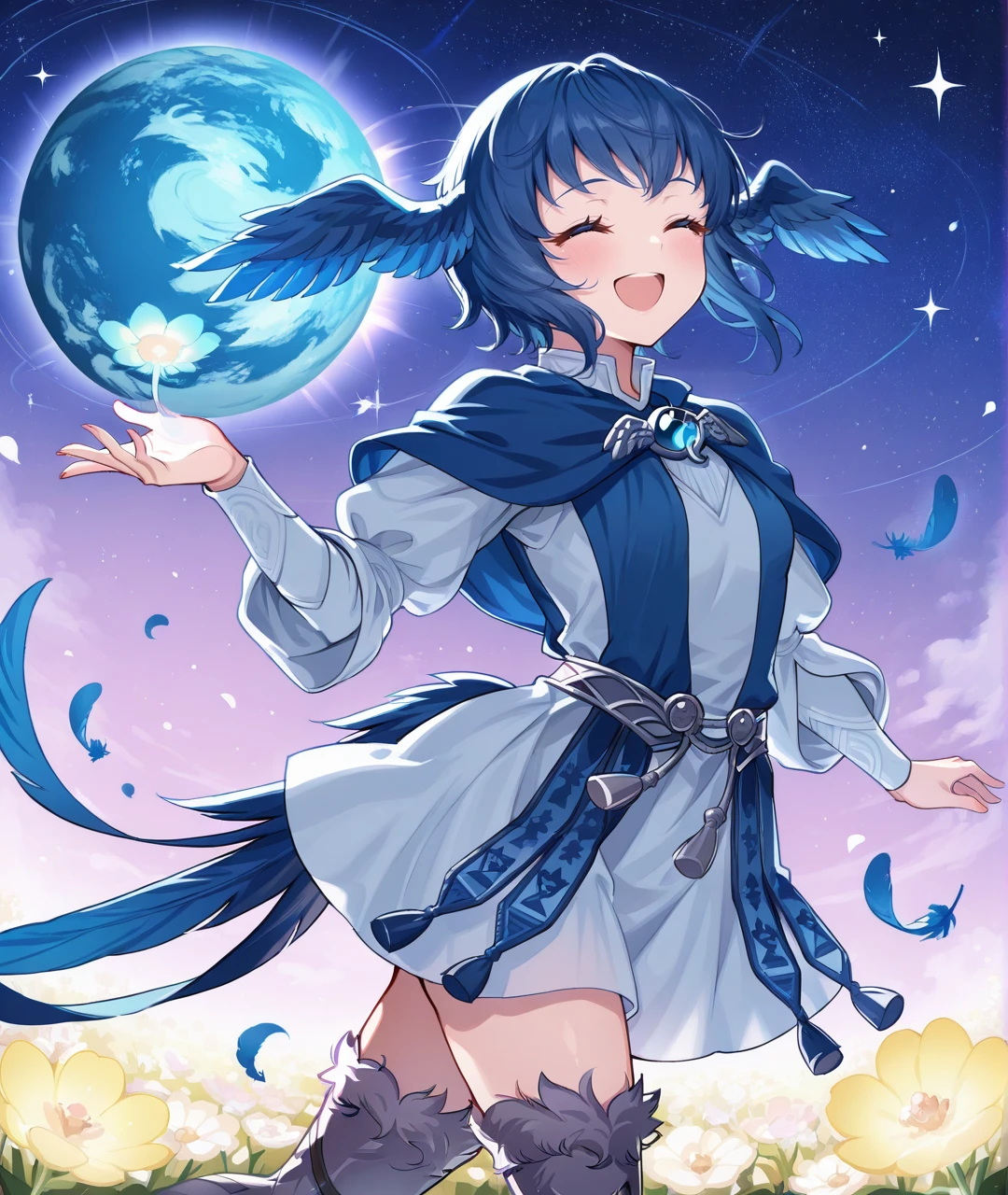 Tags: MeteionBase, blue eyes, blue hair, short hair, blue head wings, feathered wings, silver jewelry, silver brooch, blue gemstone, blue capelet, two-tone dress, blue dress, grey dress, short dress, collared dress, long sleeves, puffy sleeves, blue sash, silver belt, tassel, bird tail, blue feathers, bird legs, talons, bird girl,