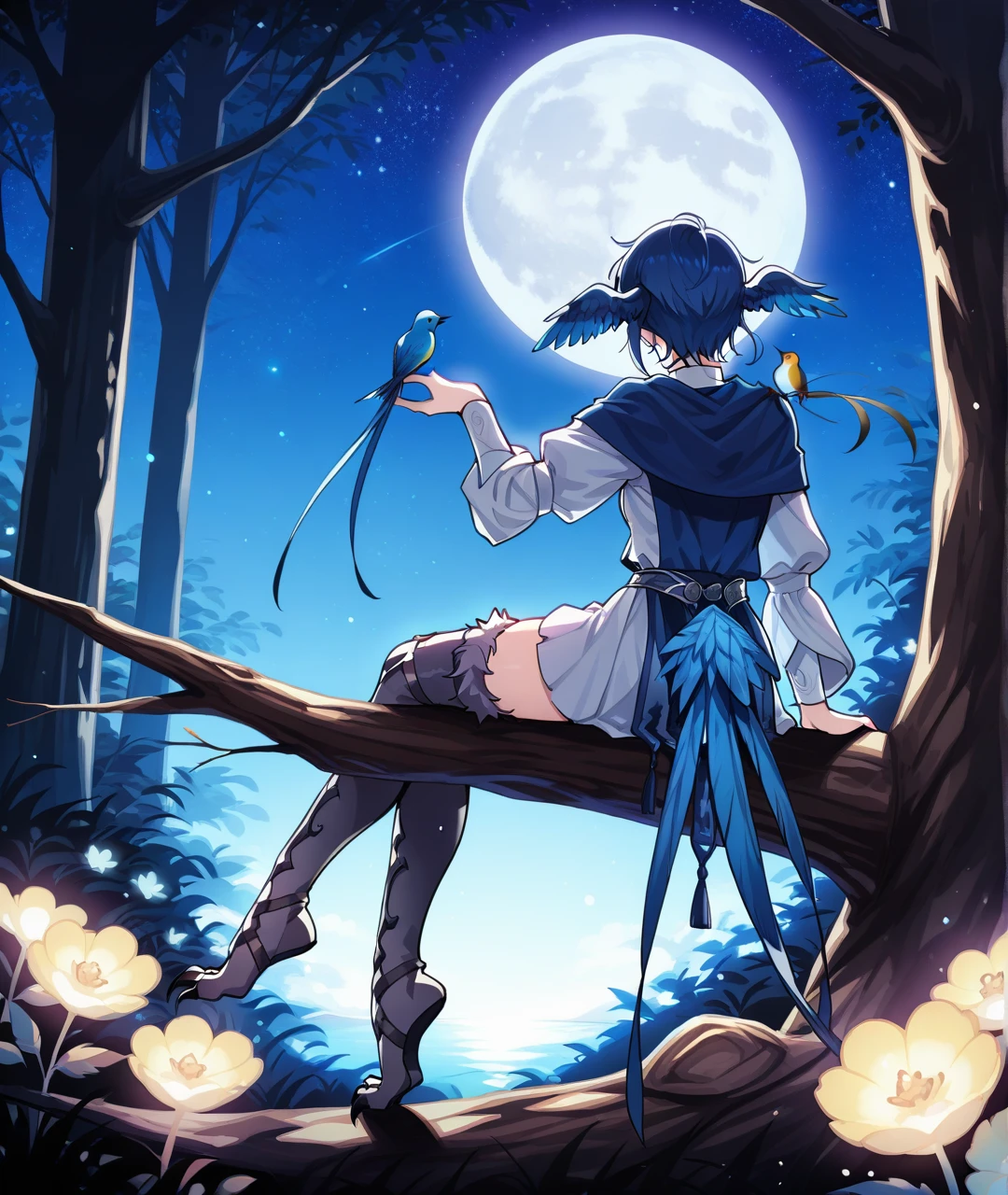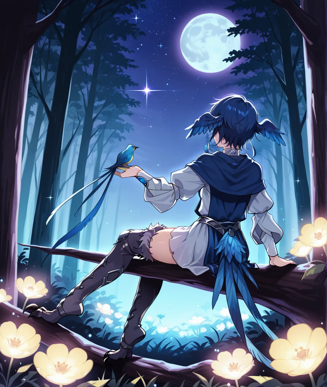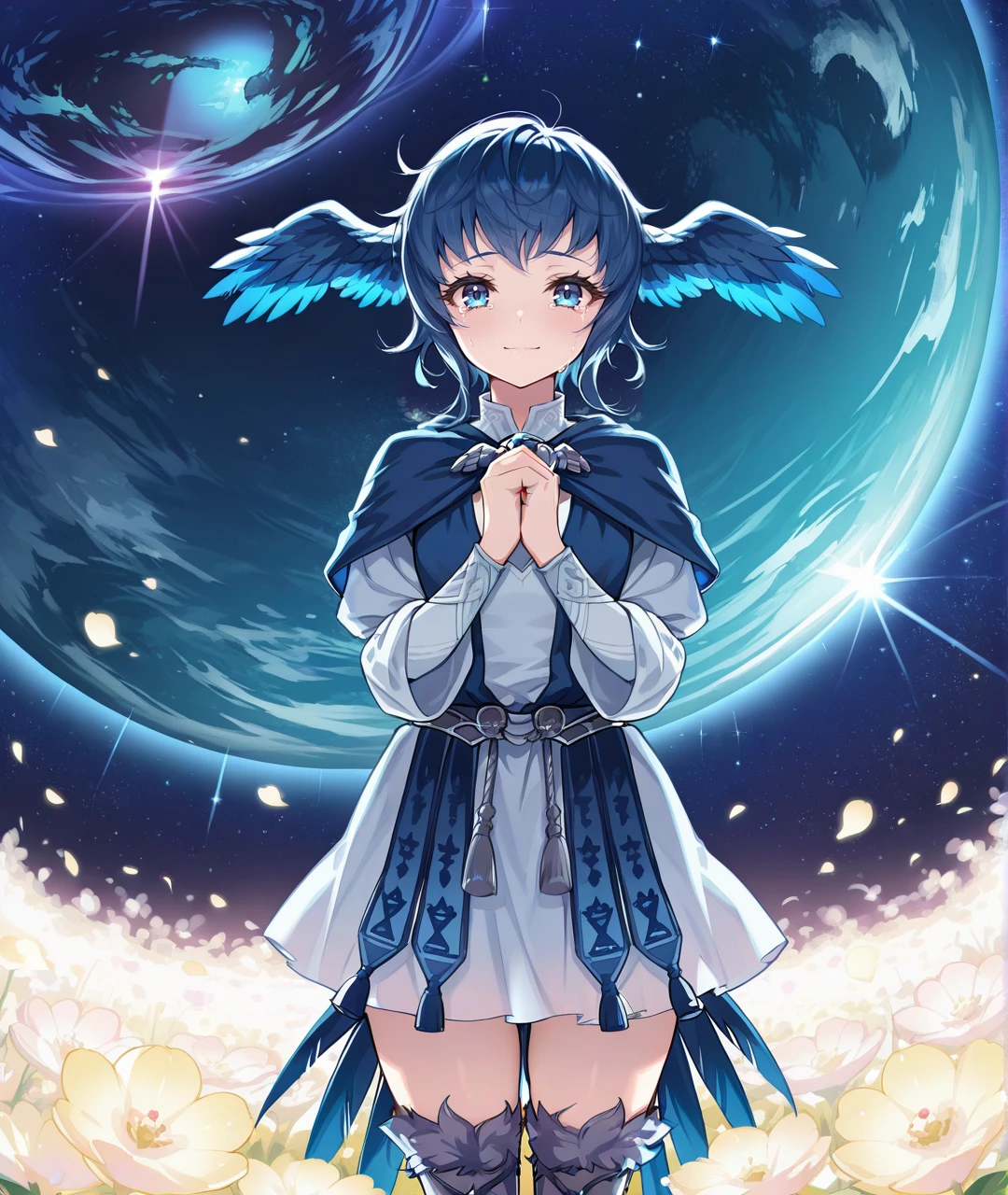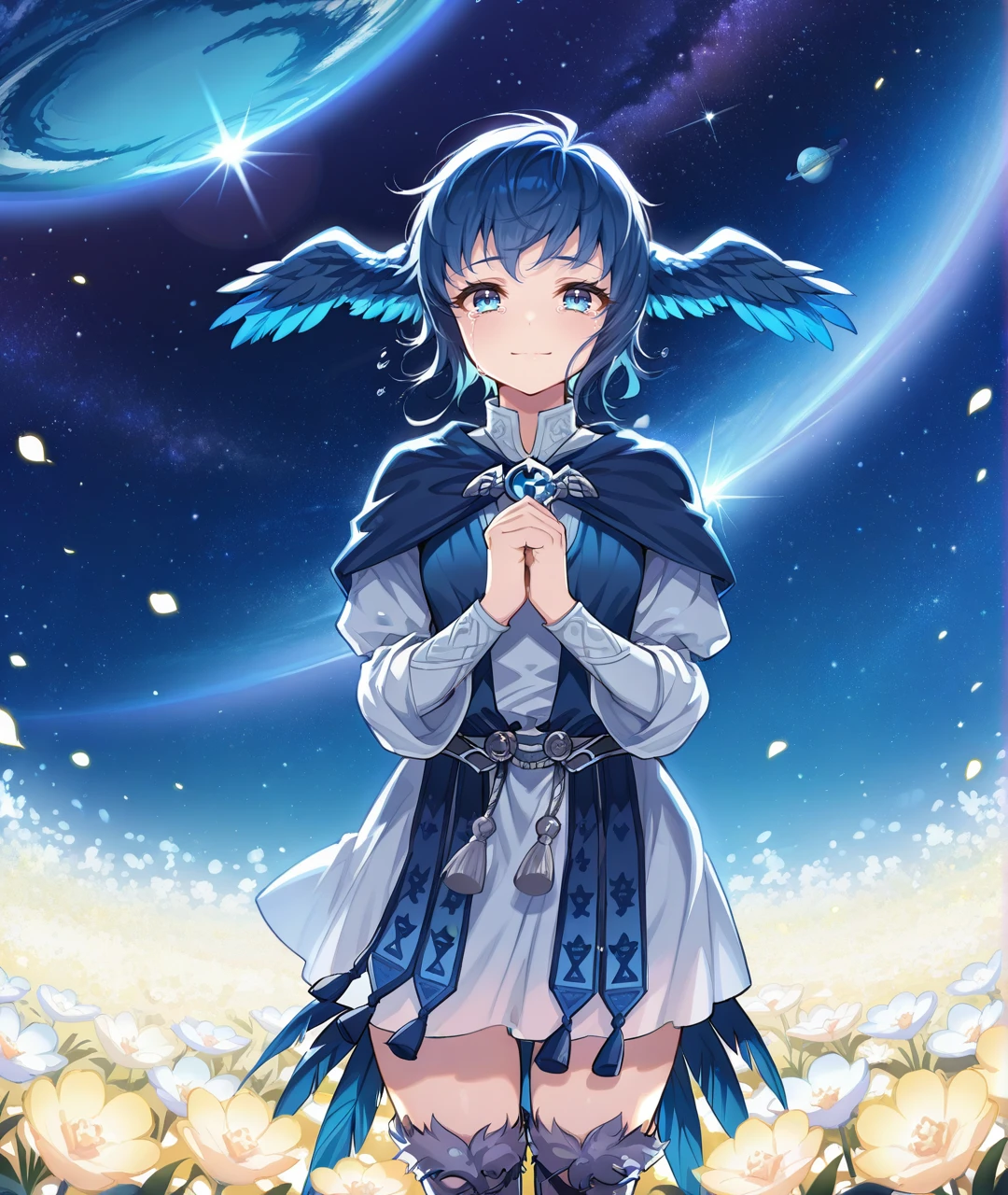 Tags: MeteionBase, blue eyes, blue hair, short hair, blue head wings, feathered wings, silver jewelry, silver brooch, blue gemstone, blue capelet, two-tone dress, blue dress, grey dress, short dress, collared dress, long sleeves, puffy sleeves, blue sash, silver belt, tassel, bird tail, blue feathers, bird legs, talons, bird girl,