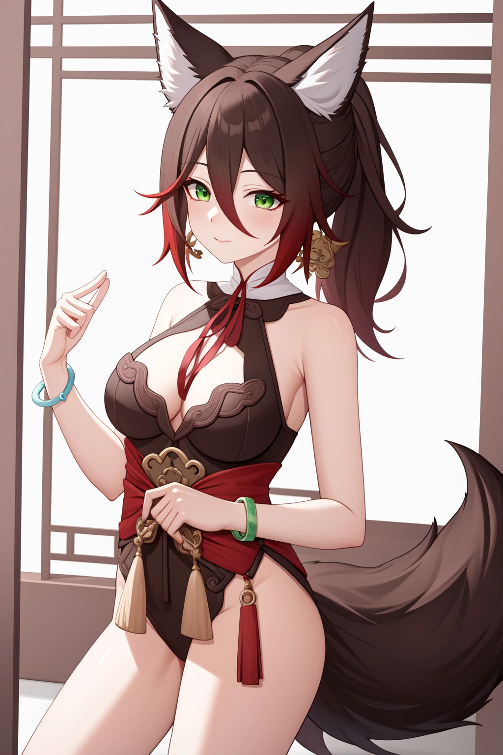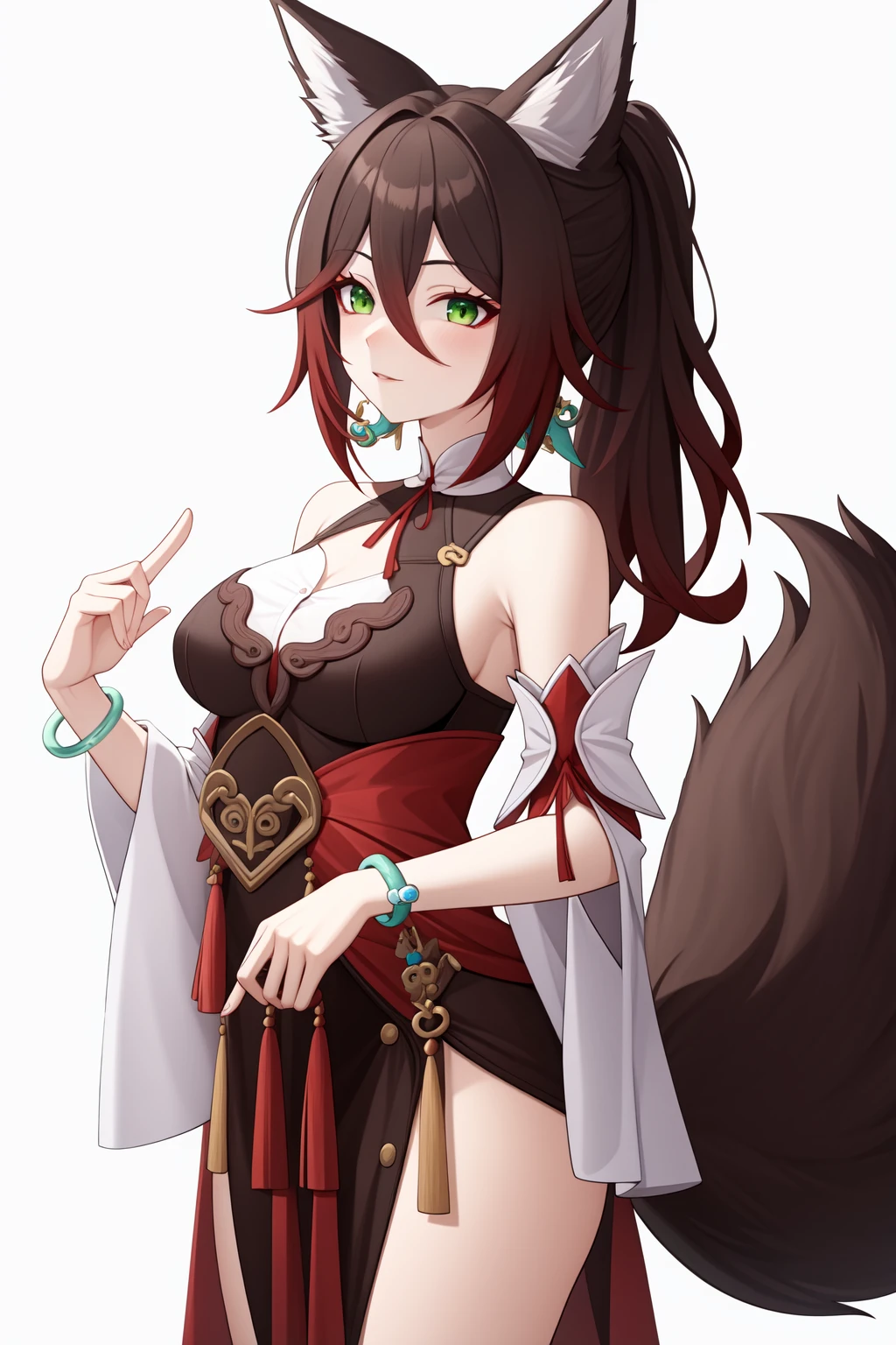 tingyun,animal ears,green eyes,breasts,brown hair,tail,hair between eyes,fox ears,jewelry,animal ear fluff,ponytail,long hair,fox tail,bracelet,