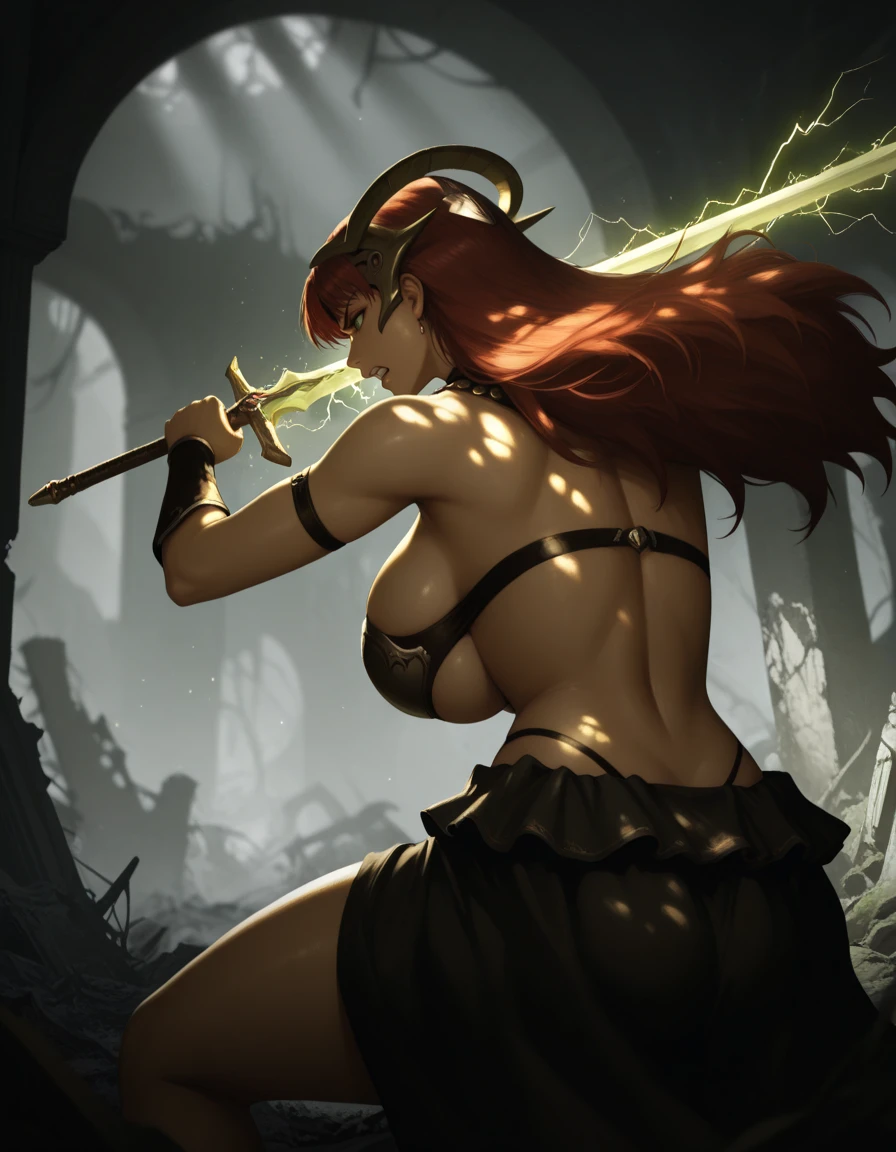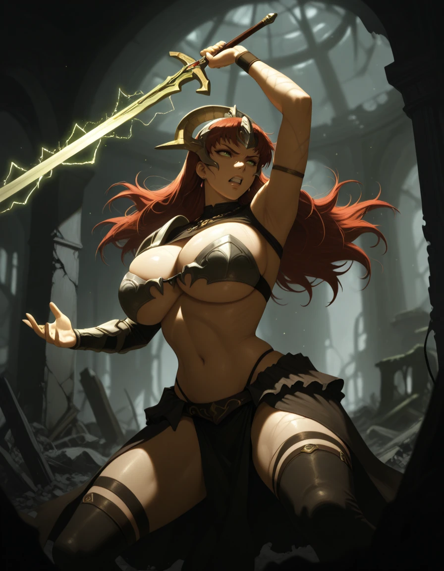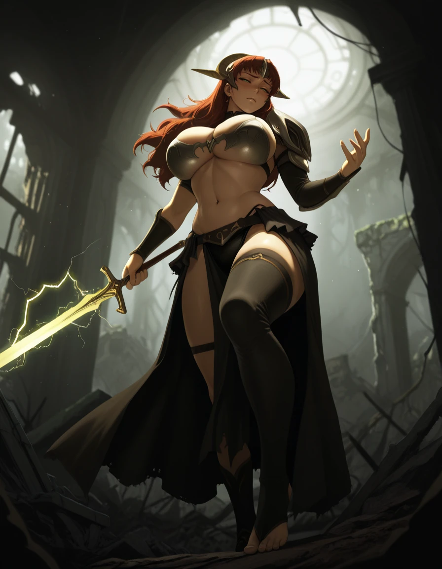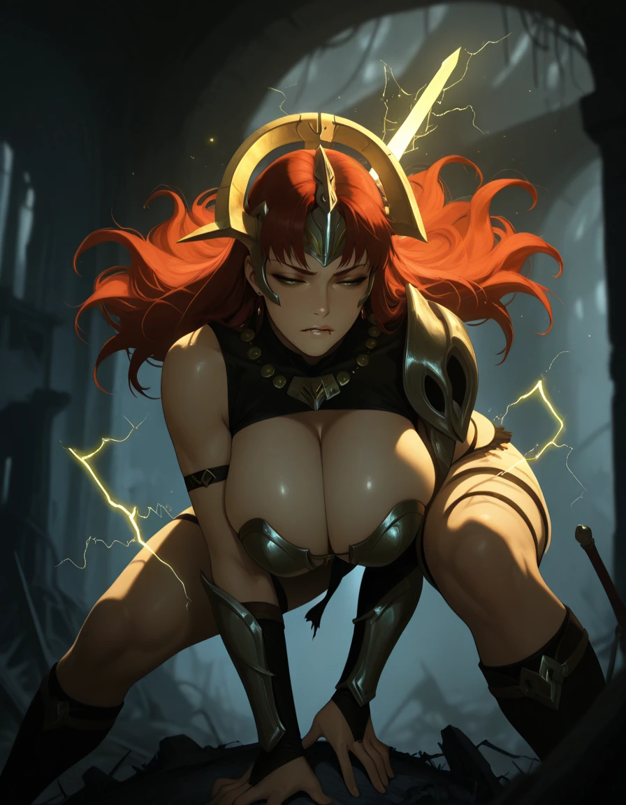 bikini armor, thighhighs, helmet, thong, cape, waist cape,