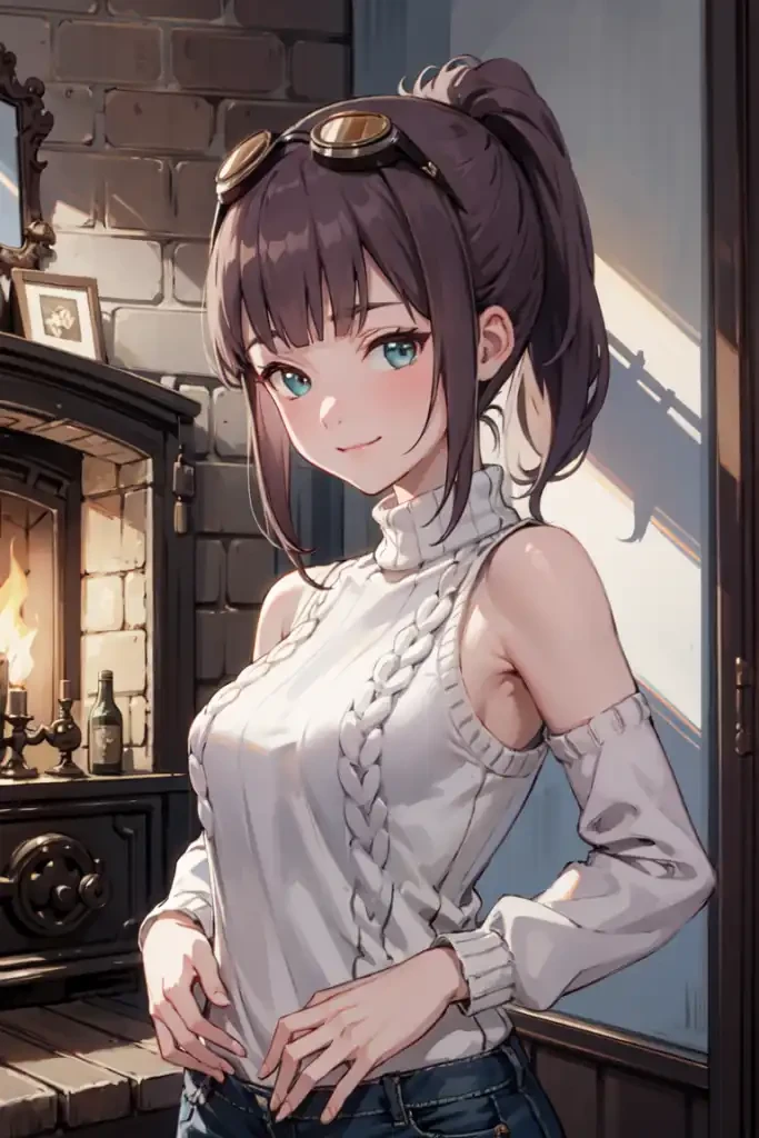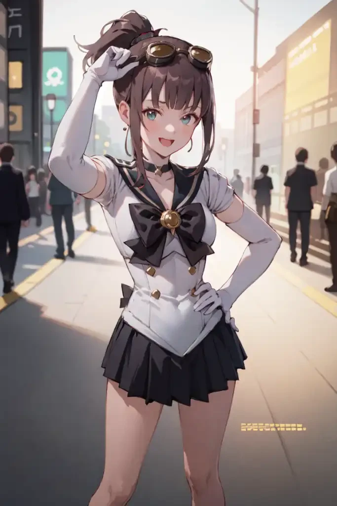 ponytail, sidelocks, goggles on head, dress, yellow bow, long sleeves, fingerless gloves, belt, belt pouch, thighhighs, boots, zettai ryouiki