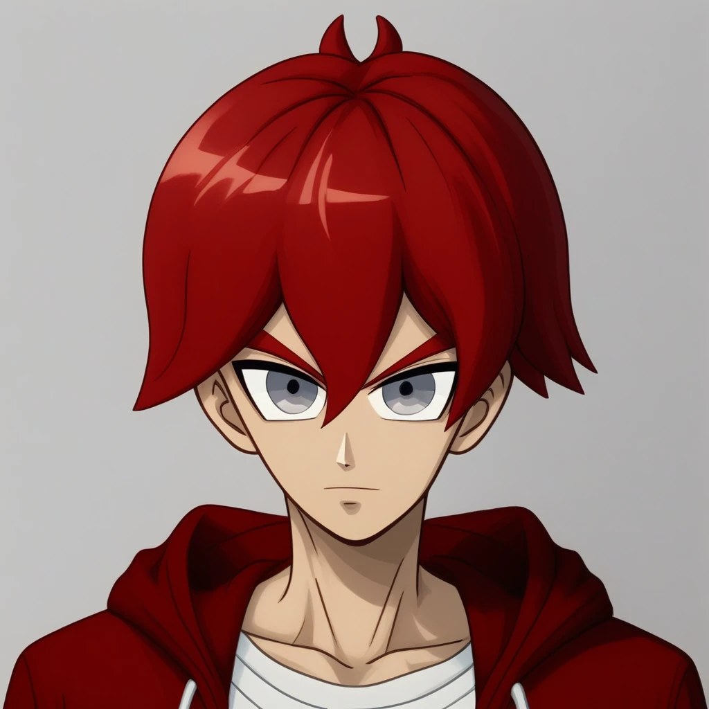 Akiro_Zenshin, red hair, silver eyes, red hoodie, white shirt