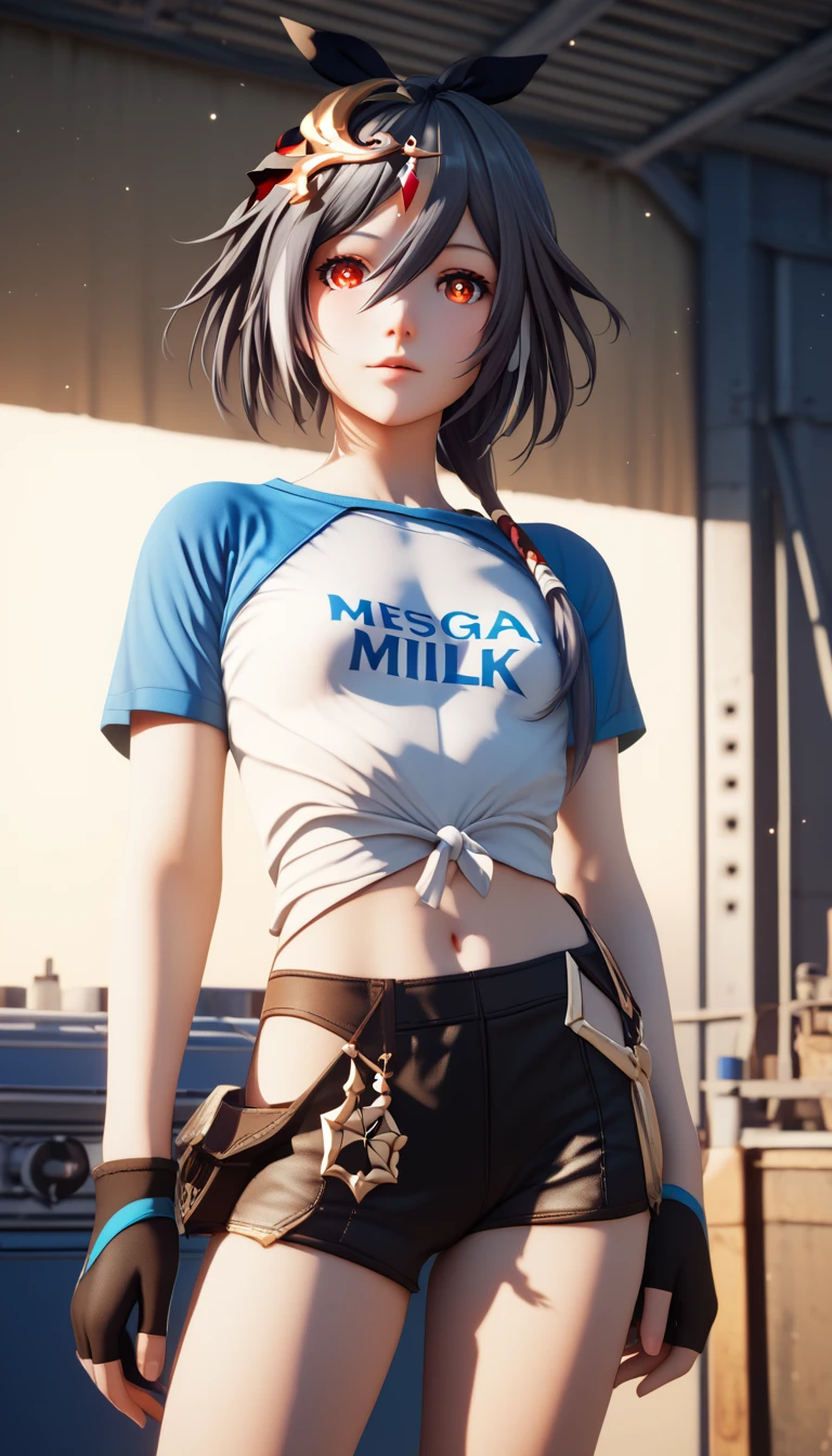 Swimsuit Outfit: Senti_Swimsuit, long hair, black hair, red eyes, hair between eyes, black thighhighs, single thighhigh, white shirt, gloves, navel cutout, fingerless gloves, goggles, blue headwear, goggles around neck,