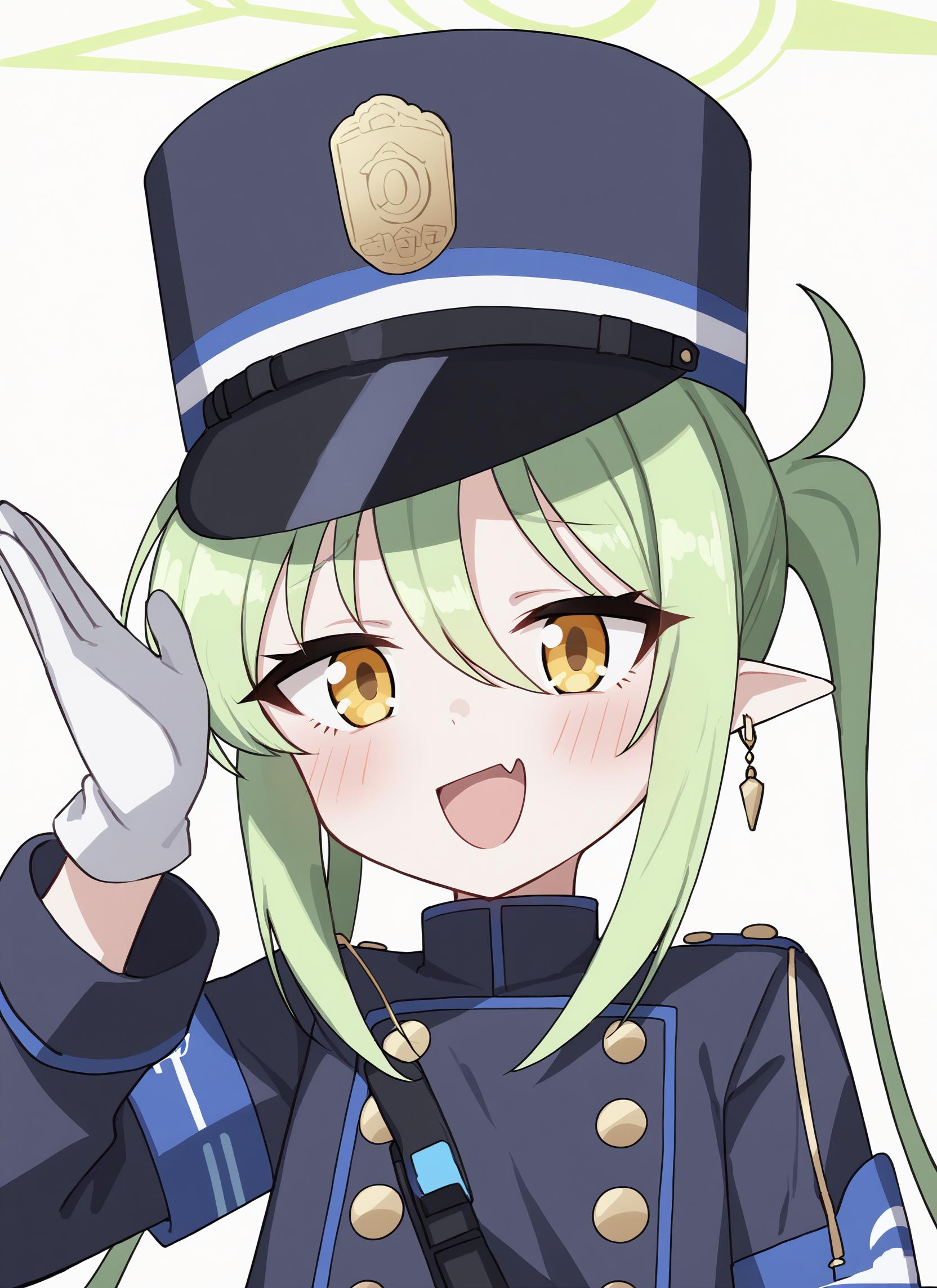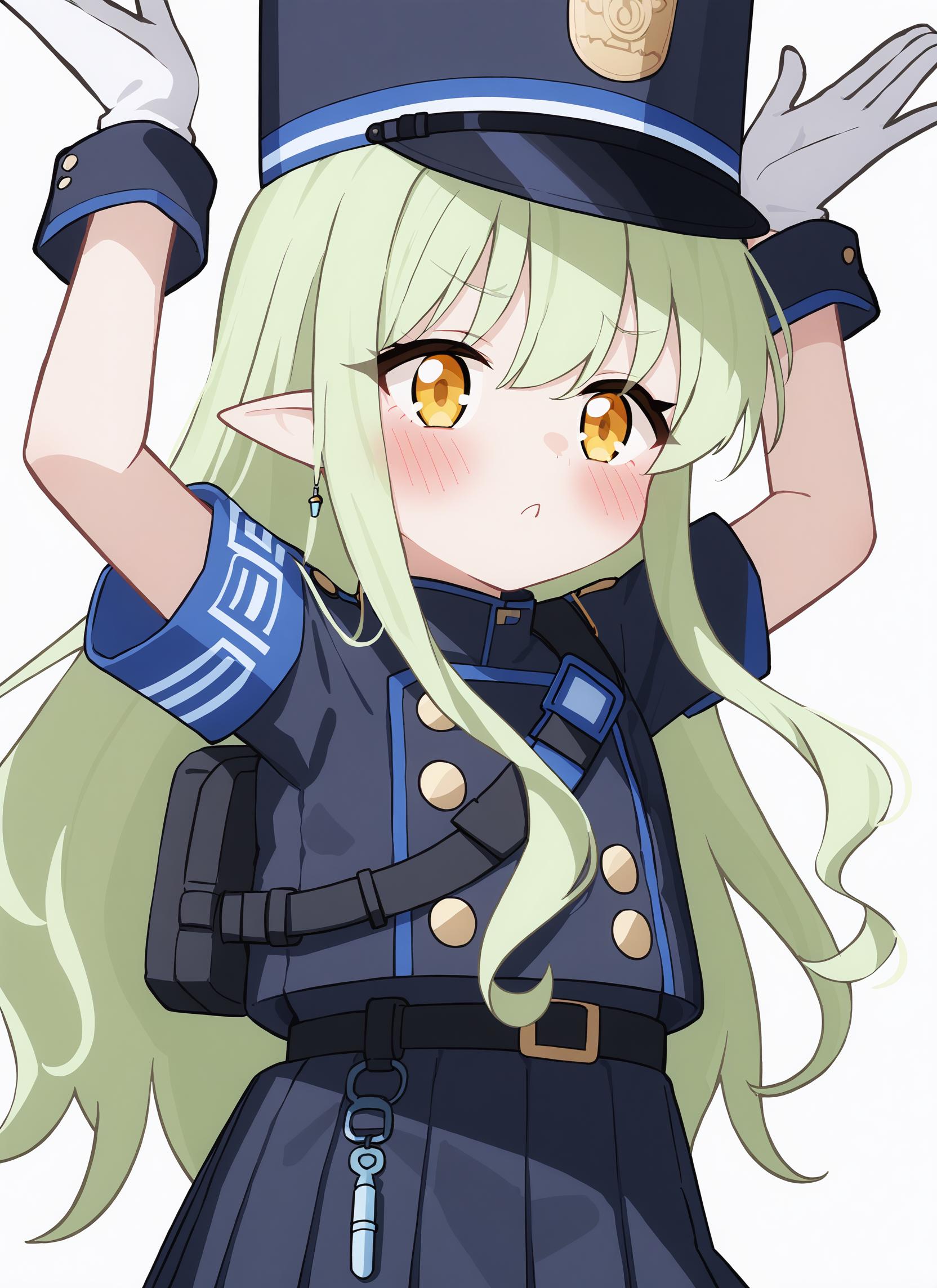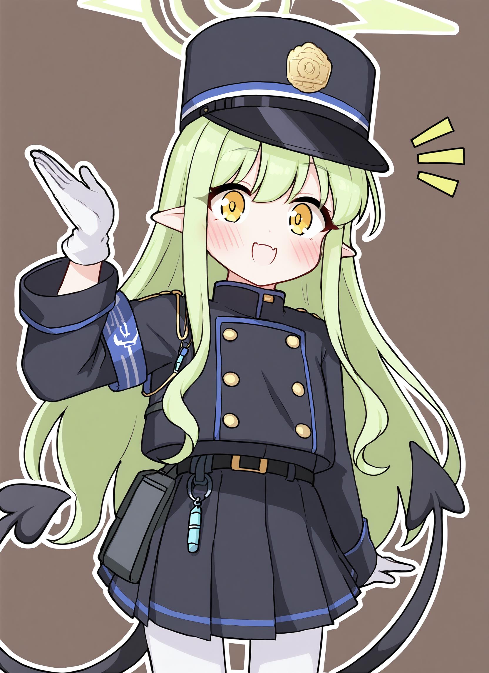 outfit tags: blue headwear, uniform, pleated skirt, white pantyhose, white gloves