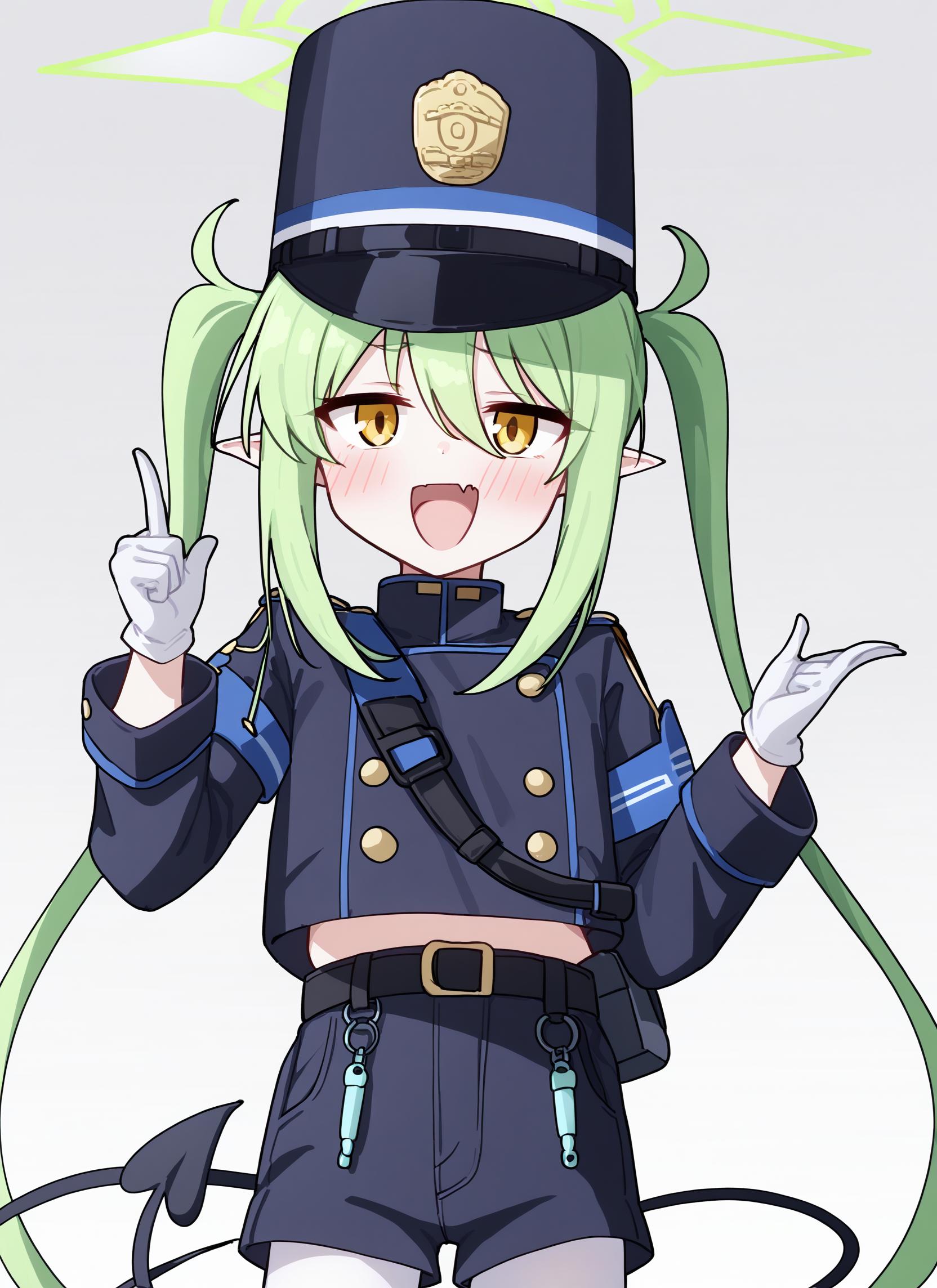 traits tags: long hair, twintails, halo, smug, demon tail, green hair