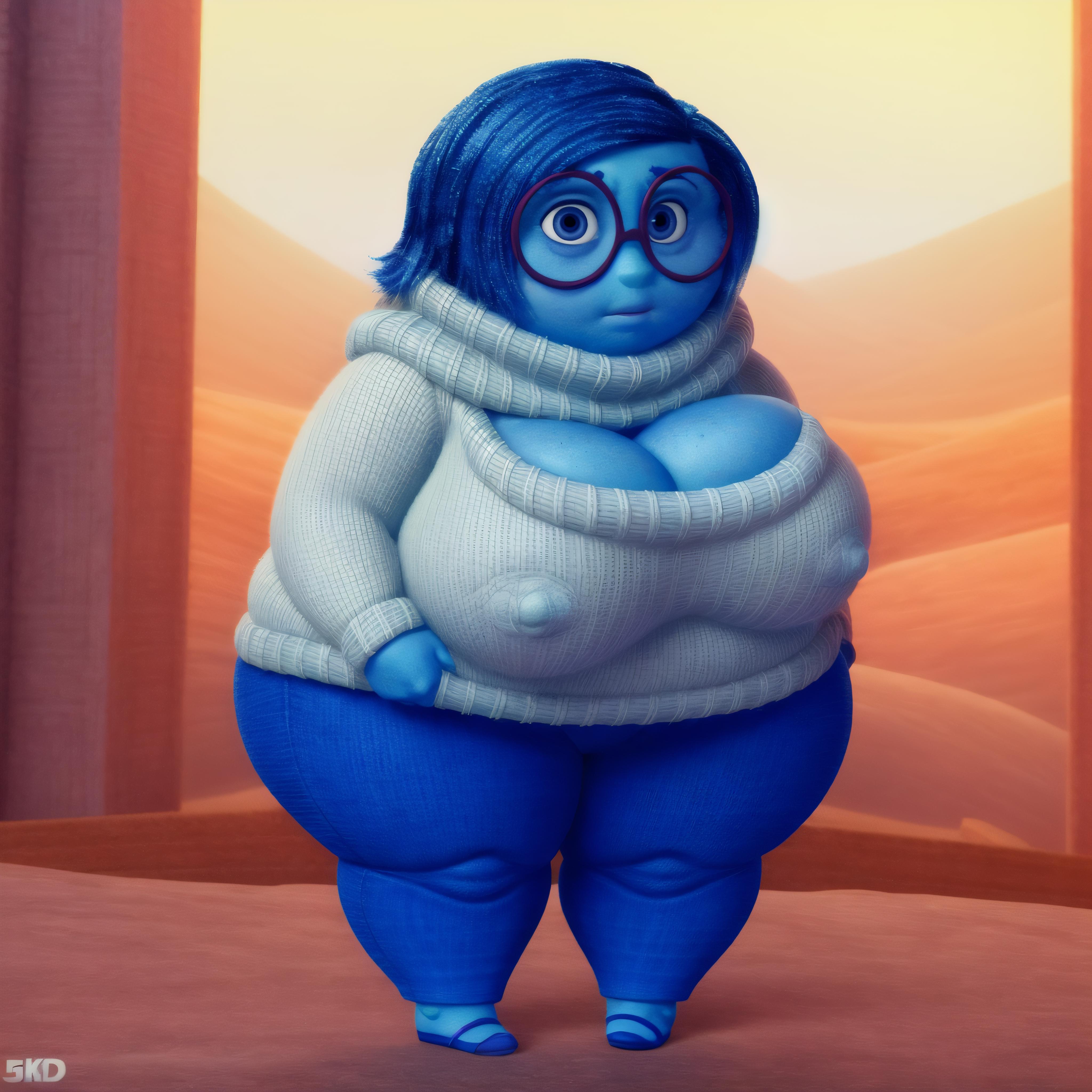 small, overweight, female character, turtle neck white top, blue pants, blue slippers, large round glasses, blue hair, blue skin