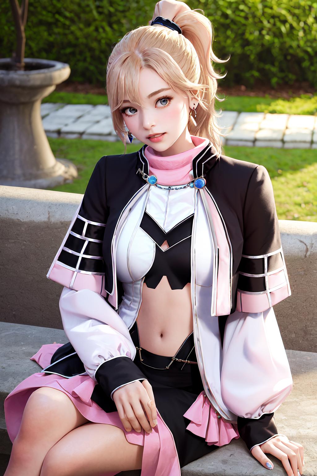 Default outfit: pink turtleneck black capelet white shirt jewelry white sleeves long sleeves navel cutout black skirt pink frills