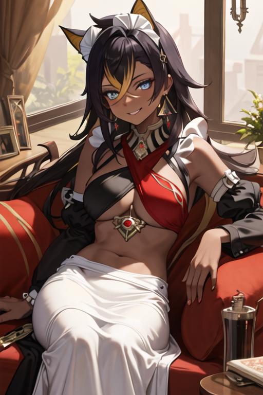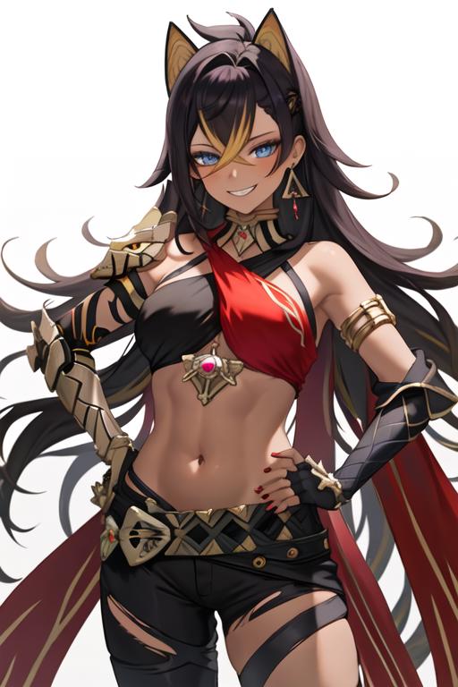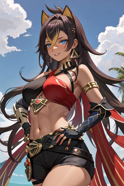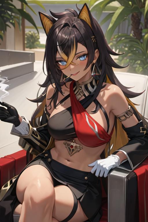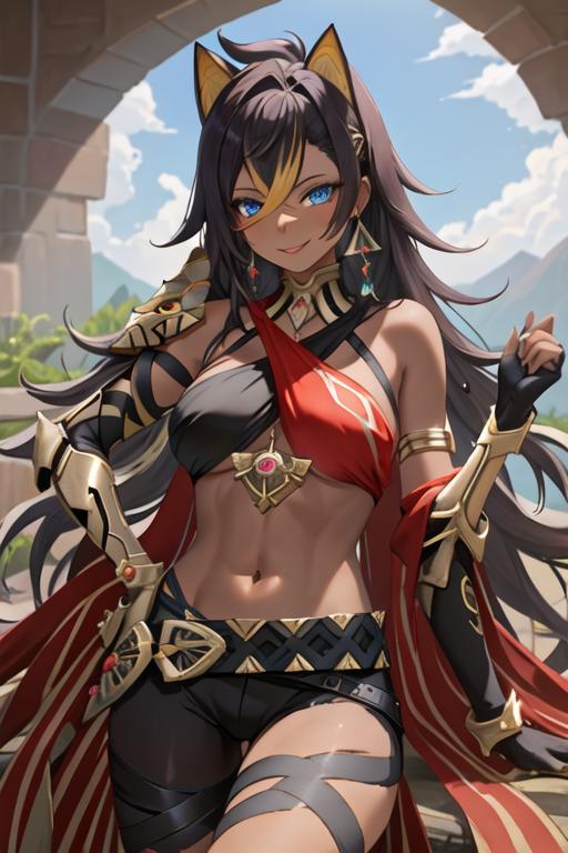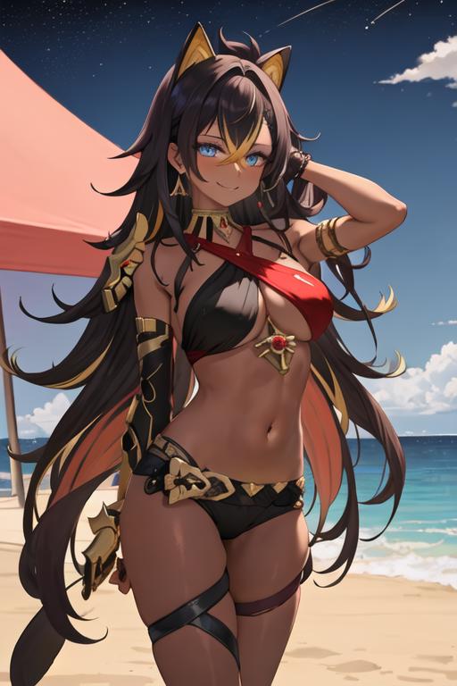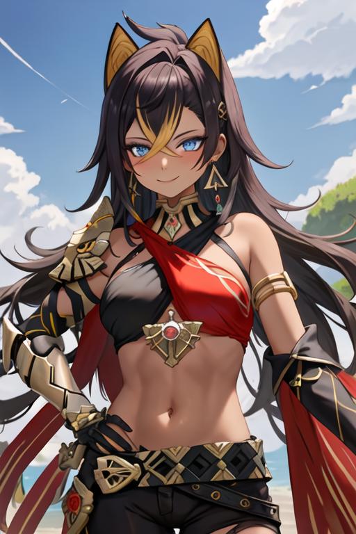The trigger word is dehya_genshin, and the recommended tags are best quality, masterpiece, highres, solo, {dehya_genshin:1.15}, multicolored_hair, long_hair, bangs, blue_eyes, streaked_hair, dark-skinned_female, dark_skin, blonde_hair, black_hair, hair_between_eyes, jewelry, crossed_bangs, halterneck, earrings, animal_ears, breasts, criss-cross_halter, smile, brown_hair, navel, stomach, large_breasts, hair_intakes.