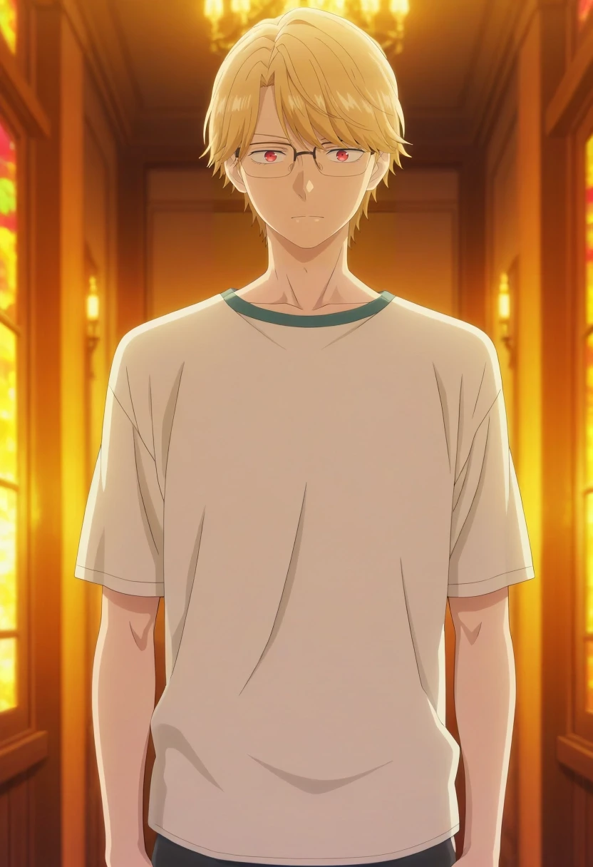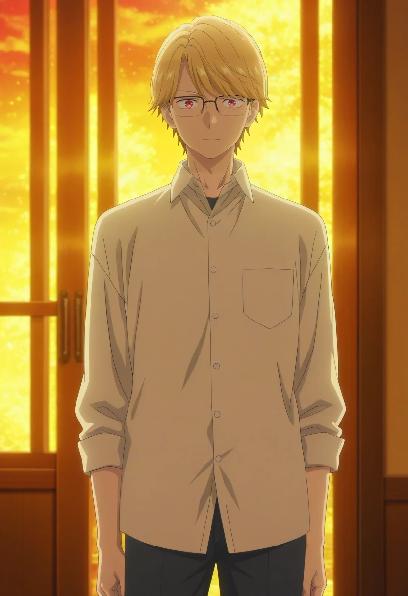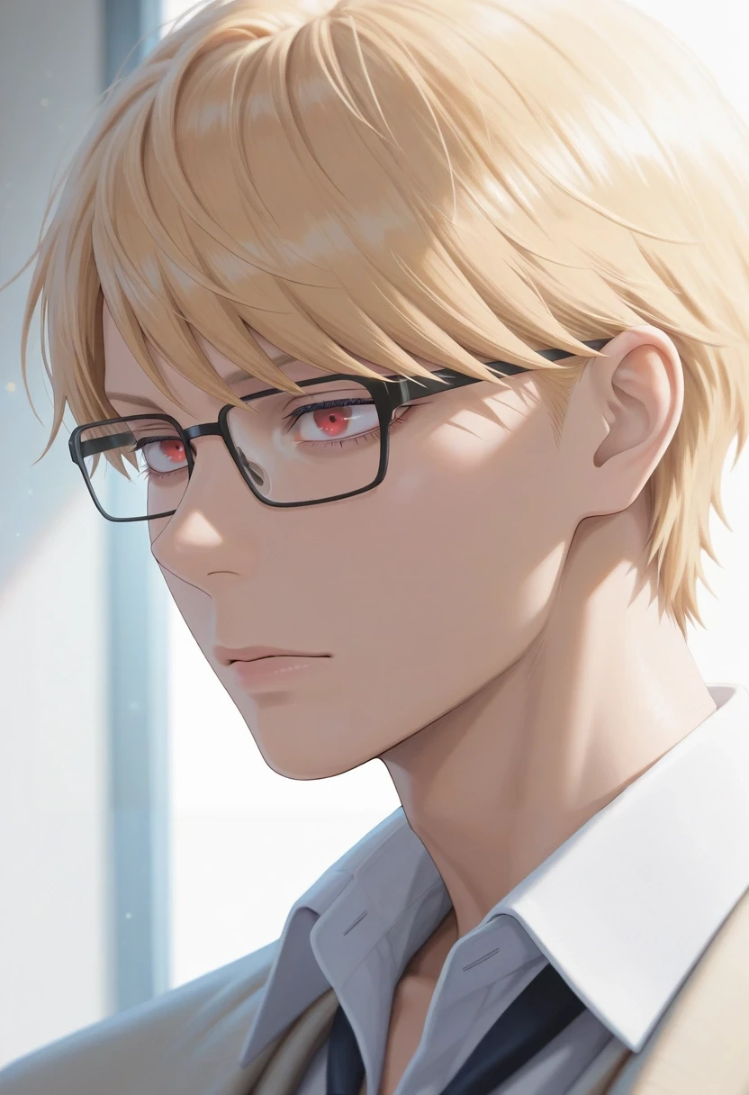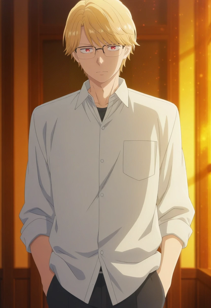eita_sasaki, blonde hair, red eyes, short hair, bangs