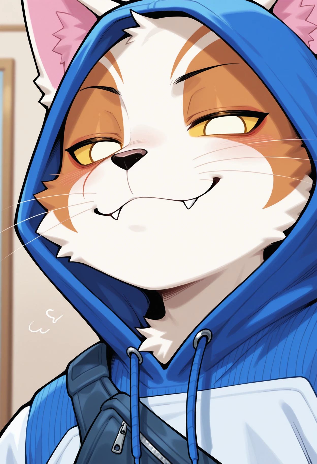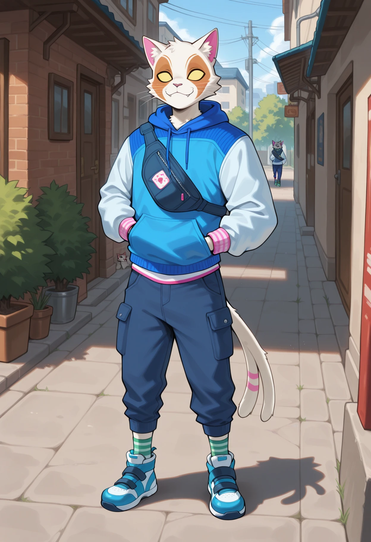 Keyword: Nyanja, no pupils, yellow eyes, hood up, hooded sweater, blue pants,shoes, socks, tail, green fannypack, mechanical hand,