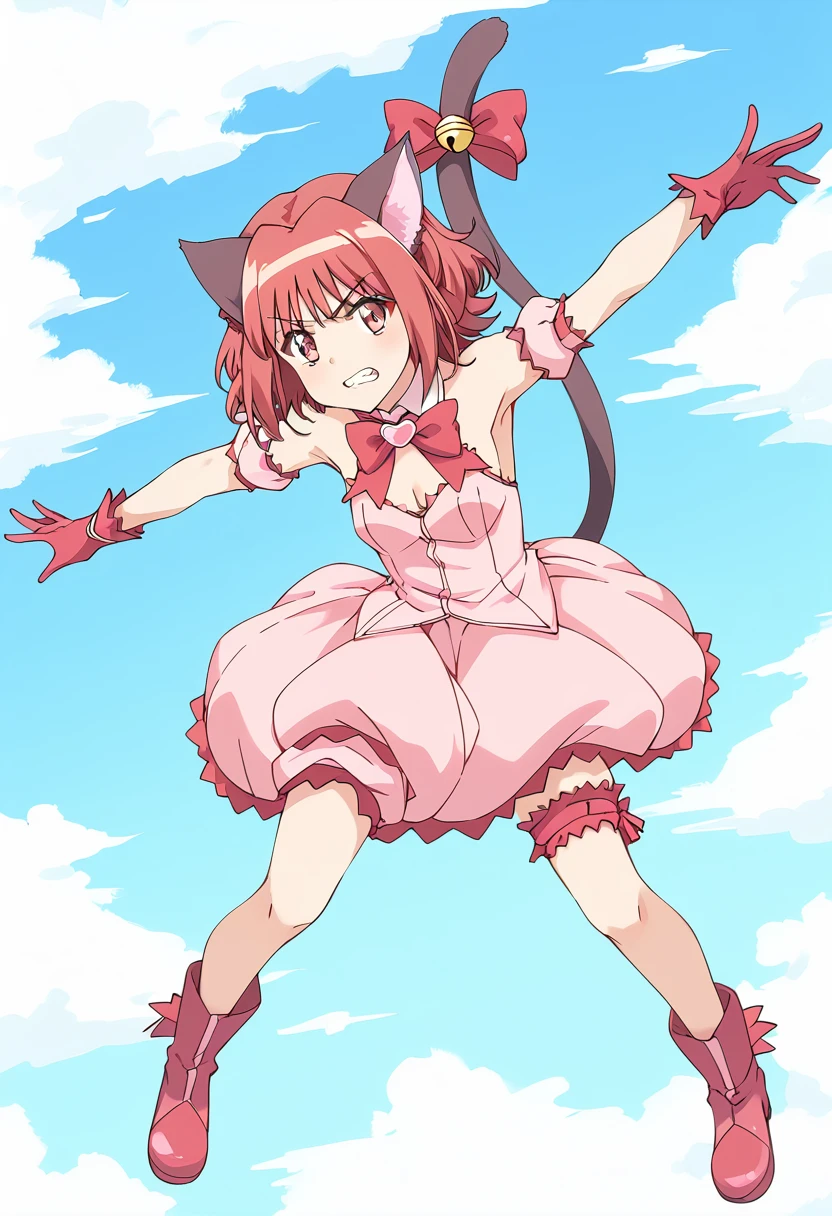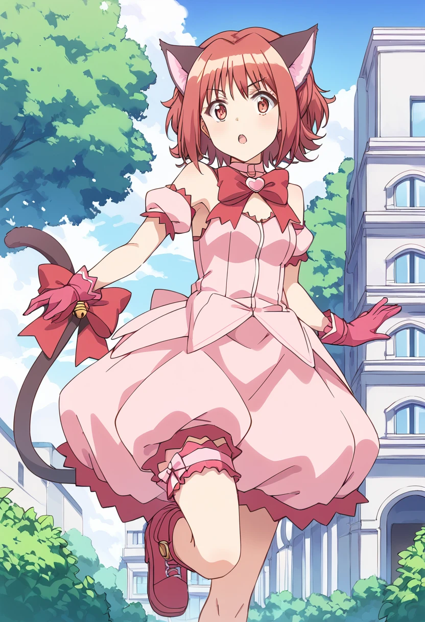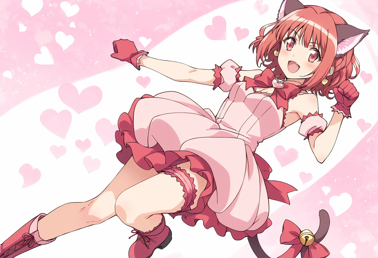 mew ichigo, short hair, pink hair, red hair, pink eyes, red eyes, eyelashes, eyebrows visible through hair, cat ears, fang, pink dress, frills, puffy detached sleeves, detached sleeves, puffy short sleeves, arm garter, bubble skirt, bare shoulders, pink bow, red bow, pink choker, bowtie, red neckwear, detached collar, brooch, red gloves, pink gloves, cat tail, tail bell, tail bow, red footwear, pink footwear, knee boots