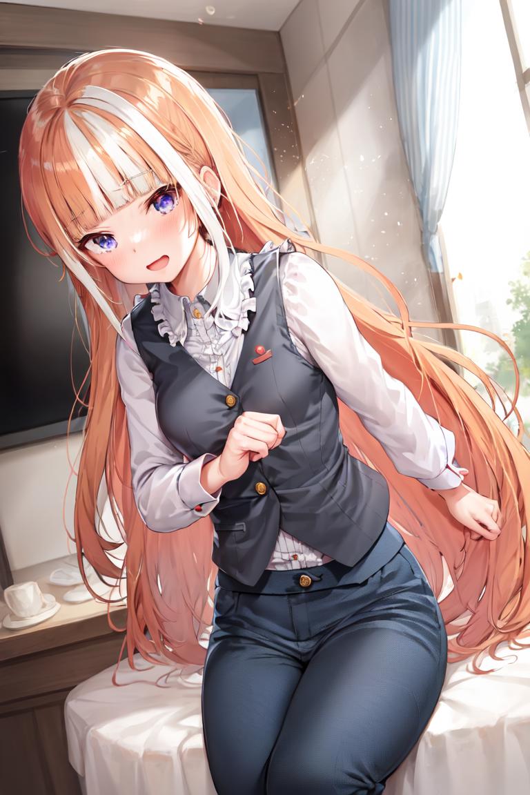 dress shirt, white shirt, collared shirt, frilled shirt collar, long sleeves, black vest, buttons, blue pants, black footwear, shoes