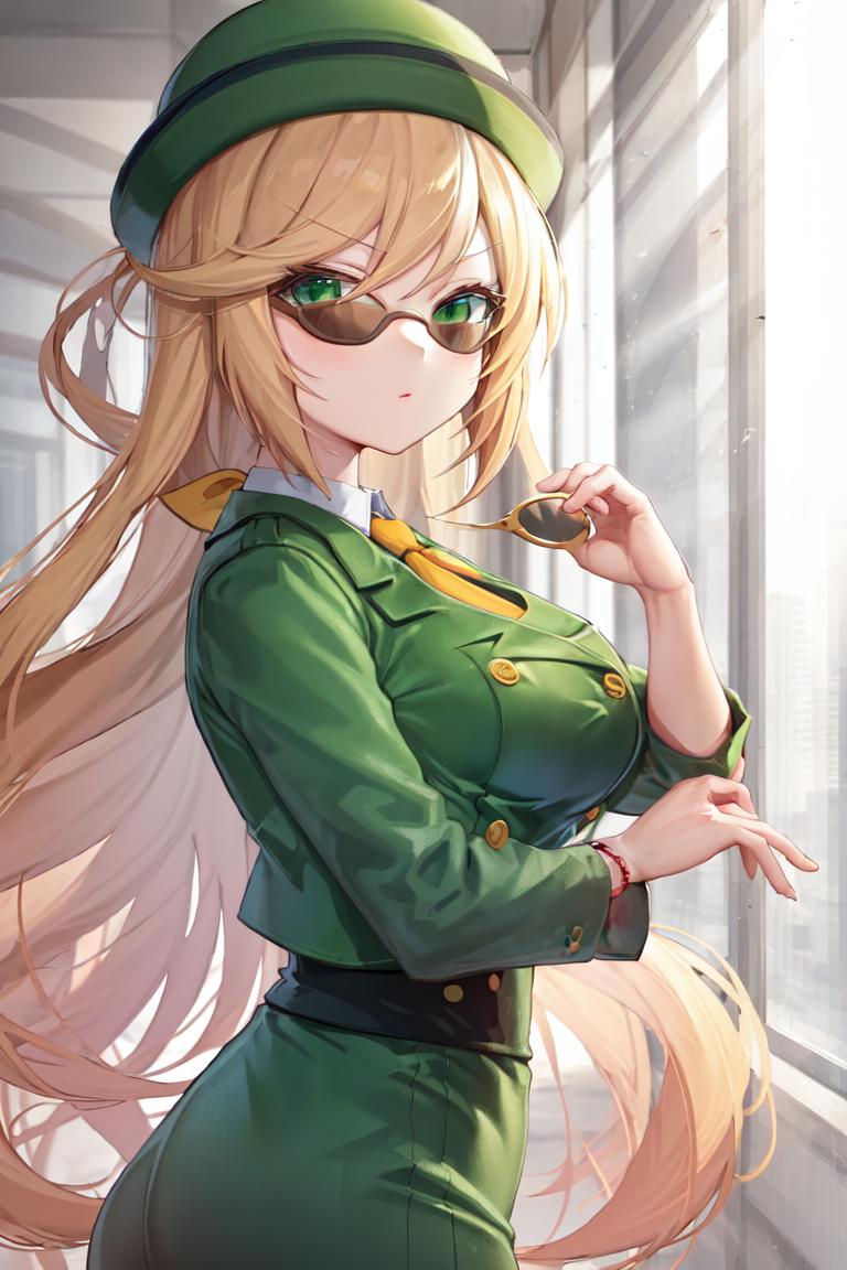 green headwear, bowler hat, hair ribbon, yellow necktie, wristwatch, formal, long sleeves, collared shirt, green jacket, buttons, double-breasted, green skirt, skirt suit, pencil skirt, black pantyhose, shoes, green footwear