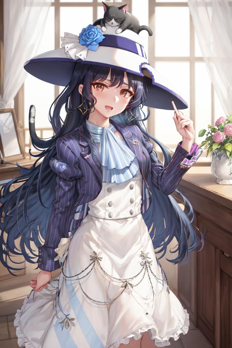 cat on head, sun hat, white headwear, hat flower, blue rose, vertical stripes, striped ascot, vertical-striped shirt, open clothes, open jacket, blue jacket, cropped jacket, puffy long sleeves, buttons, high-waist dress, white dress, socks, shoes, blue footwear