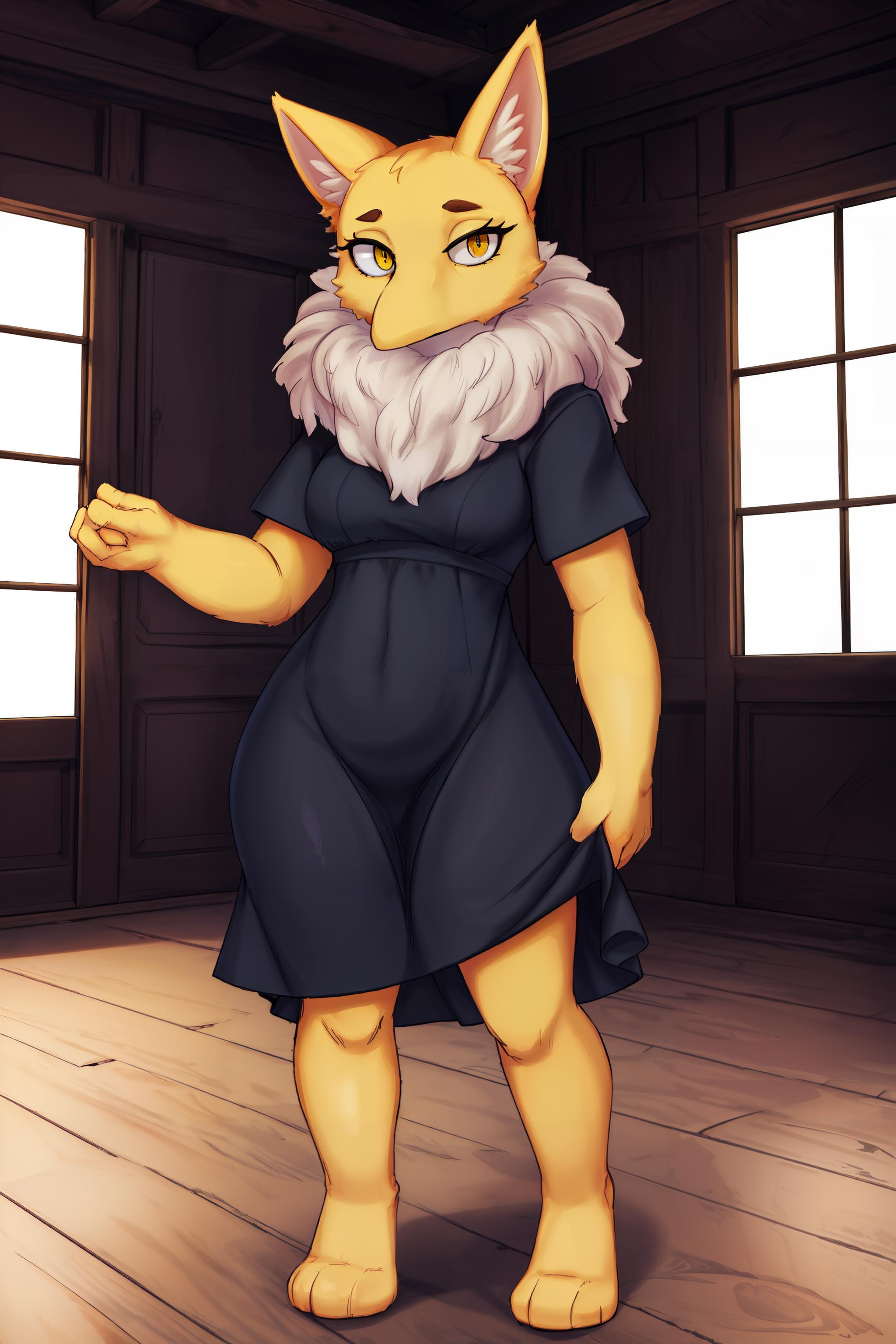 hypno, anthro, yellow body, pointed ears, long nose, white fur, fur collar, slit pupils