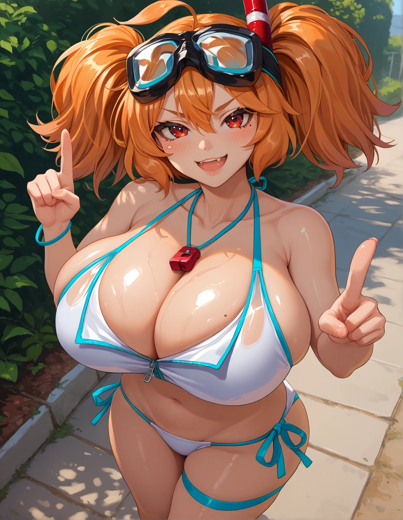 "cerbswm, between breasts, orange hair, ahoge, swimsuit, side-tie bikini bottom, huge breasts, red eyes, mole under eye, whistle around neck, skindentation, two side up, lifebuoy hair ornament, cyan thigh strap, white sports bra, zipper,goggles on head"