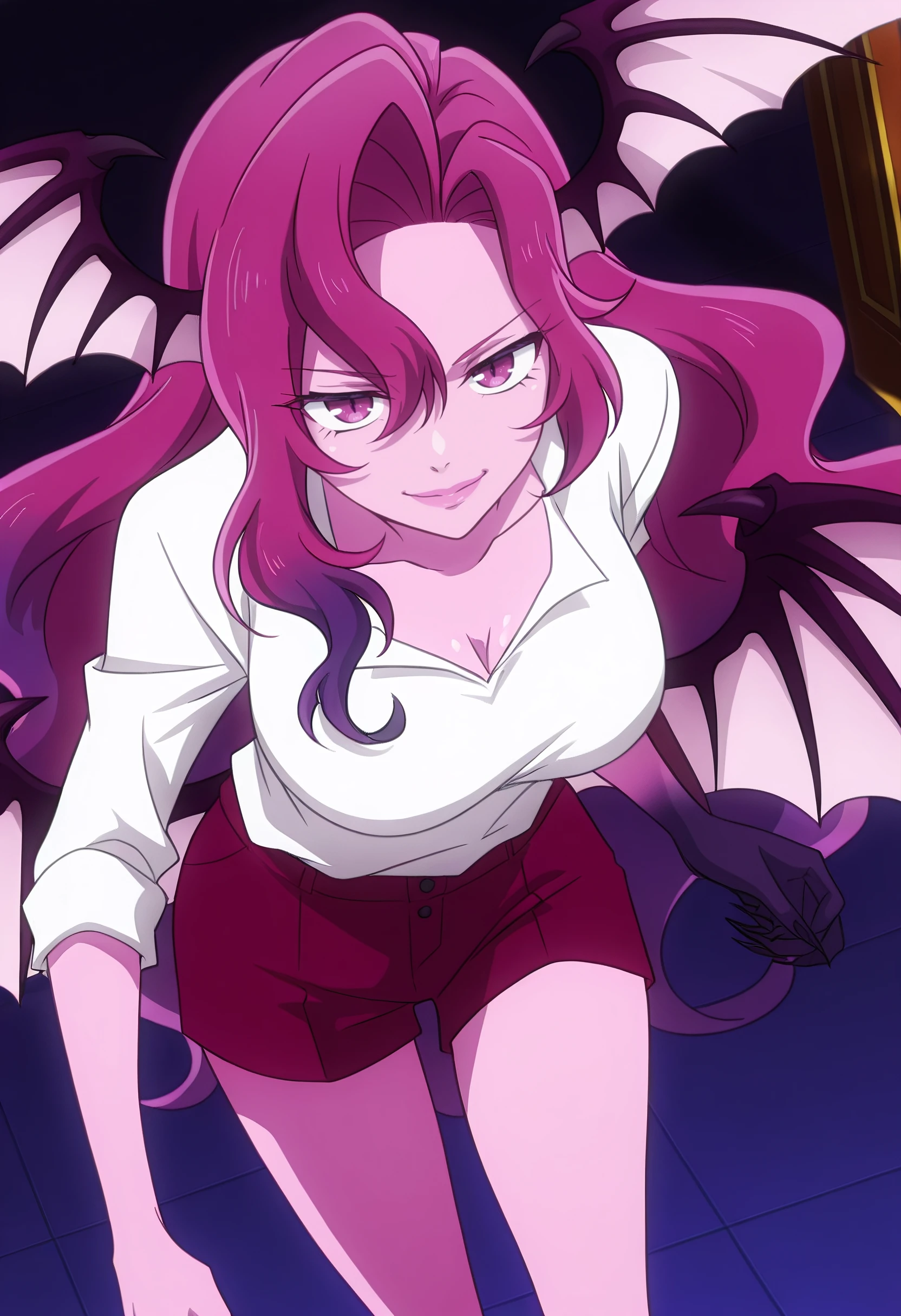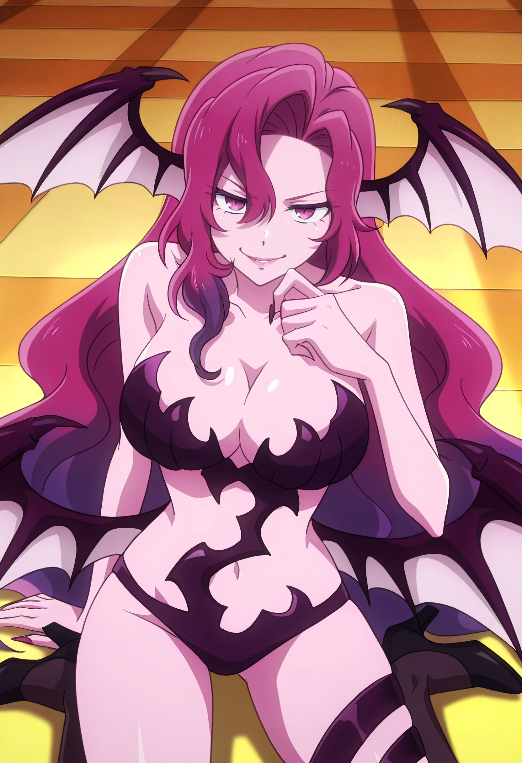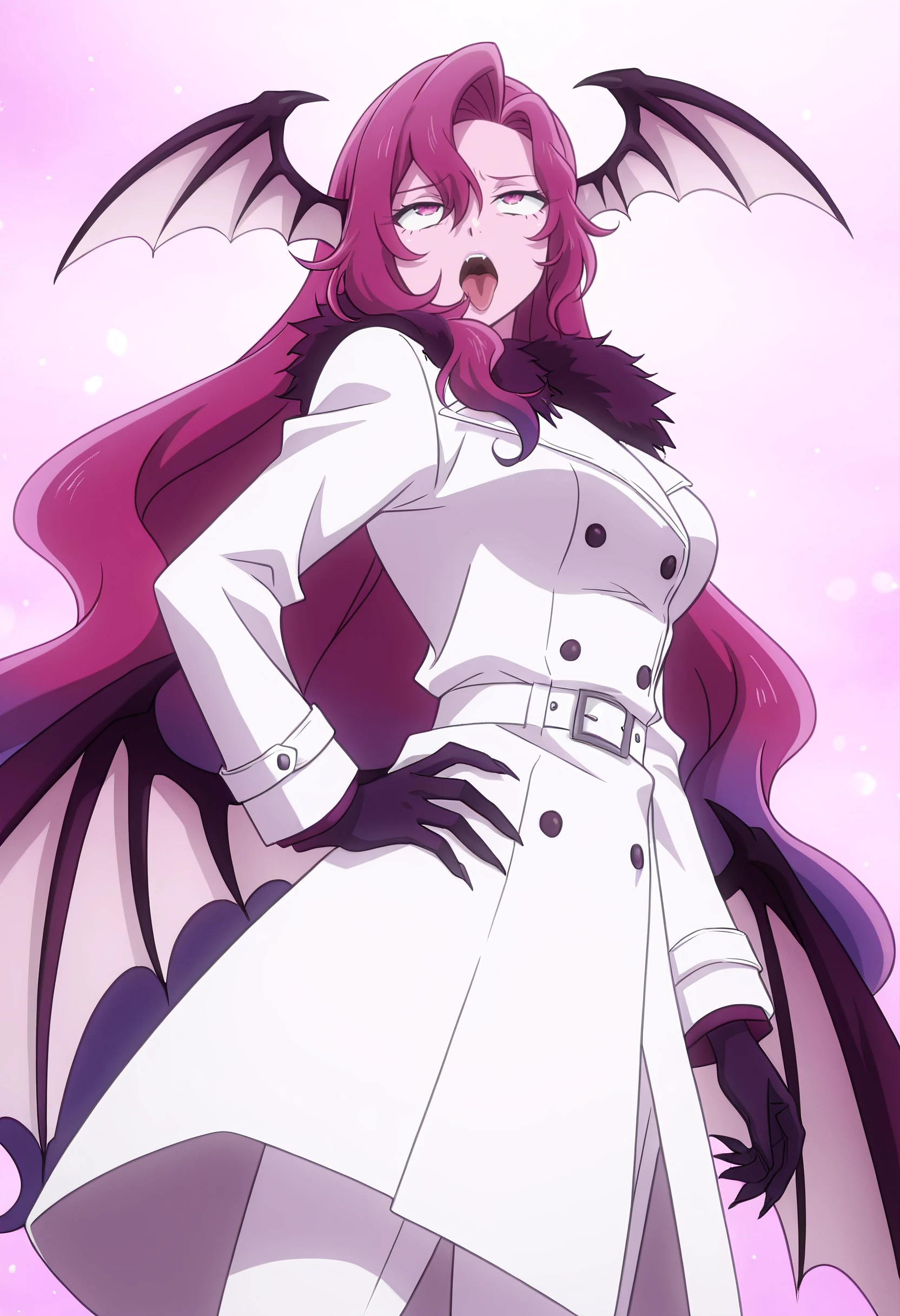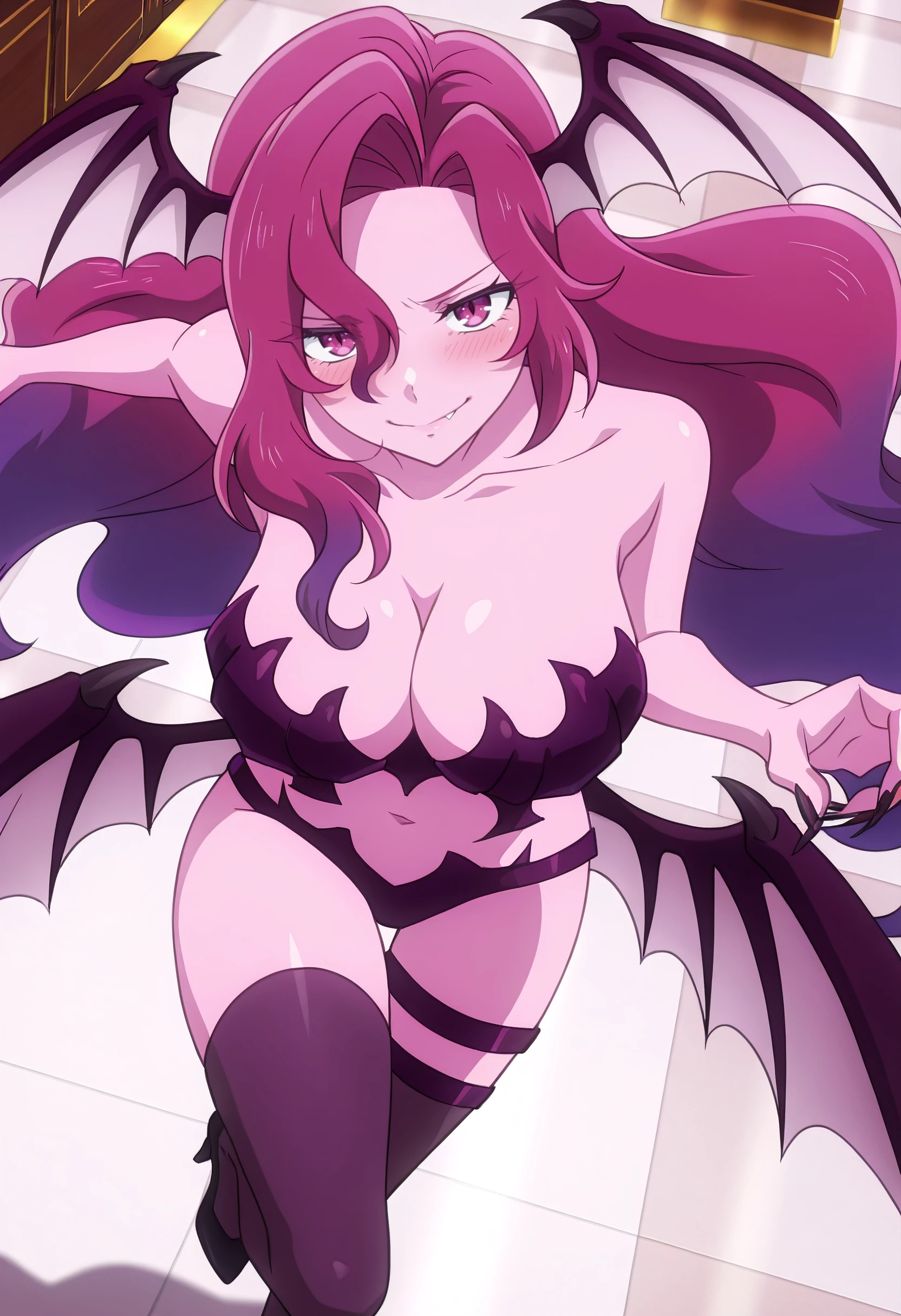 KYTYulia, long hair, pink hair, demon girl, monster girl, pink eyes, very long hair, gradient hair, multicolored hair, purple hair, hair intakes, wavy hair, wings, head wings, demon wings, colored skin, purple skin, claws, low wings, multiple wings,