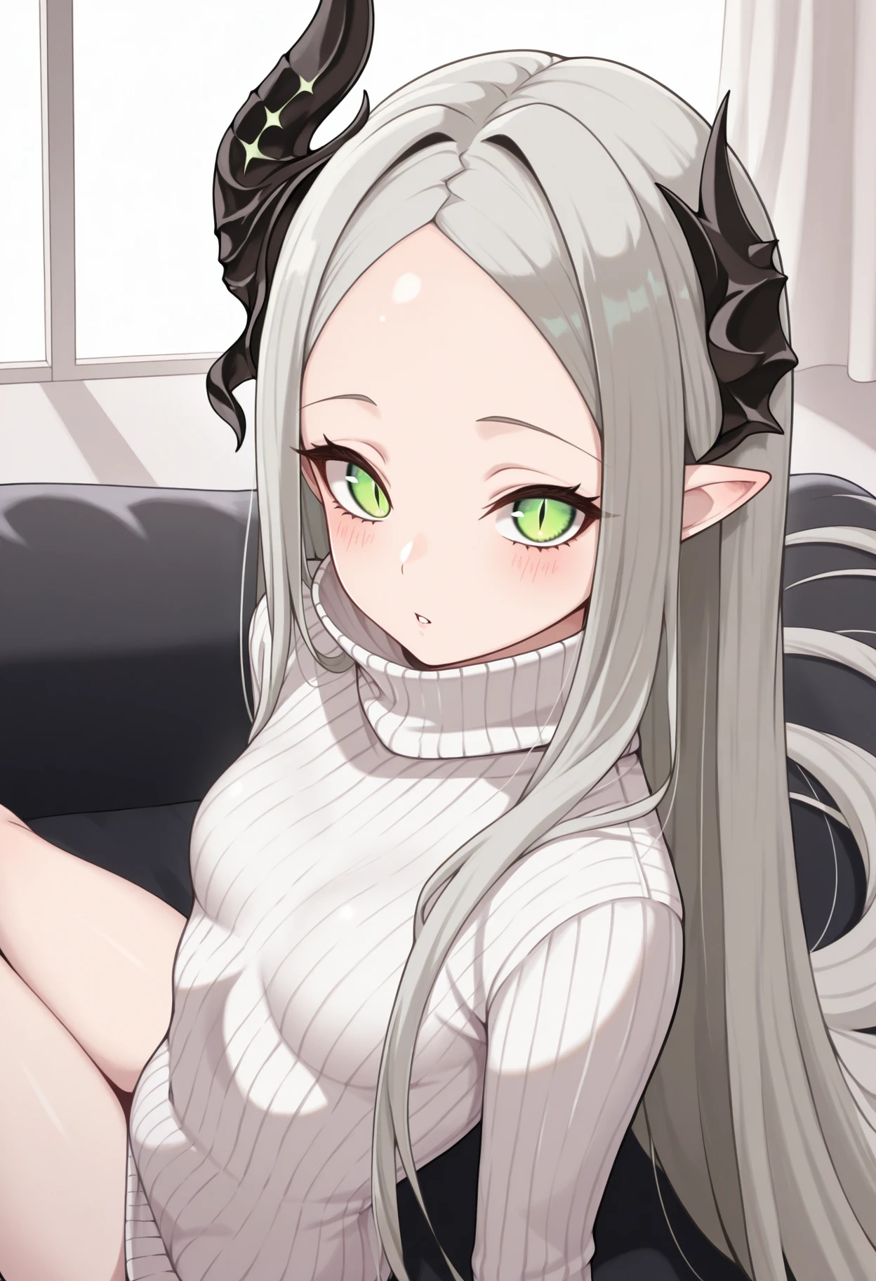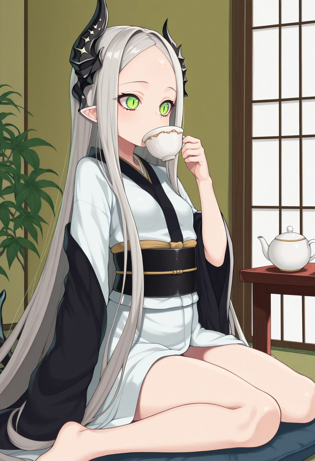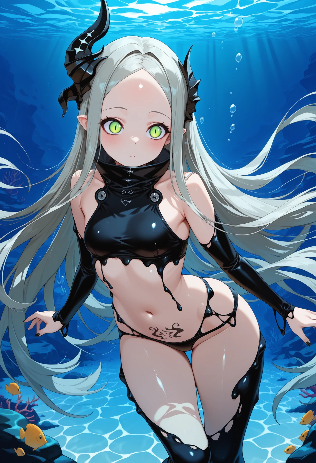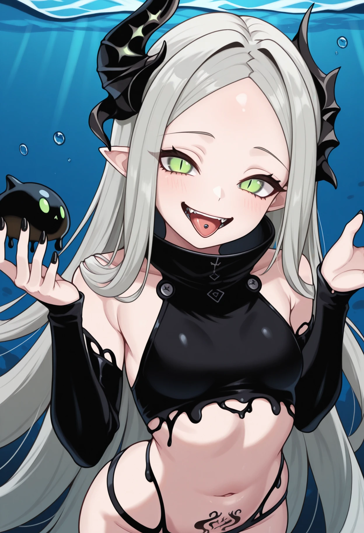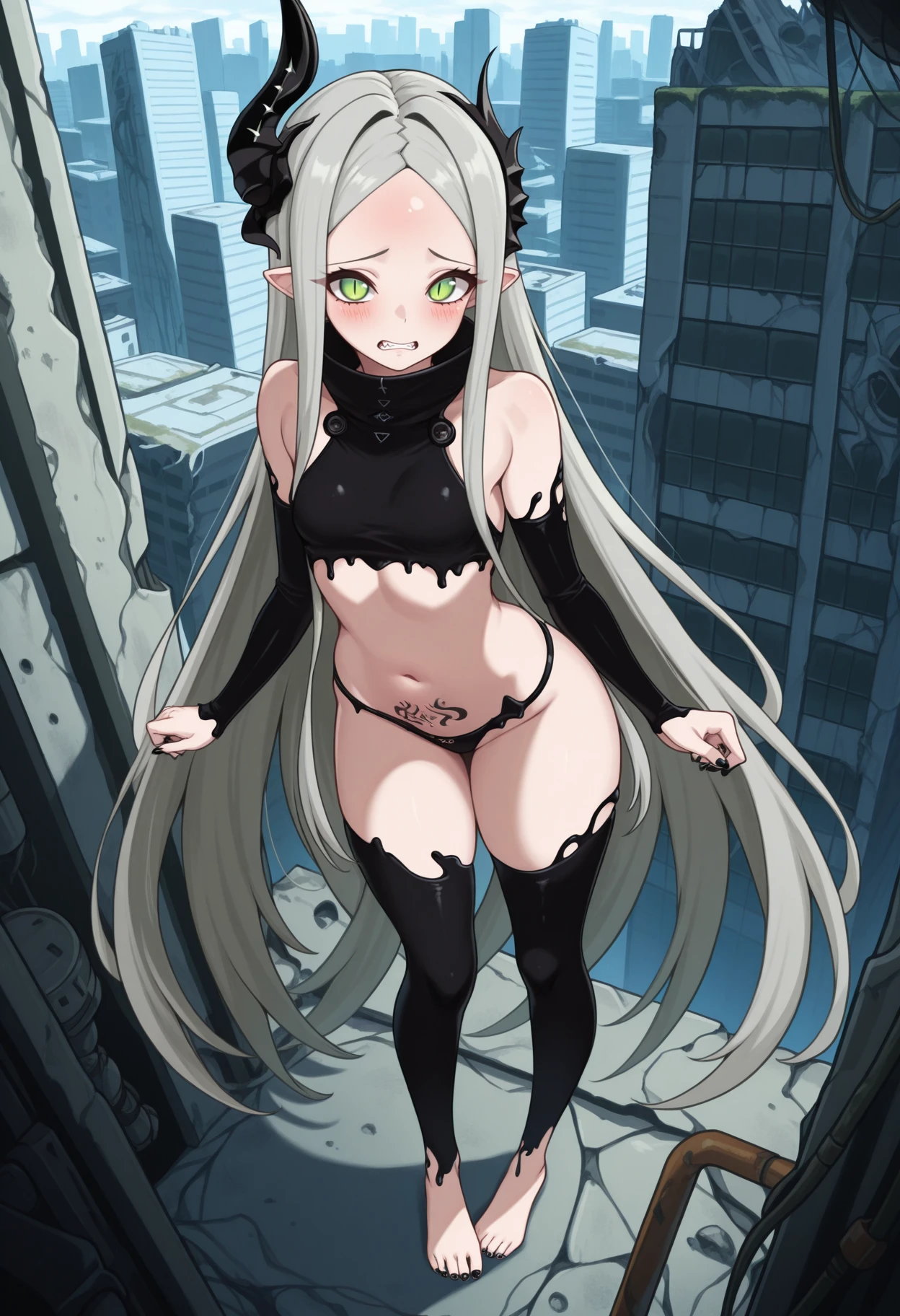 levia, green eyes, slit pupils, grey hair, very long hair, parted bangs, pointy ears, asymmetrical horns, forehead, small breasts, crop top, detached sleeves, navel, pubic tattoo, black panties, black nails