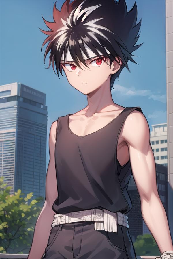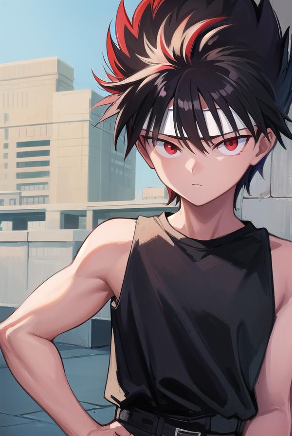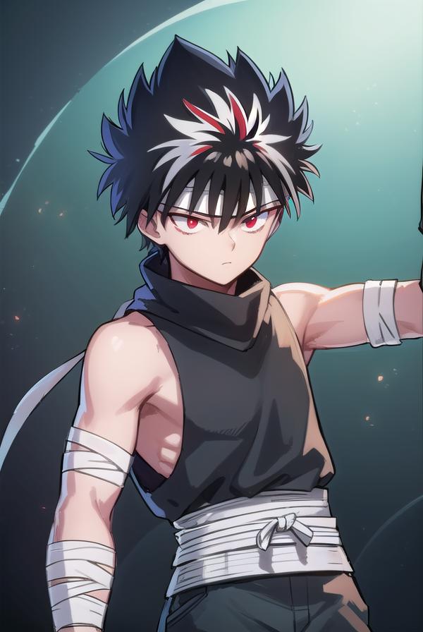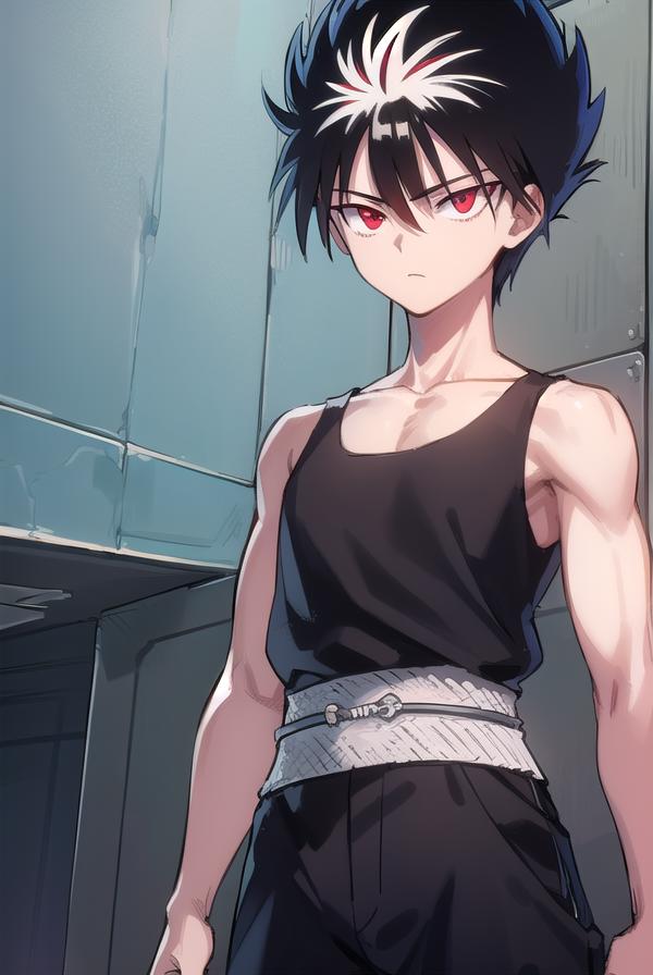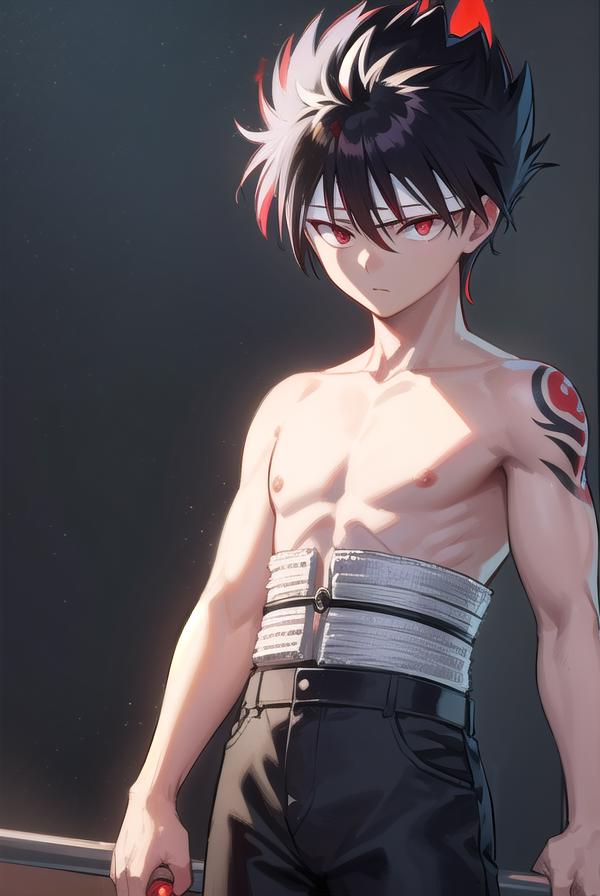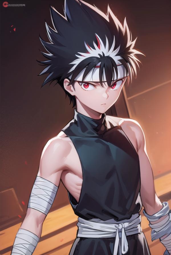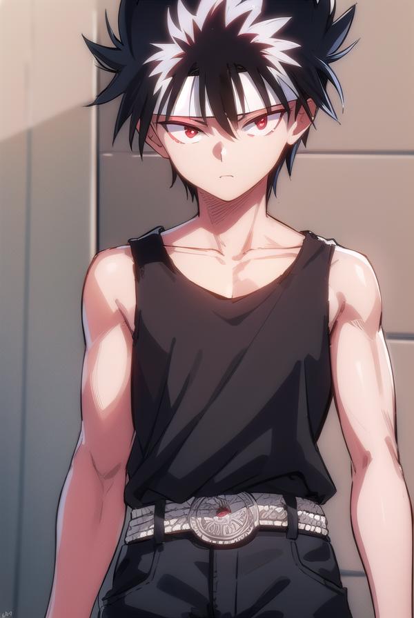 hiei, black hair, spiked hair, (red eyes:1.5), headband,