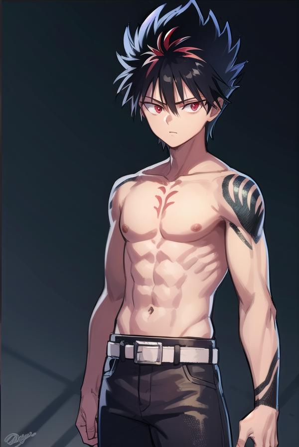 belt, pants, black pants, topless, tattoo, (dragon tattoo:1.2), arm tattoo, (black tattoo:1.2),