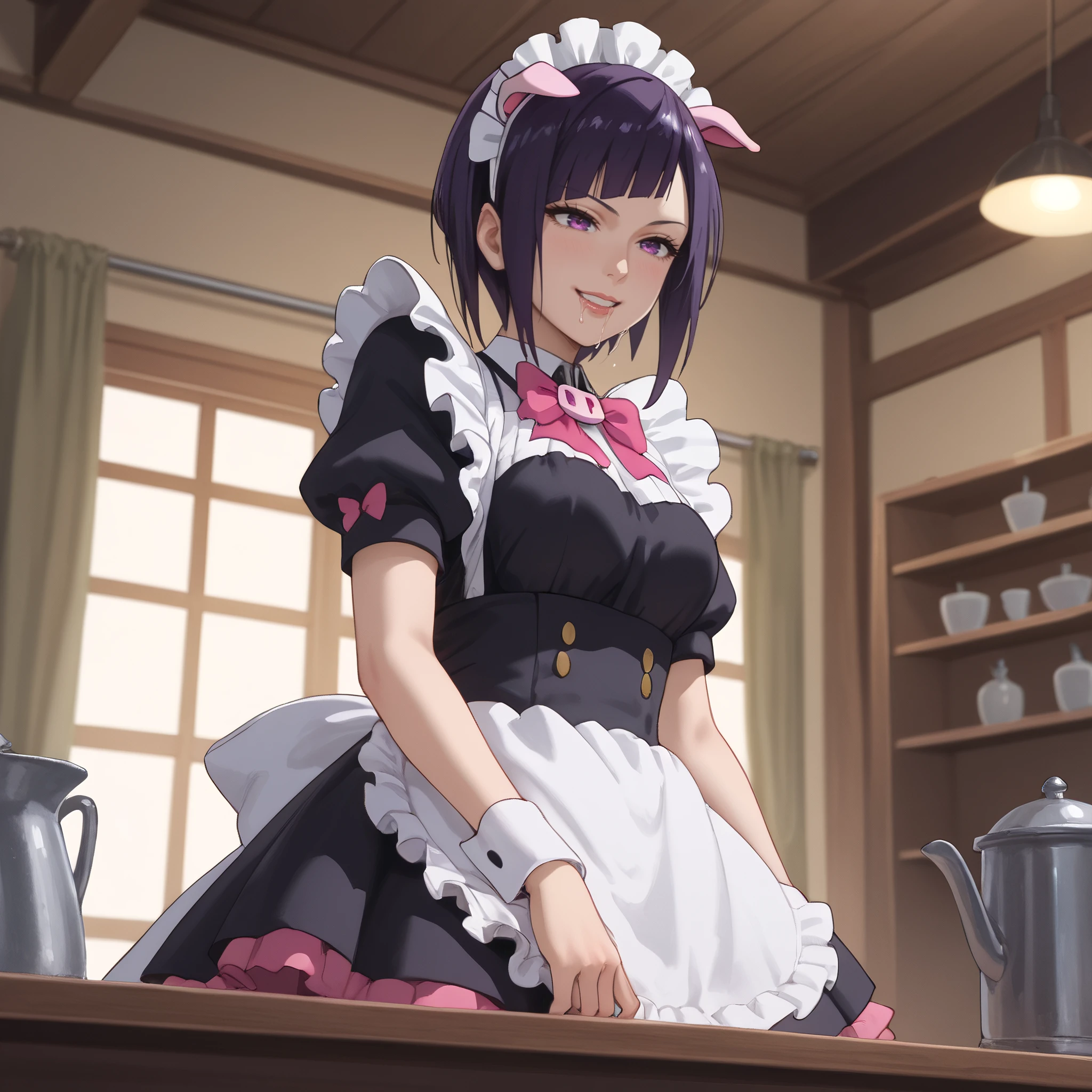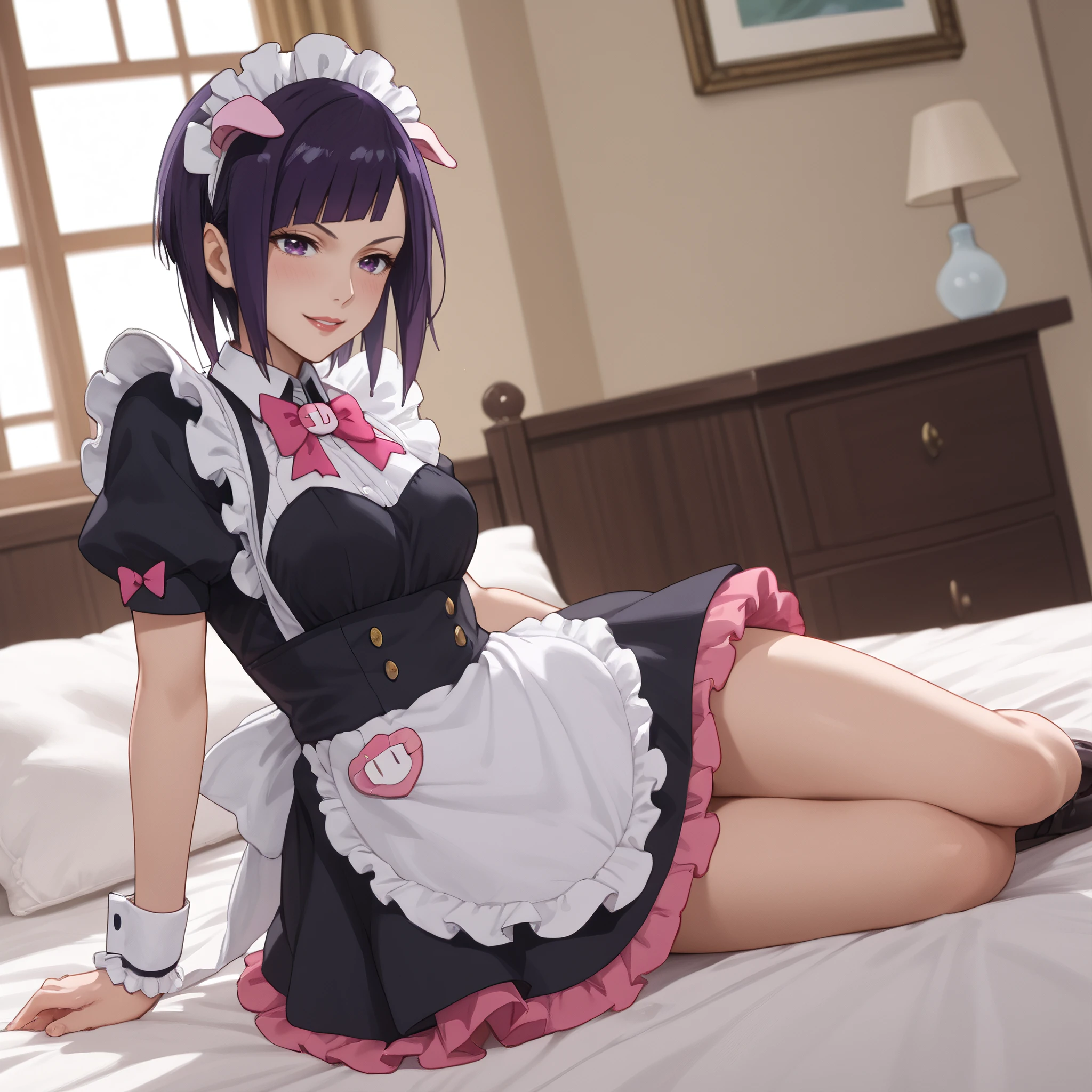 RankoMaid, maid, maid headdress, bow, apron, maid apron, enmaided, frills, pink bow, puffy sleeves, white apron, bowtie, dress, short sleeves, pink bowtie, wrist cuffs,